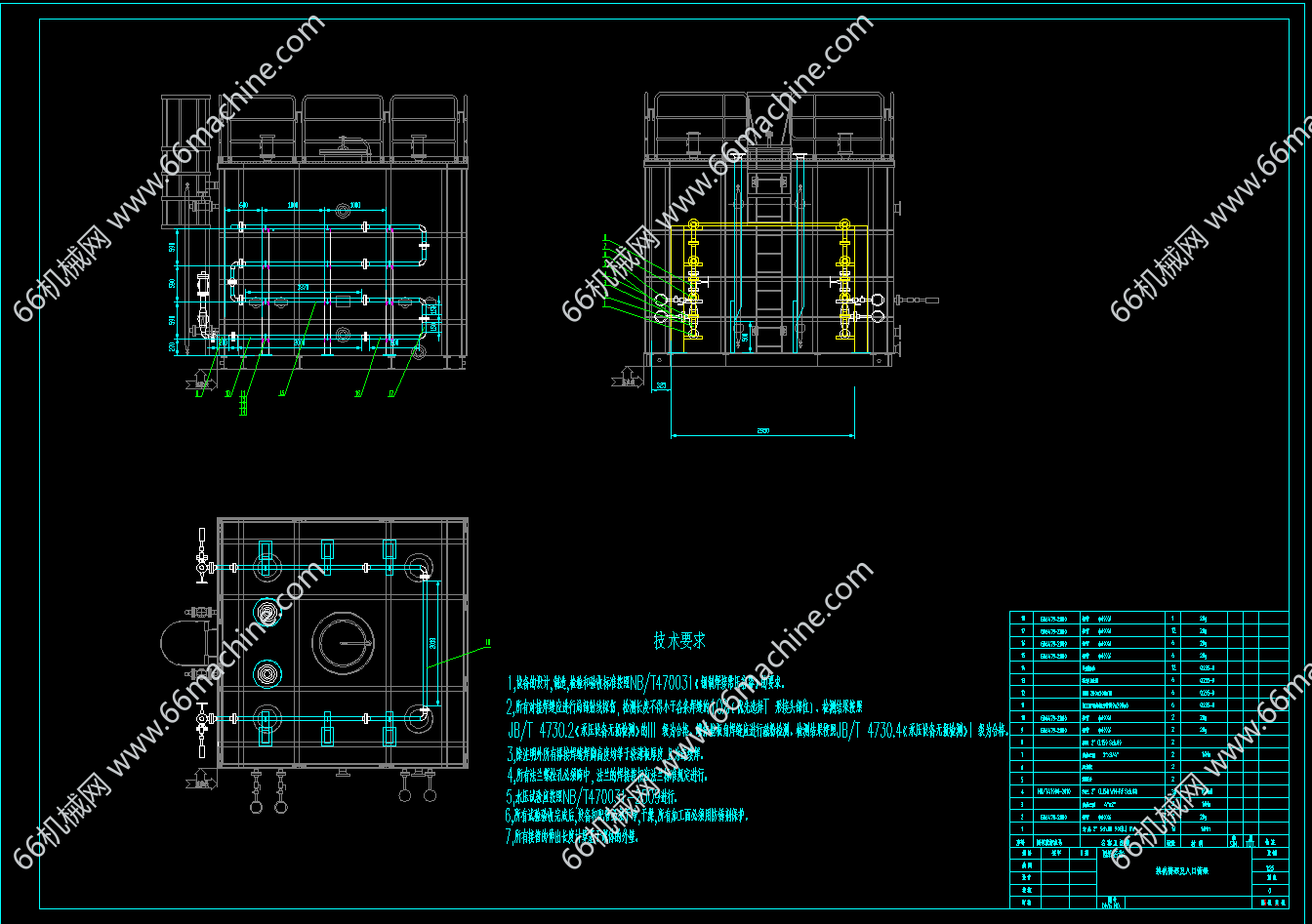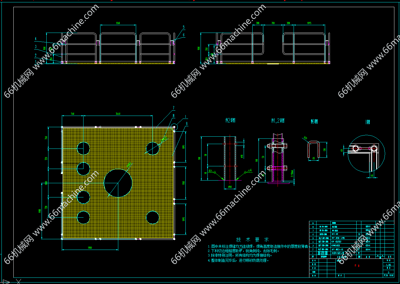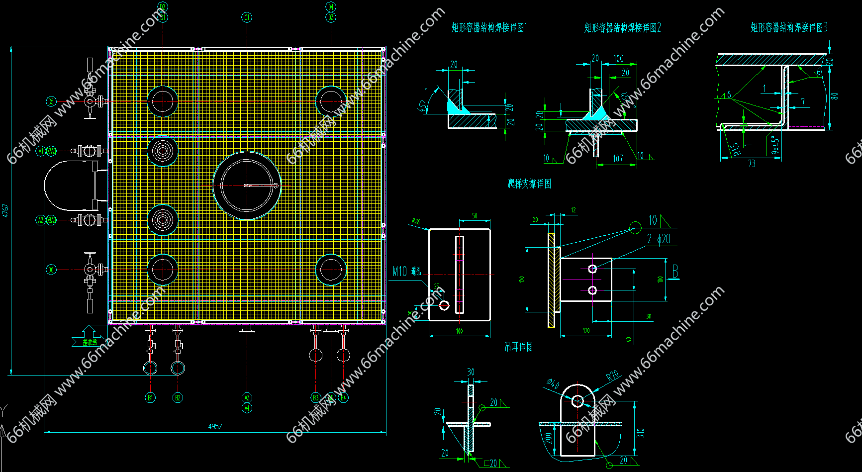罐橇常用于海上平台的液体缓冲以及贮存,设计压力为常压,设计温度为60℃,腐蚀余量为2mm,设计中考虑使用玻璃纤维含棉保温,整体结构稳定性较好。本图纸为矩形容器设计,属于海洋石油平台上比较常用的常压换热容器,用于在贮存设备的介质的换热以及缓冲的作用。本图纸标注清晰、完整,都配有技术要求等说明,为某企业专业人员设计,可供大家探讨学习!