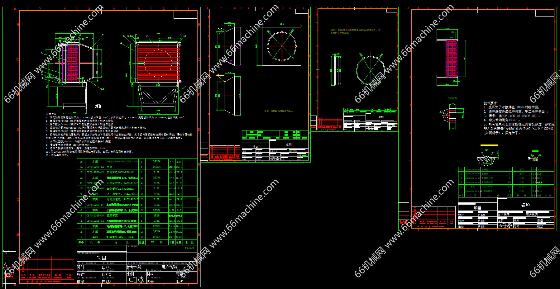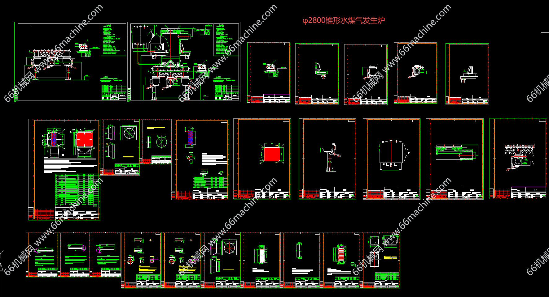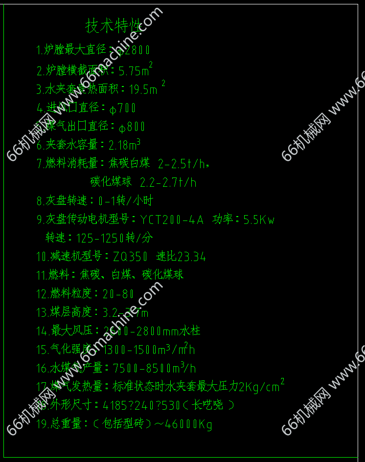 本图纸为直径2800锥形水煤气发生炉,包括有炉膛、炉衬、炉底、燃烧室、予热水套及鼓风装置,主要结构由水煤气发生装置、热量利用装置、焰温控制装置和机械密封干式炉底等部分组成,利用赤热的煤与过饱和水蒸汽作用而产生水煤气。炉体设计兼顾考虑了水煤气从发生到燃烧的各个环节,保证煤的充分气化和水煤气的完全燃烧,尤其克服了液封炉底的弊端,提高了热效率,结构简单,使用方便、安全,助燃效果好。比普通燃煤炉具节煤40%,造气快,除做饭、烹调外,还可供采暖、淋浴所用的热水,是比较理想的燃煤炉具。