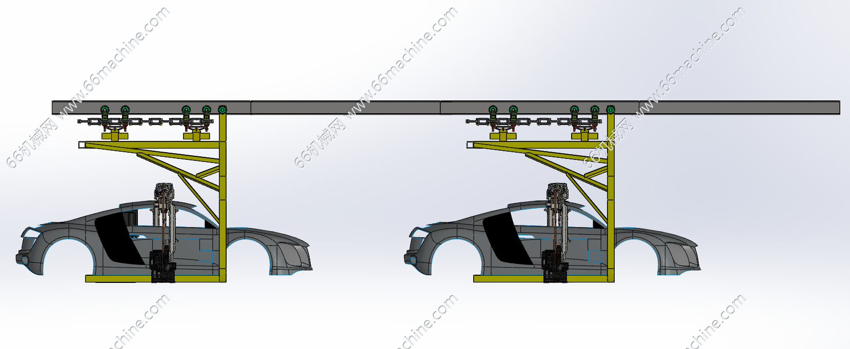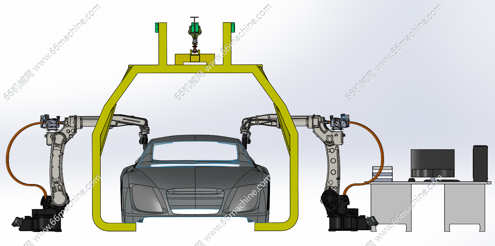 该生产线用于汽车车身的自动化焊接。多台机器人协同工作,对汽车车身进行精准焊接,上方的轨道系统辅助机器人调整作业位置,工作人员通过操作工位对焊接过程进行监控与管理,实现汽车车身焊接的自动化、标准化,提升焊接质量与生产效率。
