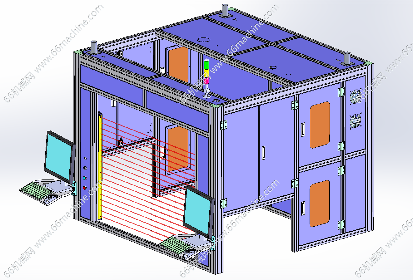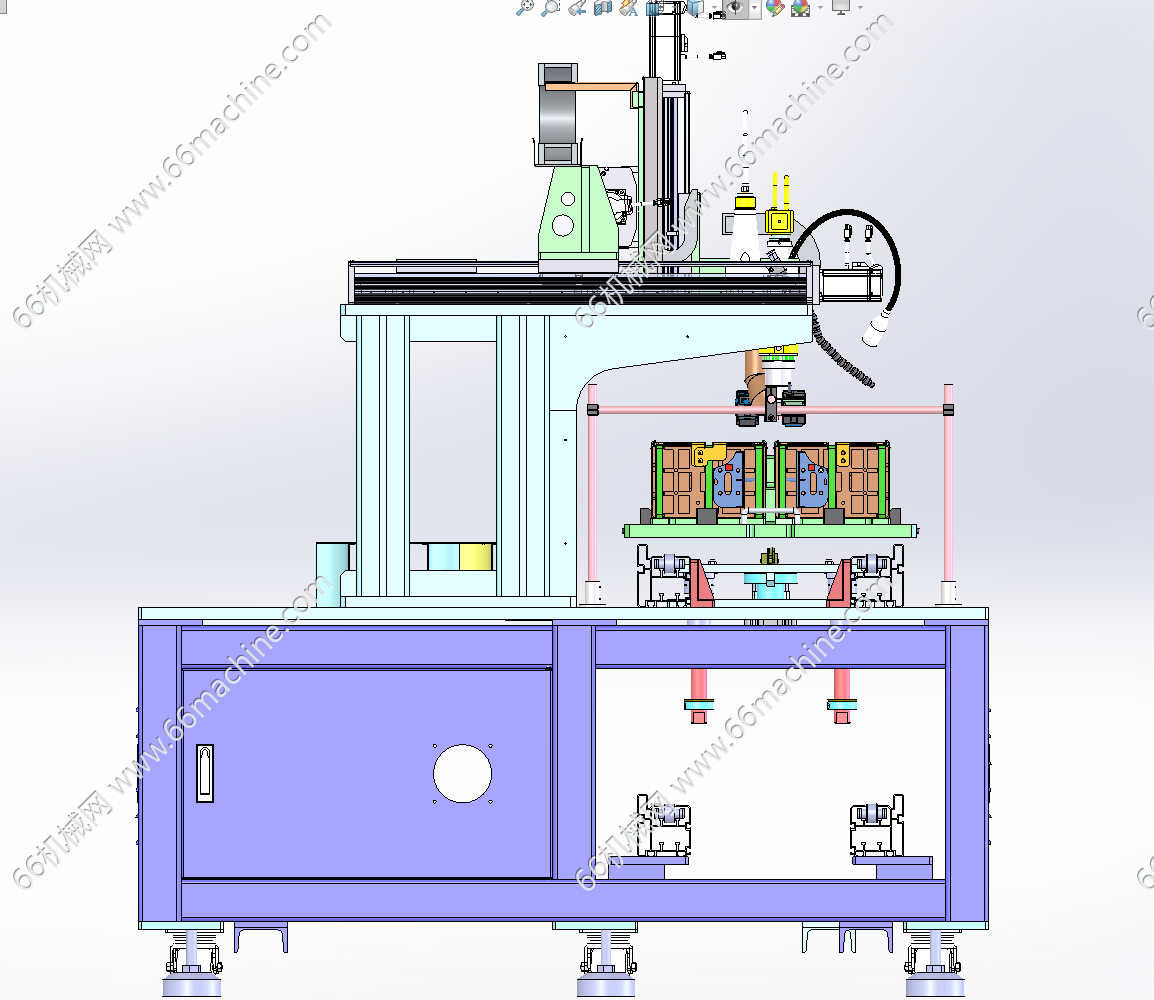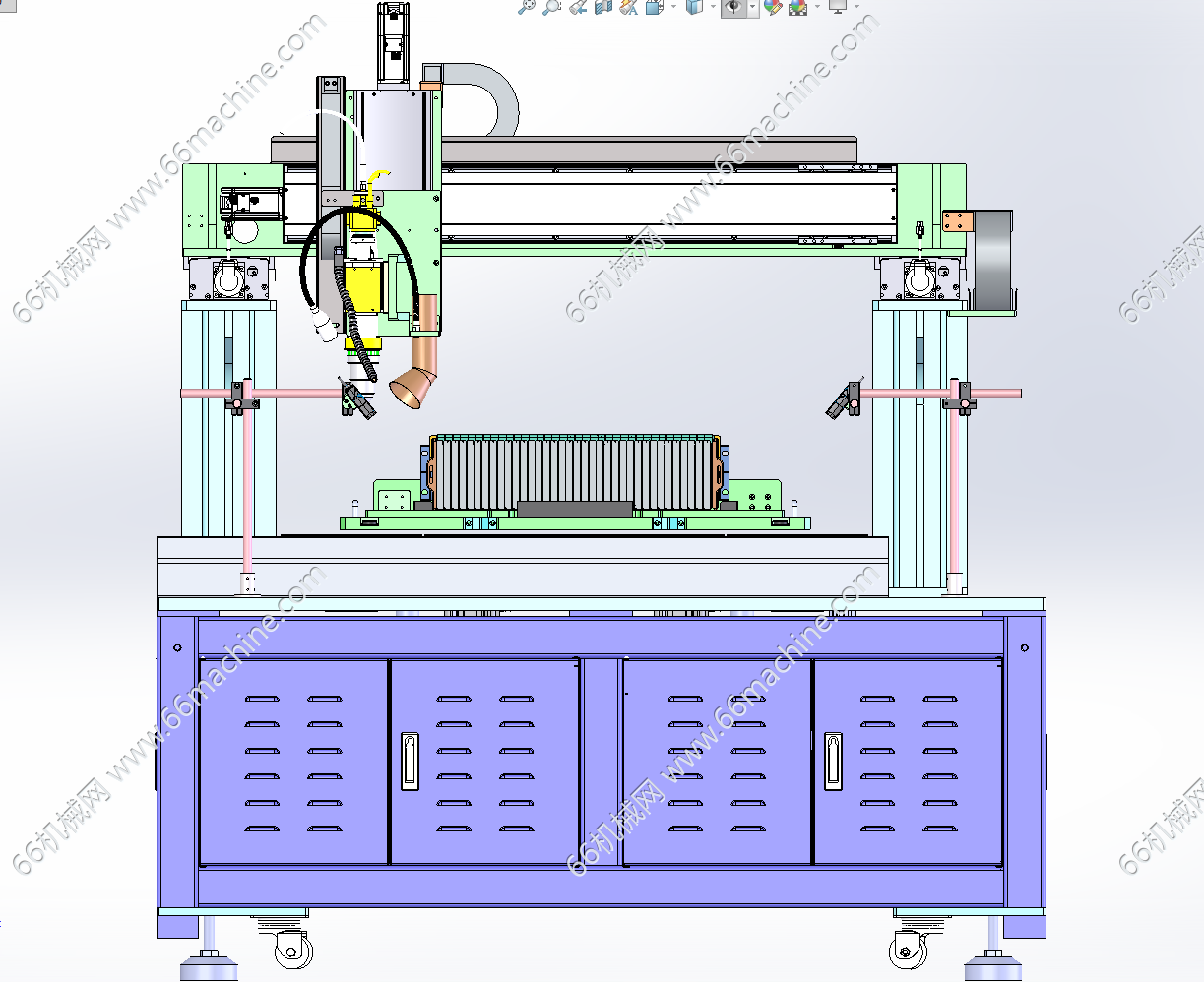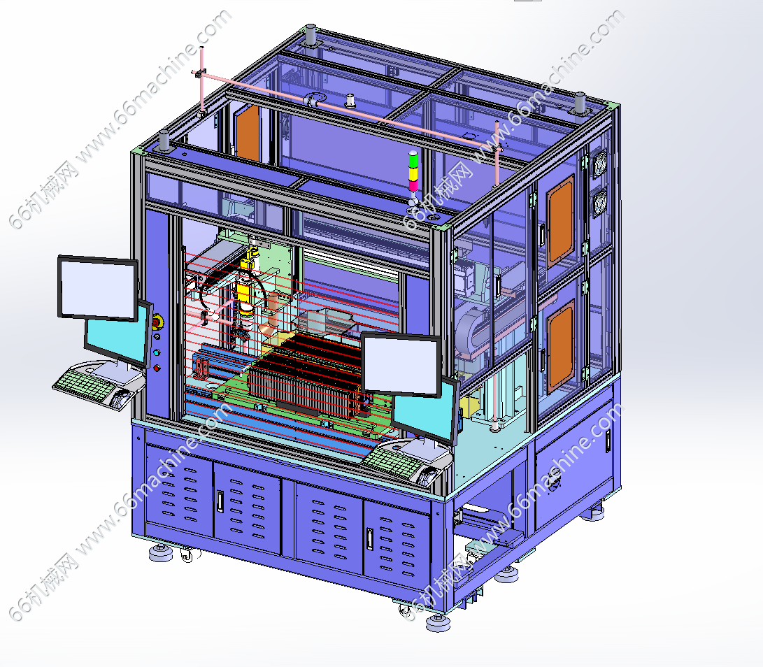 本模型为某企业软包电池激光焊接机,主要由下机架、机罩、三轴龙门激光焊接模组、载具顶升模组及载具输送倍速链等组成,主要用于电池模组的焊接作业,可供大家参考!