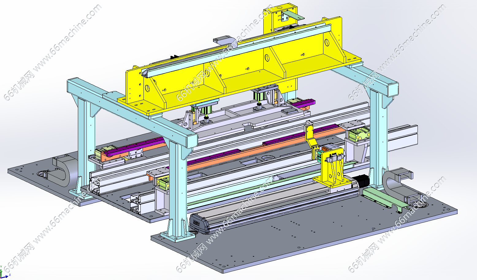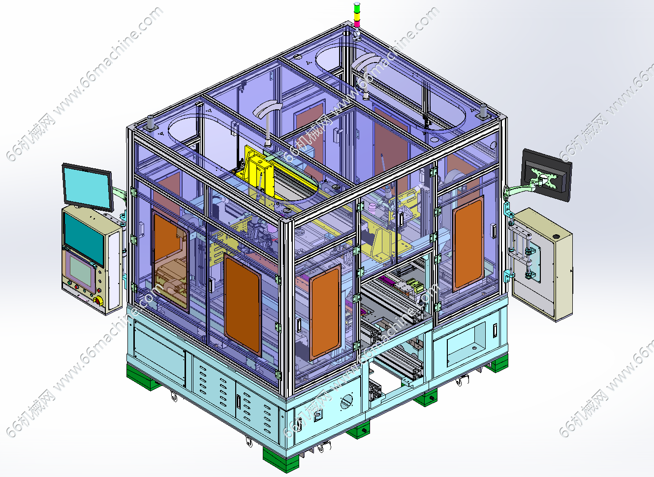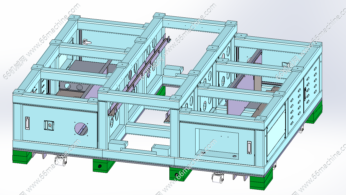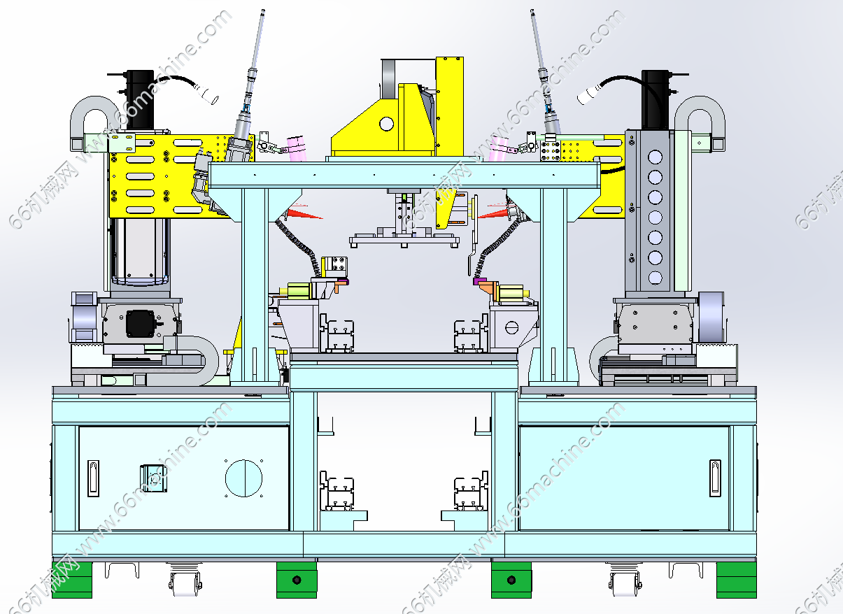 本模型为某企业矩形管件双头激光焊接机,主要由下机架、机罩、2组三轴激光焊接模组及矩形管件压紧移动模组等组成,用于矩形管件的焊接作业,可供大家参考!