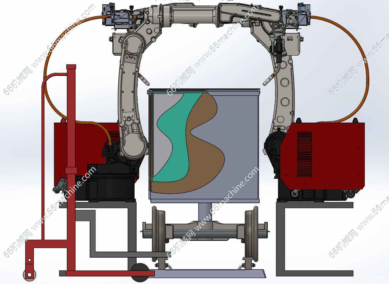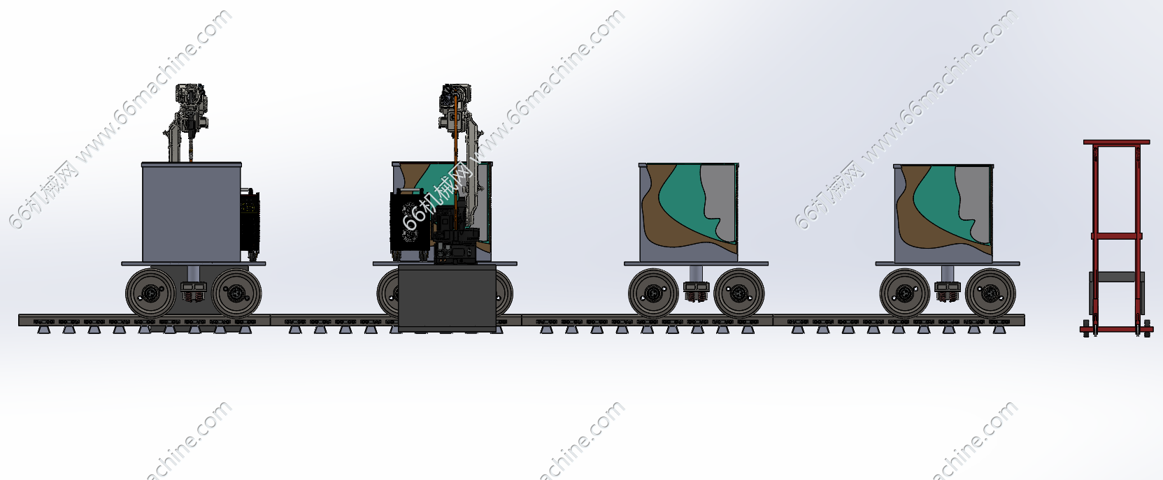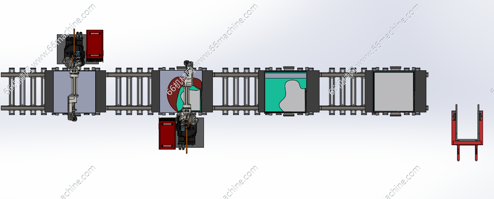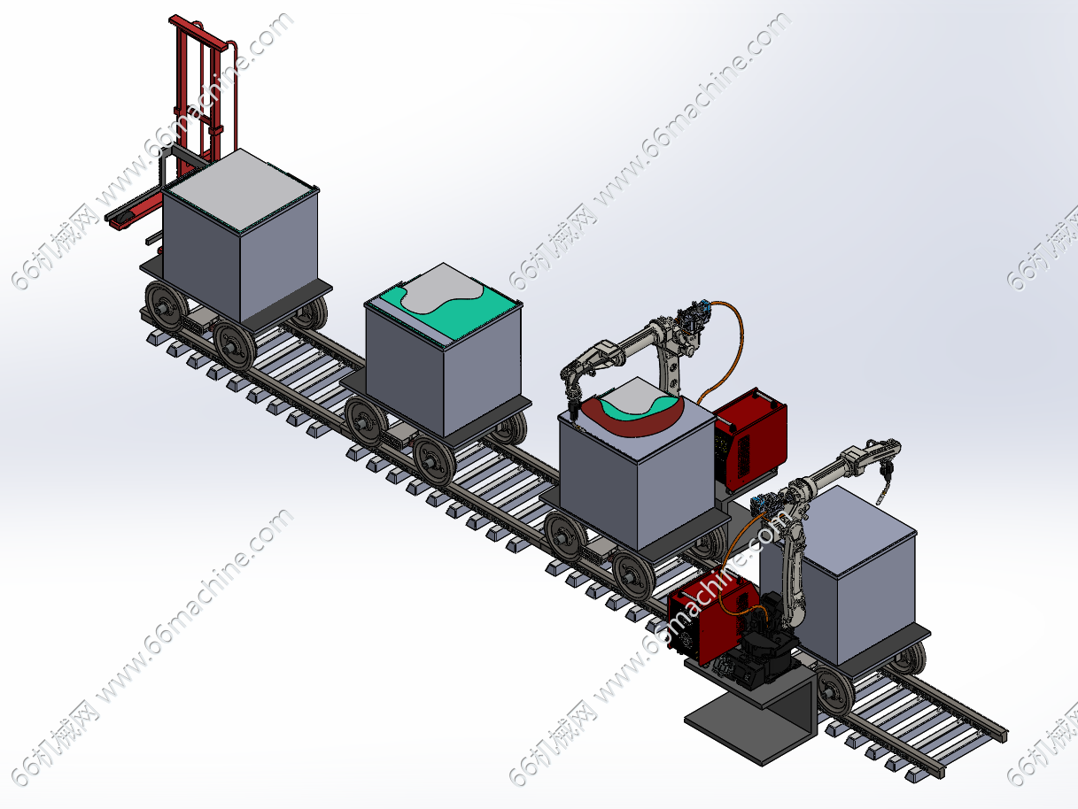 本模型为基于机器人的轨道式焊接工作站,可应用于轨道交通或大型设备的箱体焊接场景。工件置于轨道台车,由焊接机器人自动完成多面焊接作业,焊接完成后经轨道转运,方便后续工序或仓储,实现大型工件焊接的自动化与标准化。
