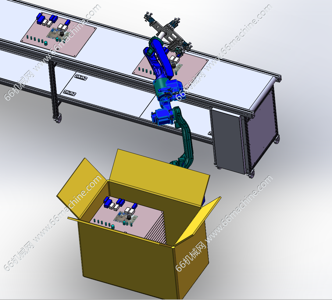 本模型包括激光焊接机械手,移动机构,运输台,取料机械手,纸箱,电路板,模拟电路板的激光焊接,运输,取料,装箱等工序,实现自动化工序的流转,通过系统控制。本模型建模精巧,可供大家探讨学习!