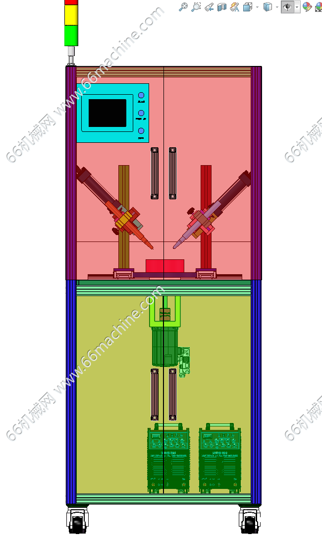 本模型为氩弧焊对焊机(氩弧焊机),采用工业铝型材机架与全封闭透明防护结构,顶部配备三色警示灯用于状态显示集成双轴联动精密滑台、氩弧焊枪与旋转工作台,可实现高精度环缝焊接,适配不锈钢、钛合金等多种材料,适用于精密五金、汽车零部件、医疗器械等领域的批量焊接作业。