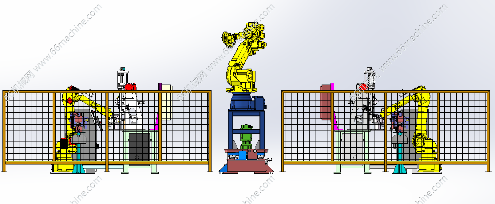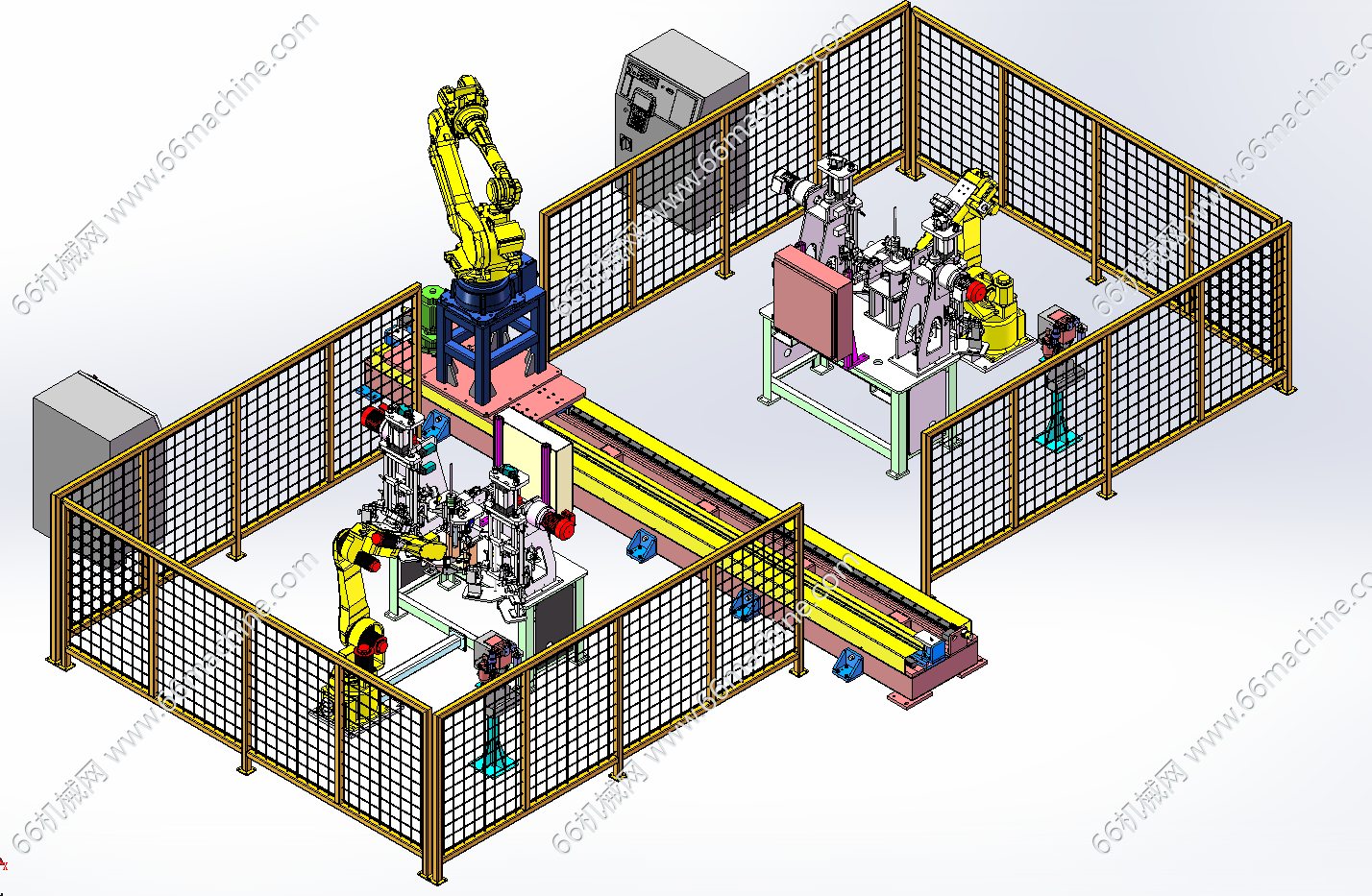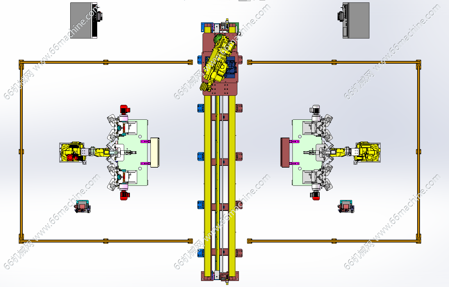 本模型为基于机器人的自动焊接系统,其中由一台地轨式六轴搬运机器人从一侧取料,放置两侧的焊接工装上,由两台焊接机器人自动焊接,焊接完成后在抓取放置另一侧成品区。