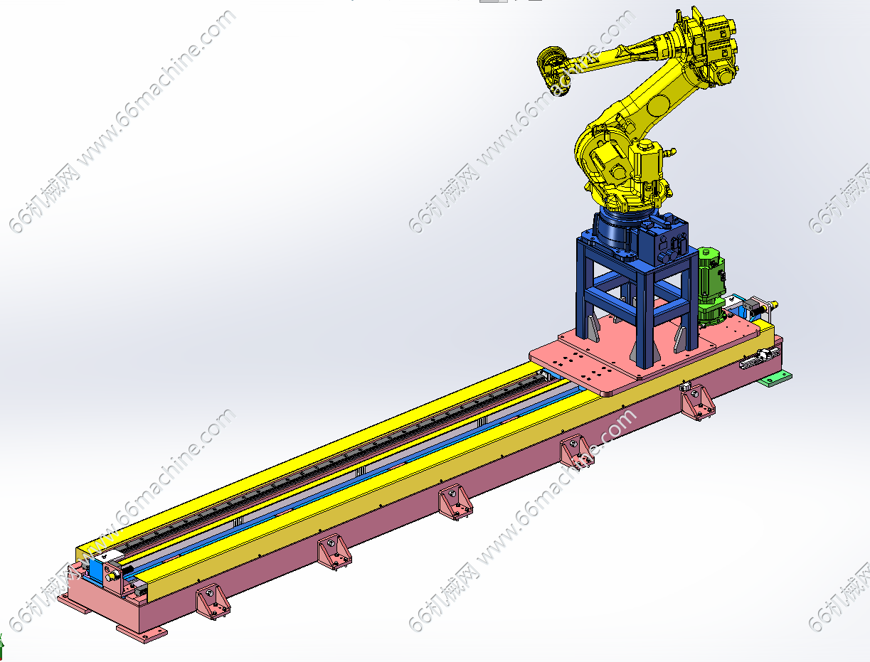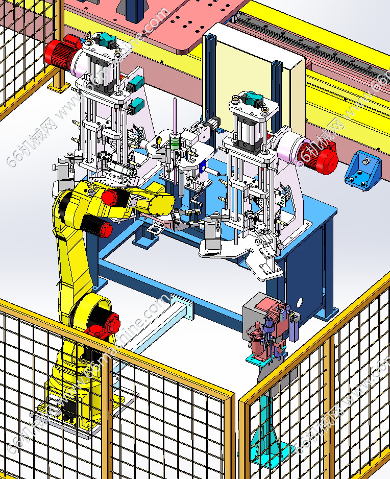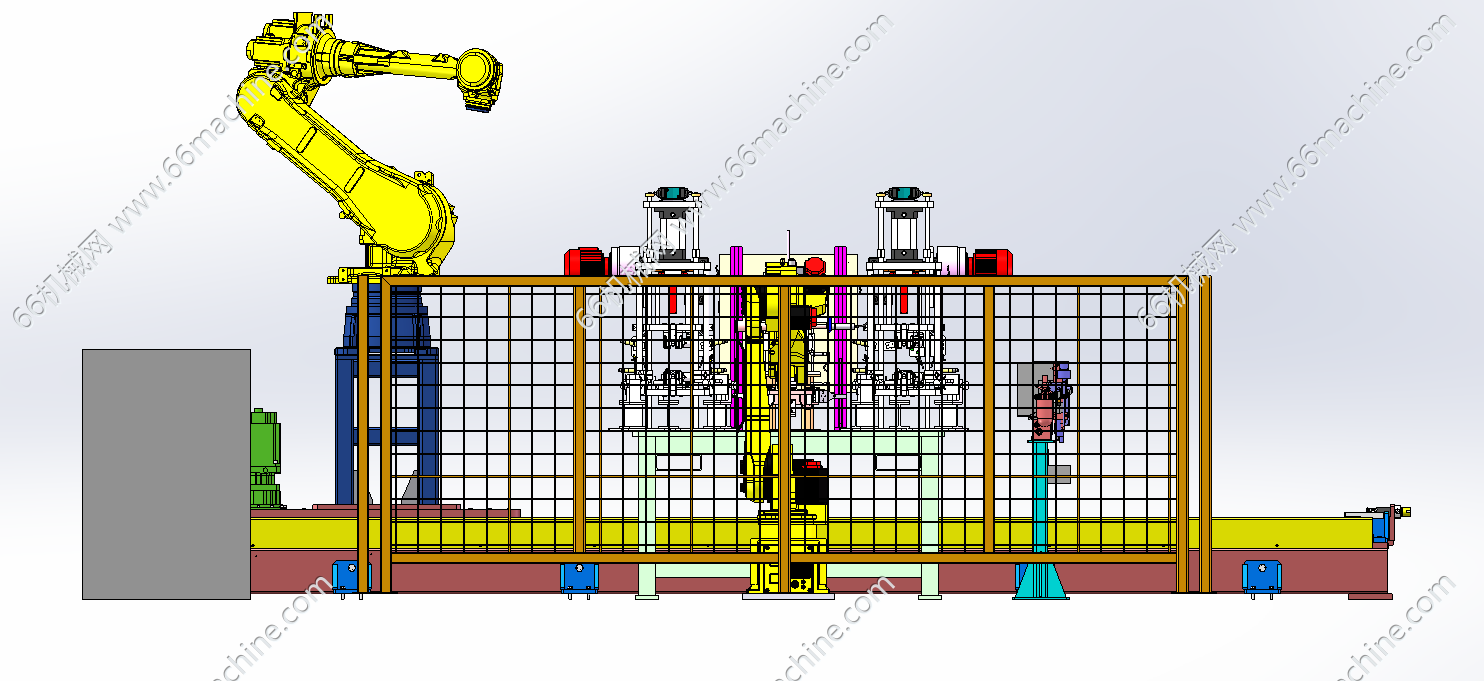 本模型为基于机器人的自动焊接系统,其中由一台地轨式六轴搬运机器人从一侧取料,放置两侧的焊接工装上,由两台焊接机器人自动焊接,焊接完成后在抓取放置另一侧成品区。
