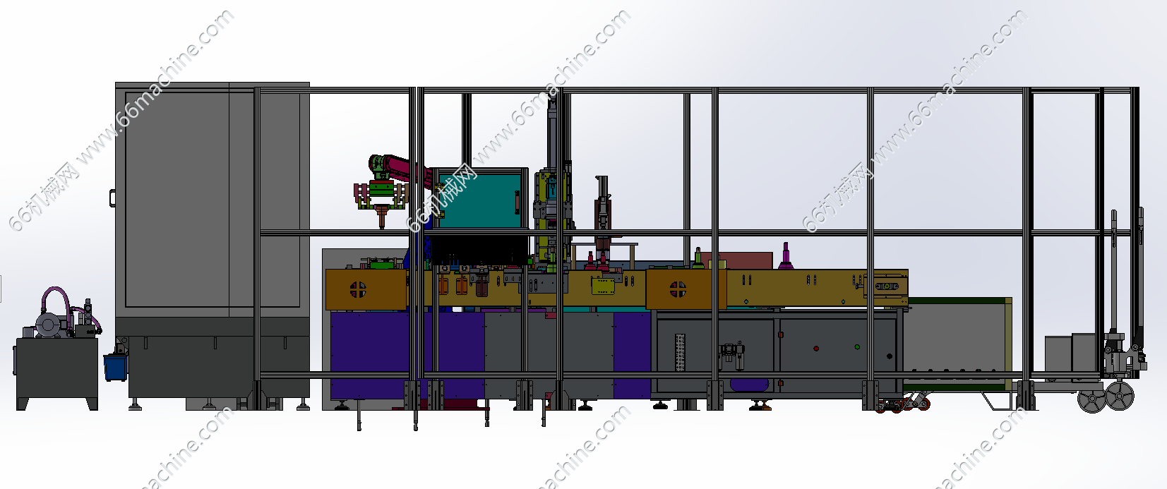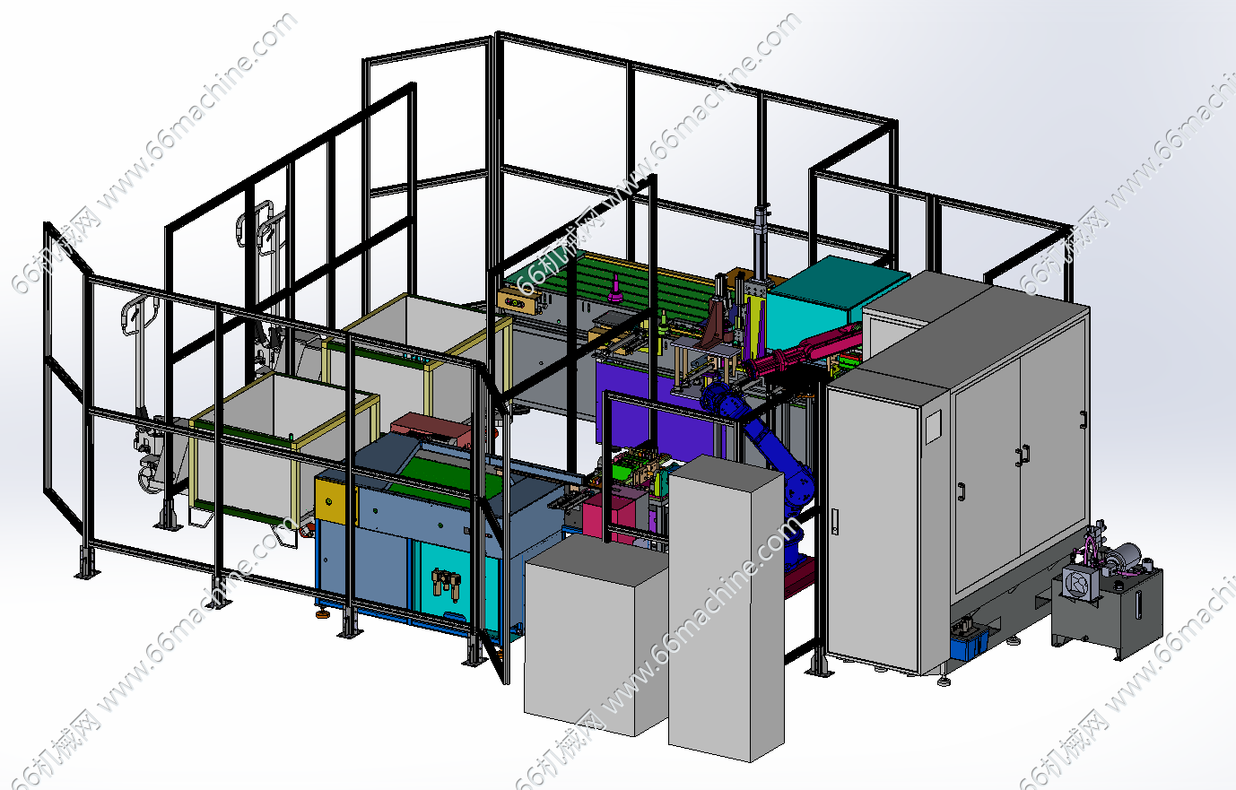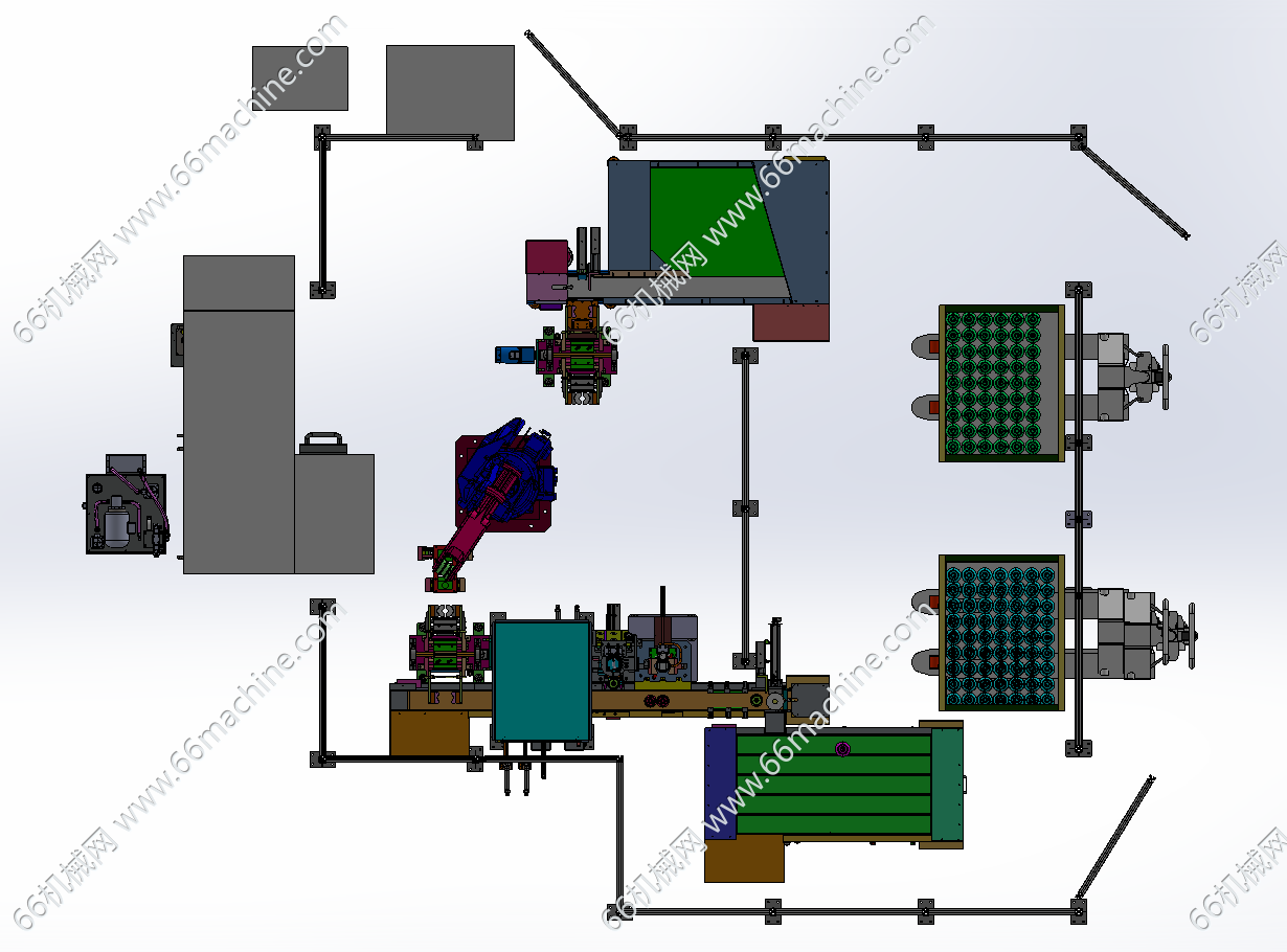 本模型为基于机器人上下料的机床设备(加工中心),包含机器人、机床、输送线、视觉检测机等组成,视觉检测用来检验产品加工质量,本模型为方案布局,欢迎参考!