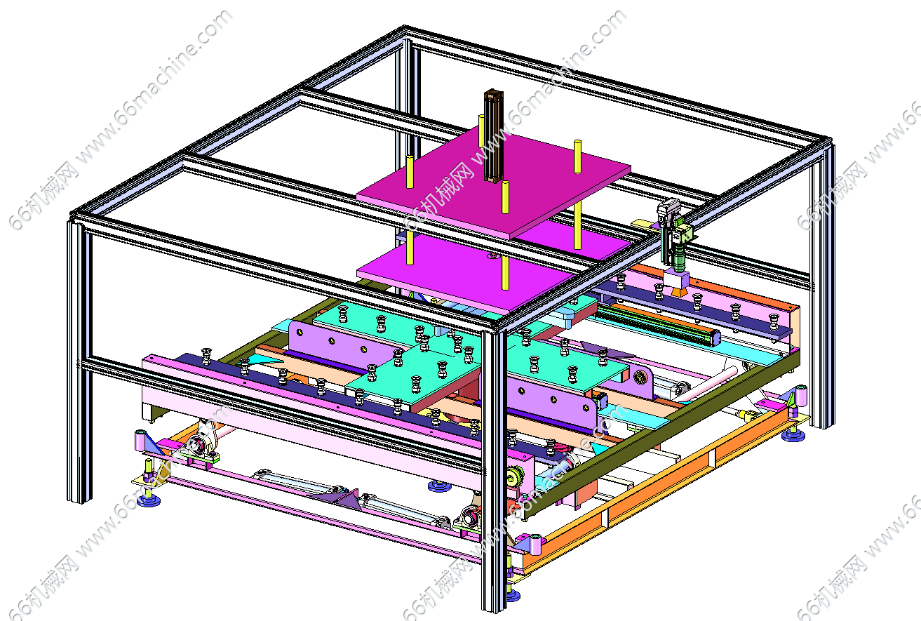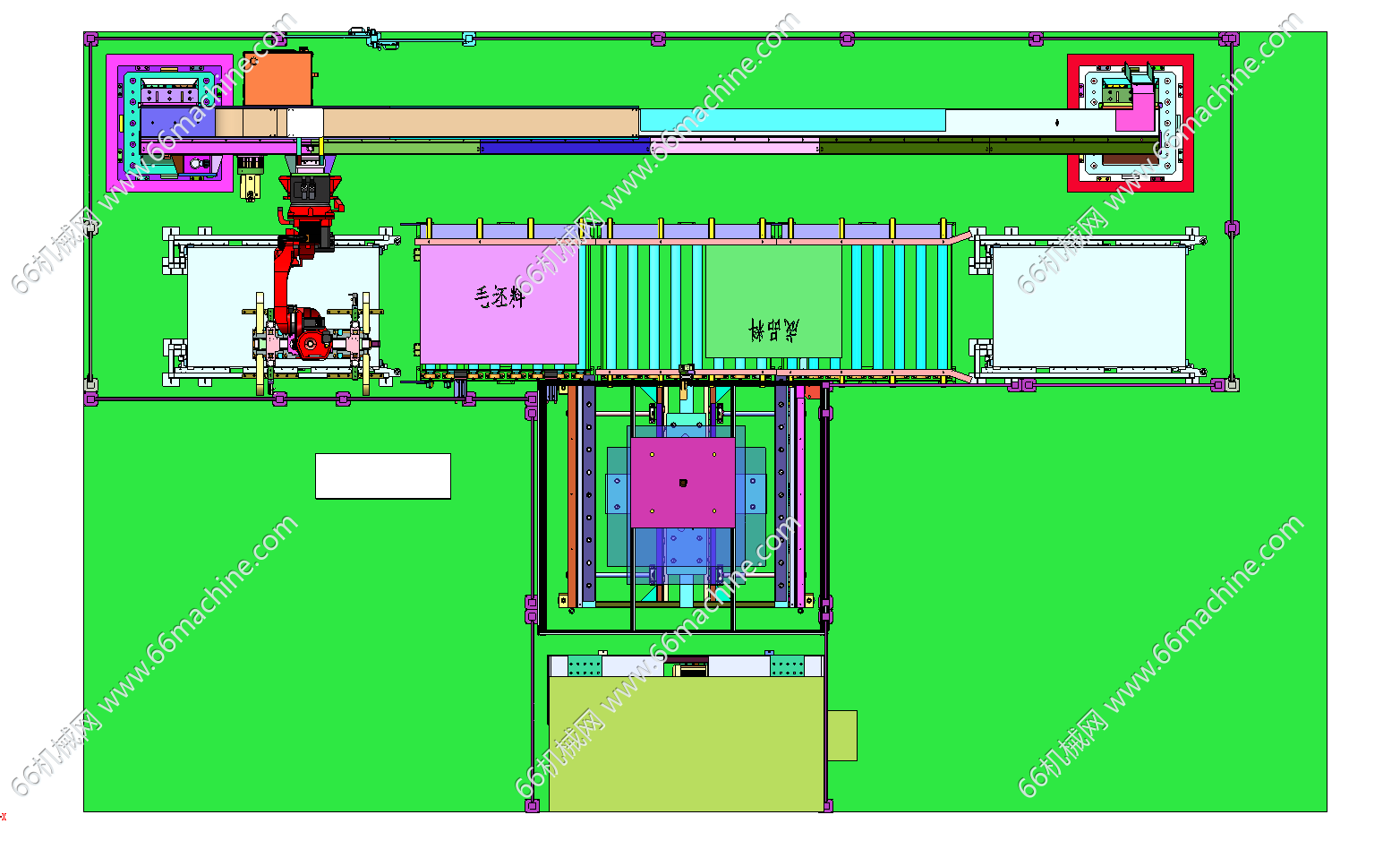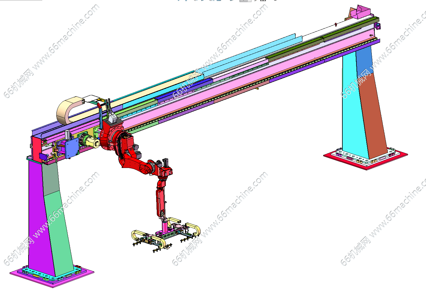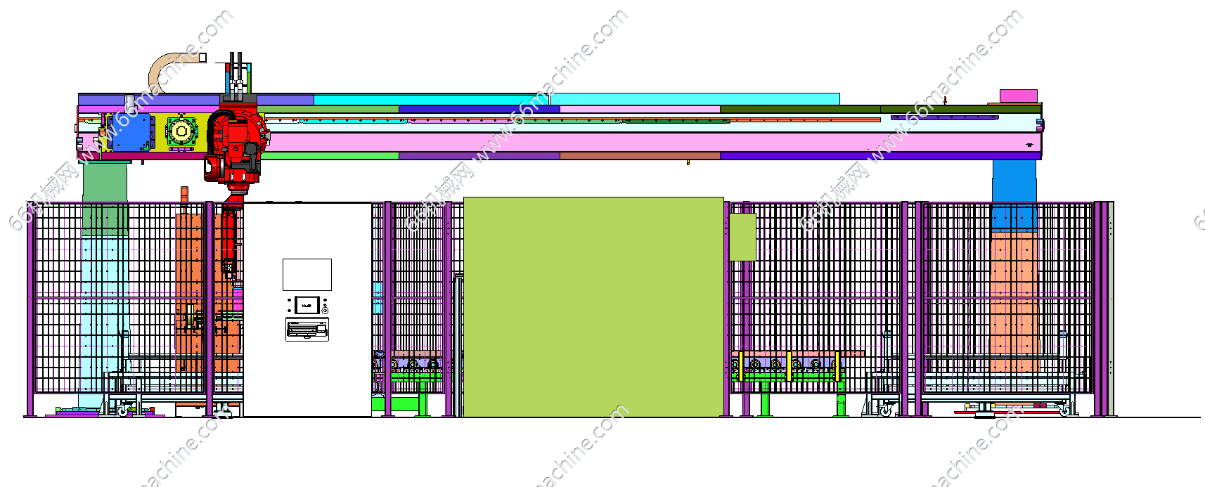 本模型为基于天轨机器人自动上下料的板材剪切设备,主要由剪板机、滚筒输送机、移动天轨机器人、旋转平台、料车及定位架等组成,通过可编程控制系统控制,可实现毛坯自动上下料及剪切作业,欢迎参考!