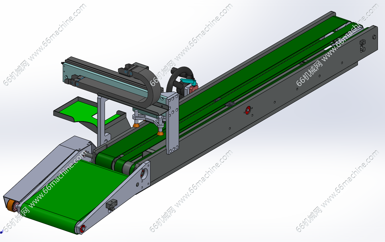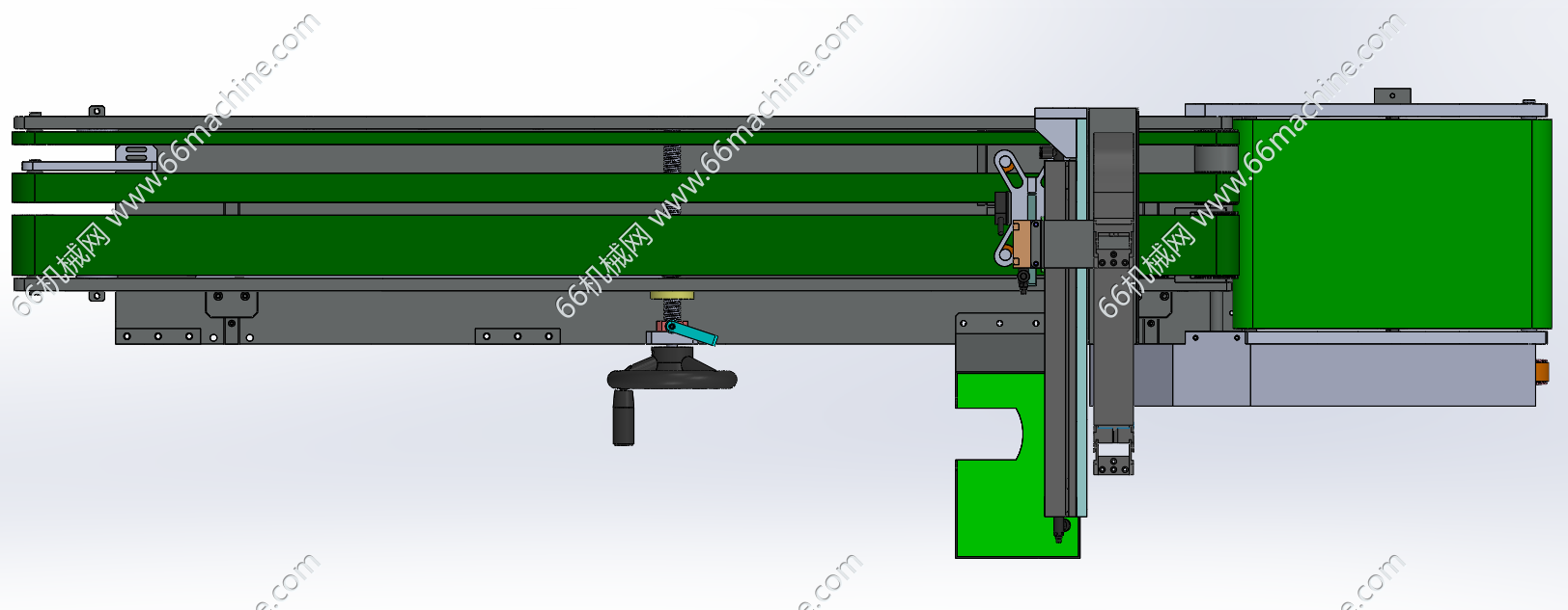 本模型为带吸取移栽机构的手动调宽皮带输送机,皮带有效宽度可以通过人工操作进行机械式调节的皮带输送机。它无需电气或液压动力进行调宽,而是依靠螺杆、手轮、齿轮齿条等机械机构,实现两侧护栏或整个机架宽度的对称或非对称移动,从而改变物料的输送通道宽度,以适应多种尺寸产品的输送需求。