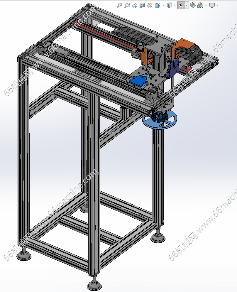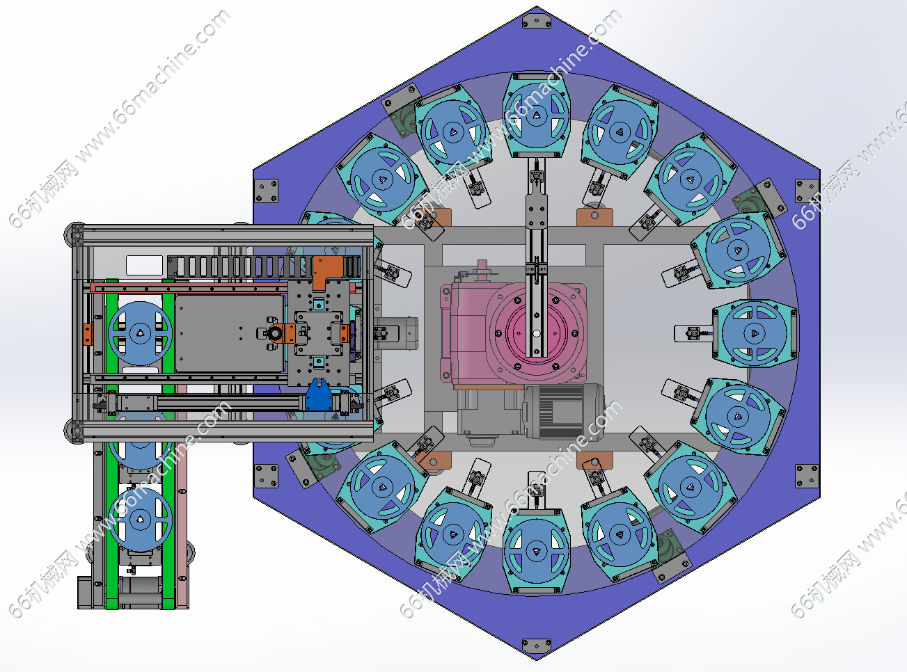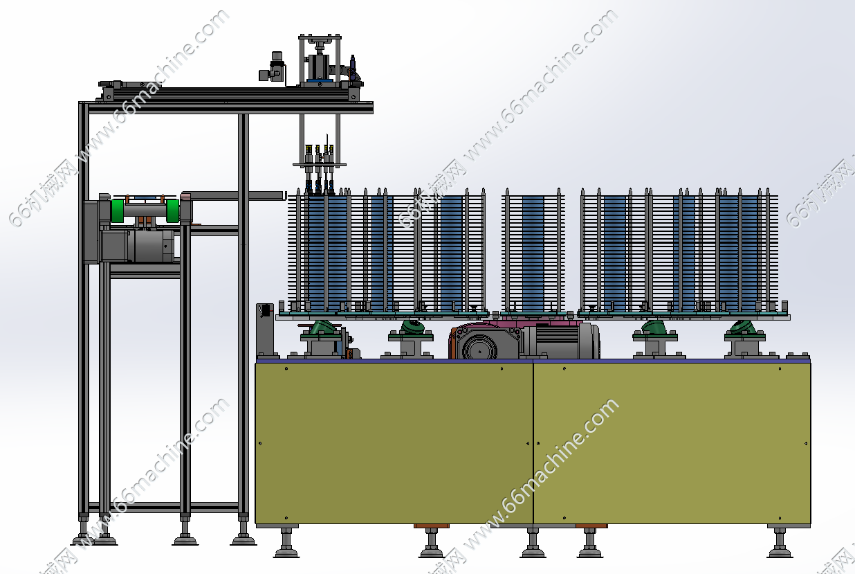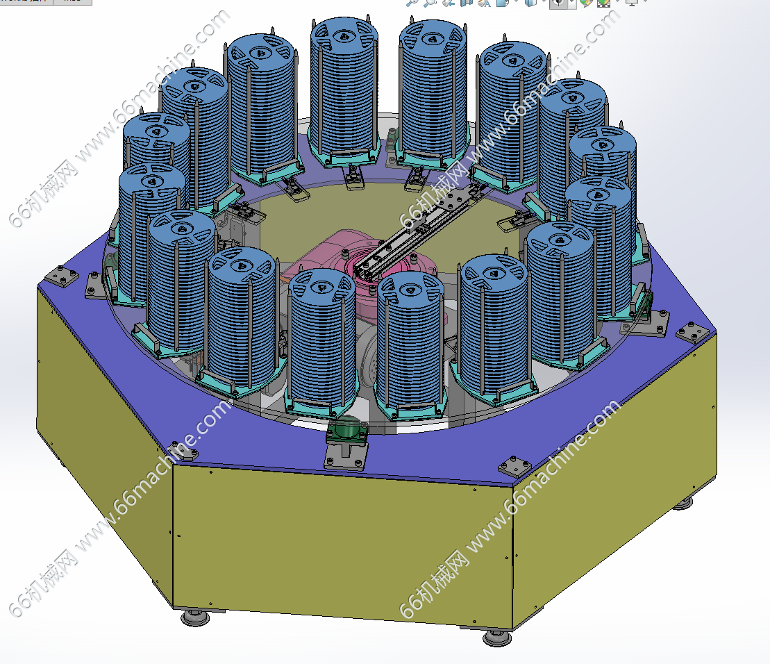 本模型为转盘式供料及吸取搬运机构,转盘式供料机构以旋转转盘为核心执行元件,通过转盘的间歇或连续旋转,将物料从储料单元间歇地输送至取料位,然后由吸取搬运机构送料至皮带线流至下工序!
