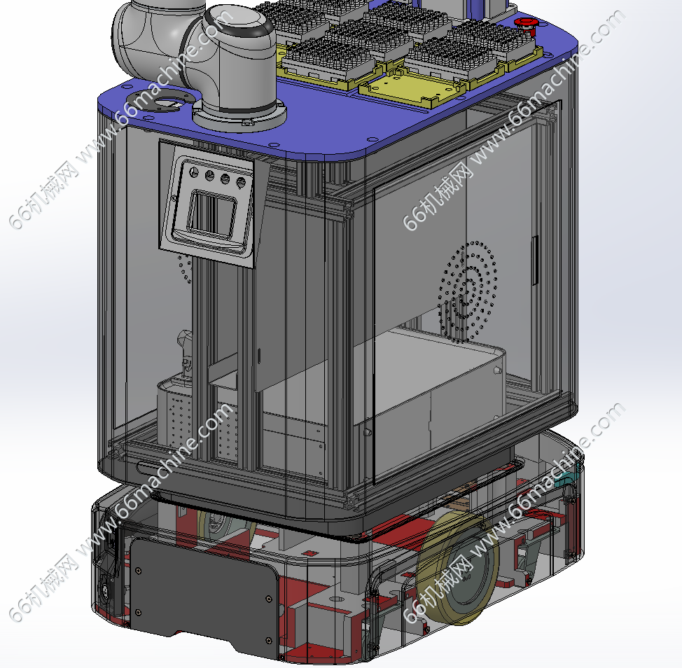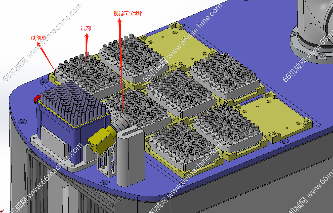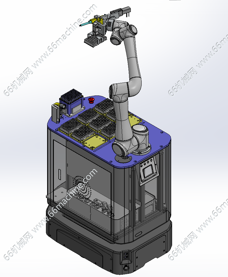 本设备为AGV复合机器人,主要用于试剂的取用与自动转运,采用视觉定位转移料盒。步骤为:1.吸液枪取塑料吸头;2吸取试剂瓶内的试剂;3.将吸取的试剂转移至待测试剂瓶;4.将塑料吸头自动取下;5.将待测试剂料盒利用电动夹爪转移至测试平台。AGV小车在整个过程中可以去补充试剂盒,自动充电,运送待测试剂盒去测试台。本模型建模精巧,可供大家参考!