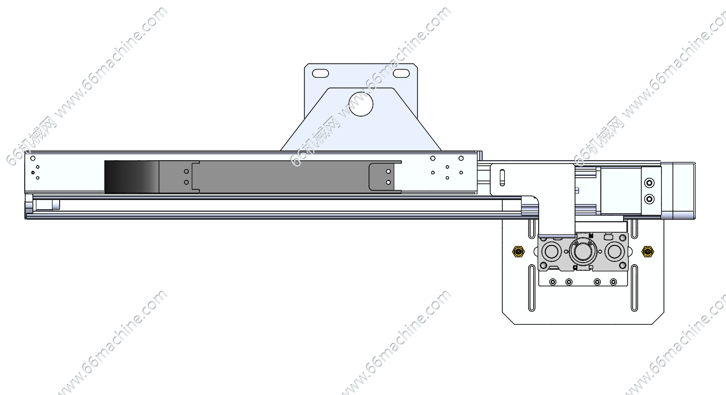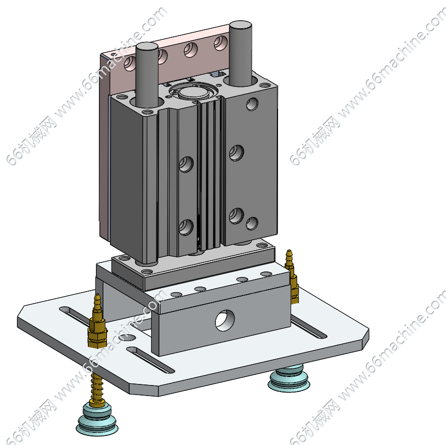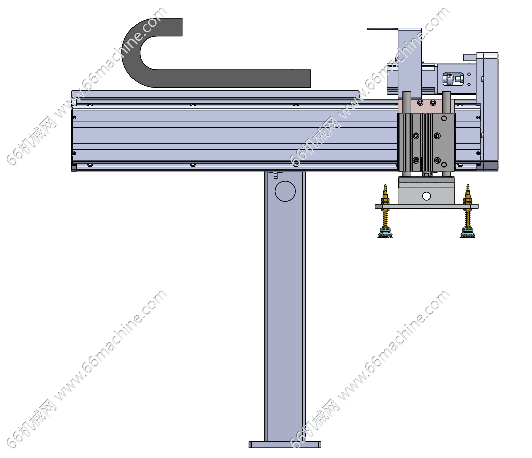 本模型为吸取移栽机械手,X轴采用伺服电机+丝杠模组实现高精度往复运动,Z轴气动垂直升降,末端配备带弹簧缓冲的真空吸盘组件,通过负压吸附完成PCB、3C电子等轻薄工件的取放与工位间移栽,广泛应用于自动化流水线、非标专机等物料搬运场景。