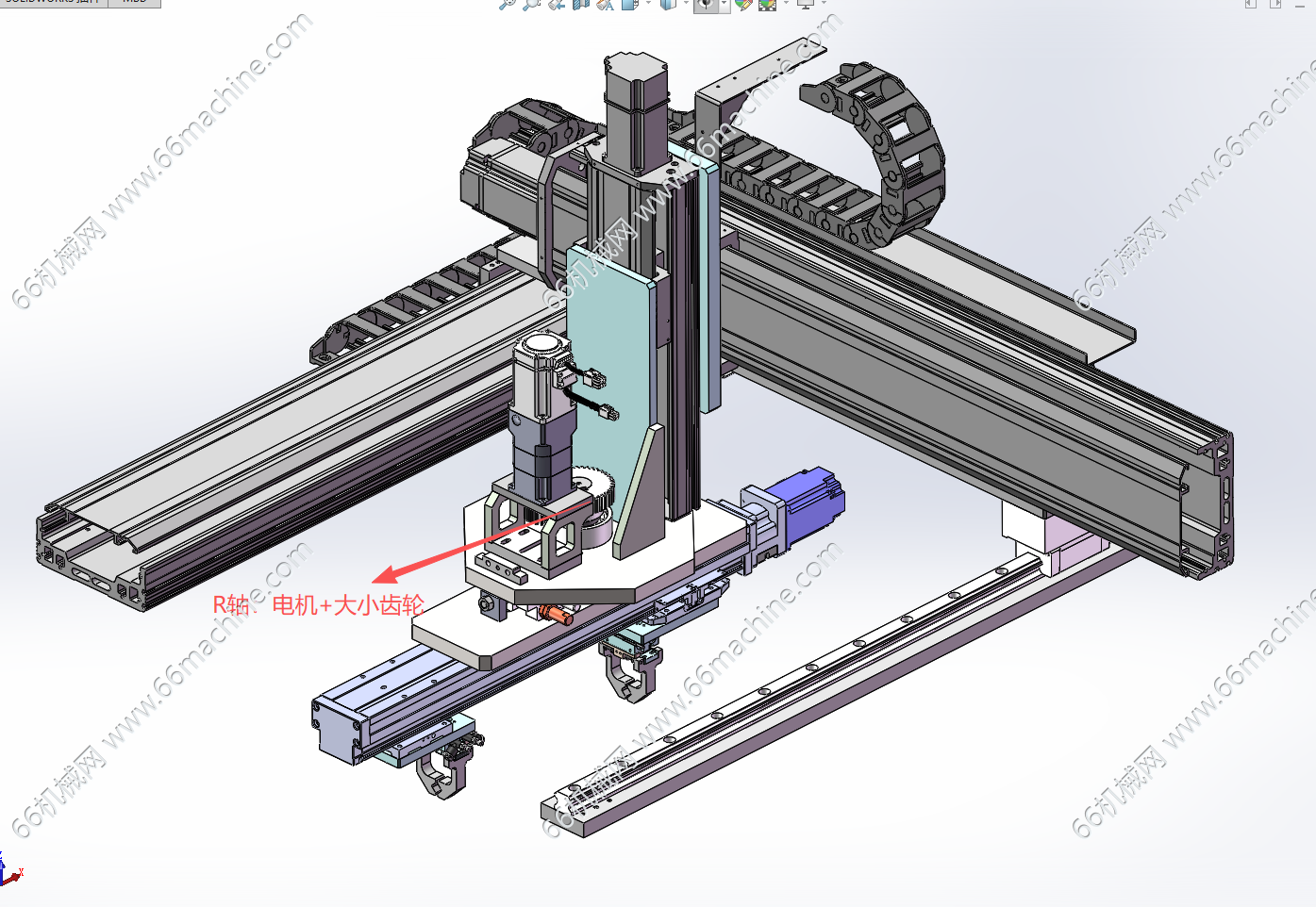 本模型为双夹爪四轴夹取移栽机,XYZ轴均采用伺服电机+丝杠模组,R轴采用伺服电机驱动大小齿轮实现360度旋转,末端丝杠上设有2组气动夹爪(丝杠可调节夹爪间距),采用移动滚轮设计,便于转移,可供大家参考!