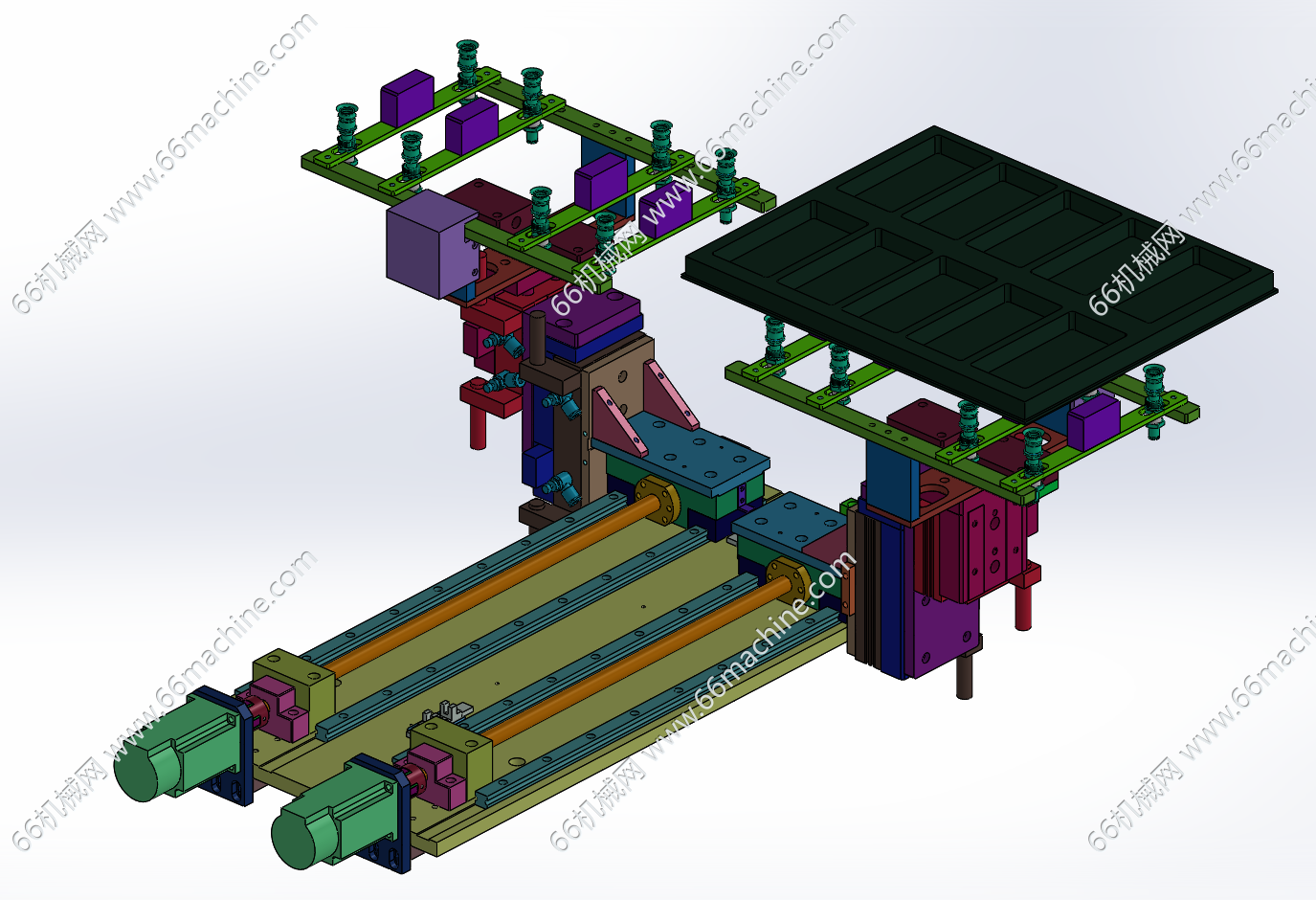 本模型为双工位载具吸取移送模组,采用伺服电机+丝杆+双导轨结构实现往复直线动作,若干个吸嘴进行负压吸取,广泛用于自动化设备中载具的移送,欢迎参考!