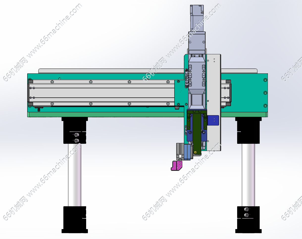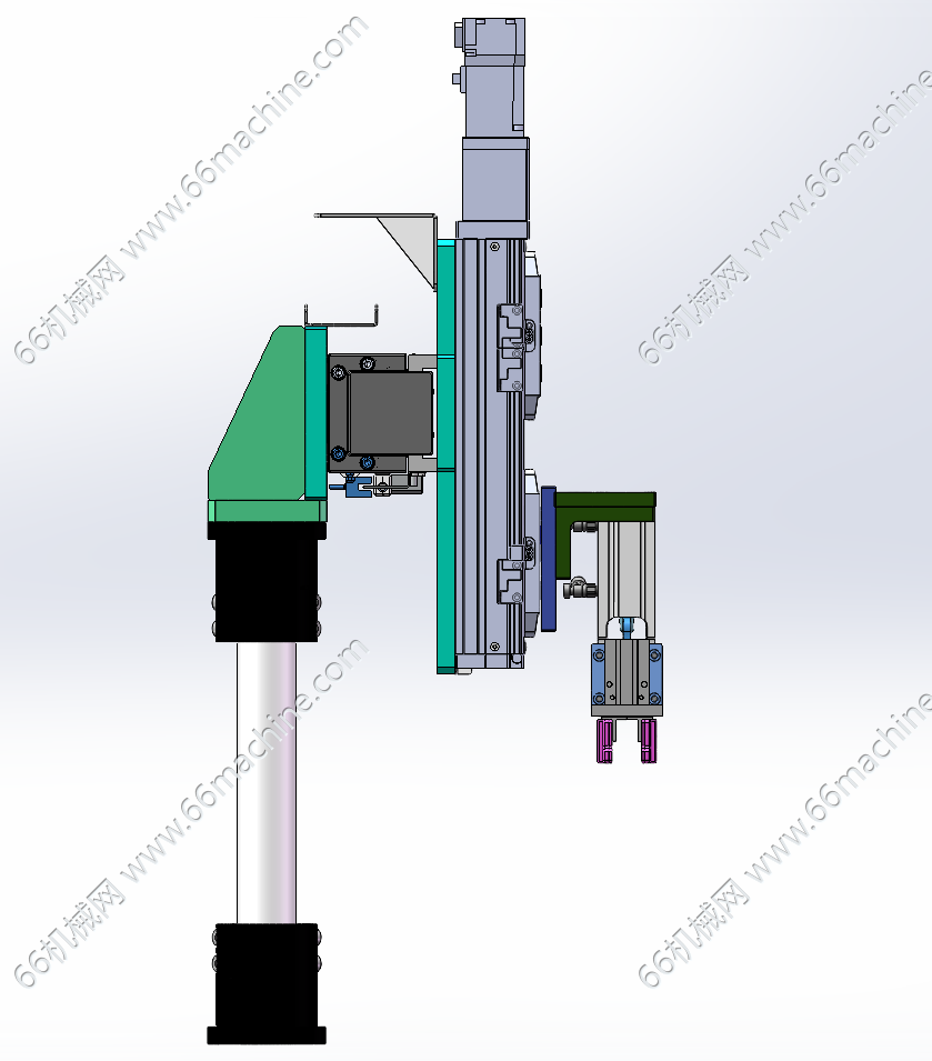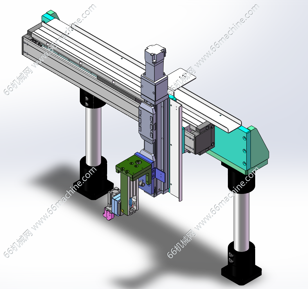 本模型为气动夹取移栽机械手,由X轴直线模组、Z轴直线模组及支撑立柱构成,末端搭载气动夹爪。设备通过伺服电机驱动模组,实现精准的水平移动与上下升降,配合夹爪完成工件的抓取、搬运与放置。广泛用于上下料、物料移栽场景。