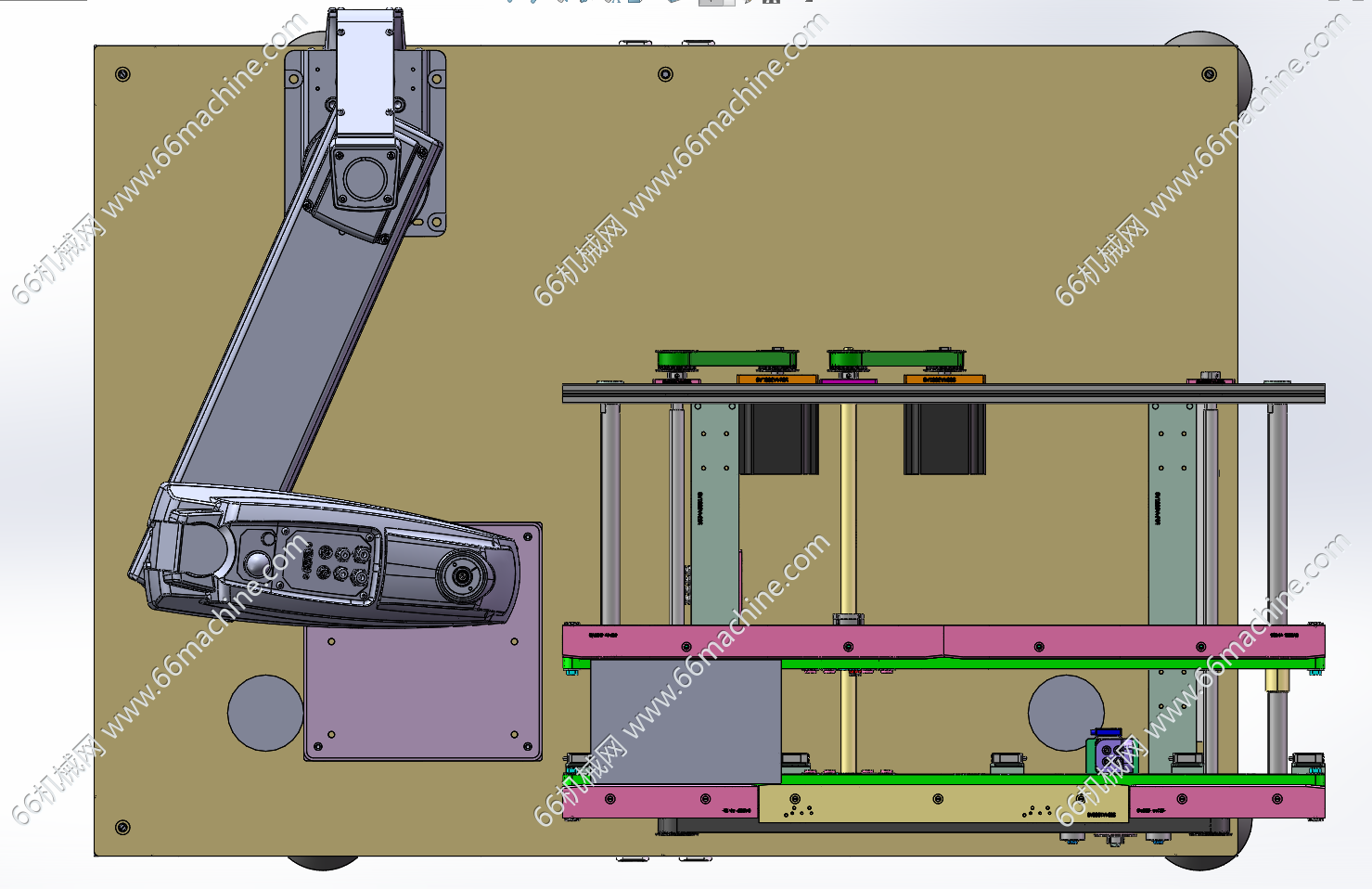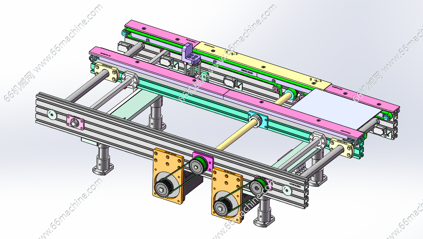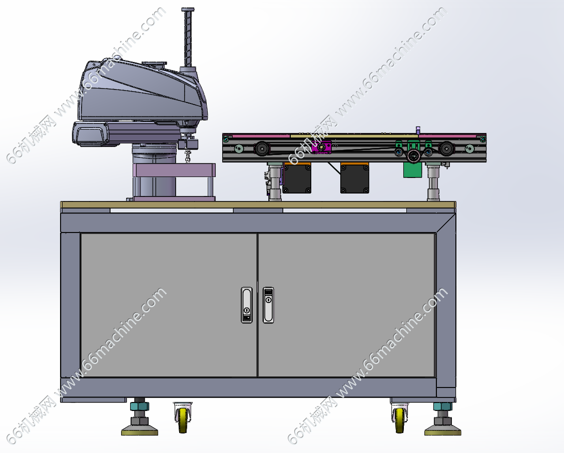 本模型为基于机器人的可变间距双皮带分拣机,是用机械手把料盘的物料拾取到皮带机上。自动可变间距双侧皮带机是有两组电机组件,一个电机组件是改变皮带间距,另个电机组件则运行同步带的。两个皮带,一侧固定,一侧随着丝杆移动来改变皮带间距。只要设置电机参数,无需手动摇动把手来调节间距。欢迎参考!
