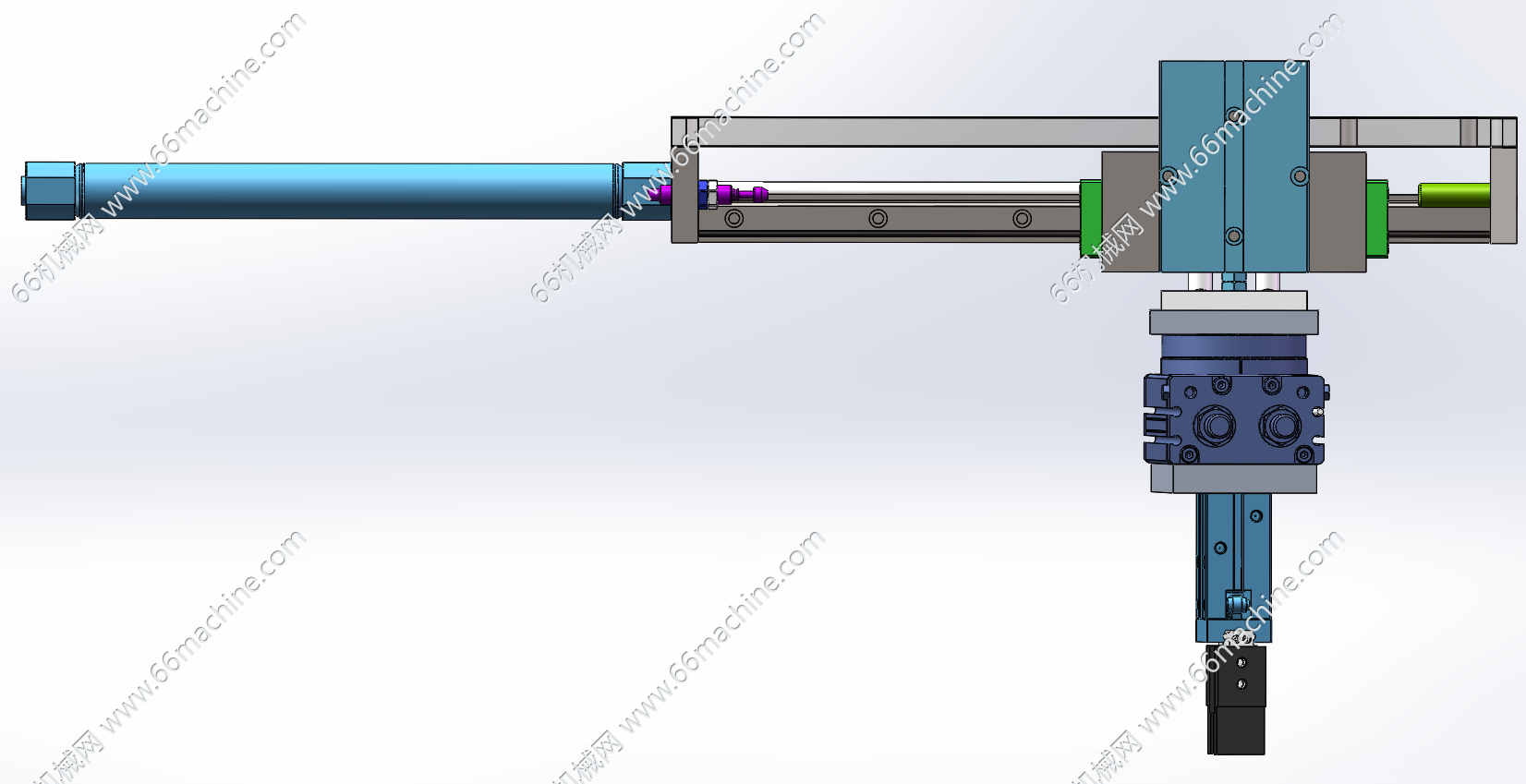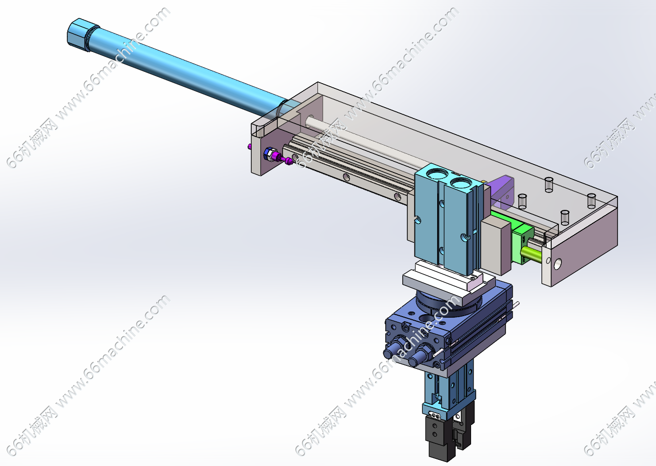 本模型为横移旋转机械夹爪(夹持机构),采用长行程气缸驱动夹爪沿着导轨做往复直线动作,末端采用气动二指夹爪,旋转气缸可使夹爪旋转,该机构广泛用于自动化上下料设备中!