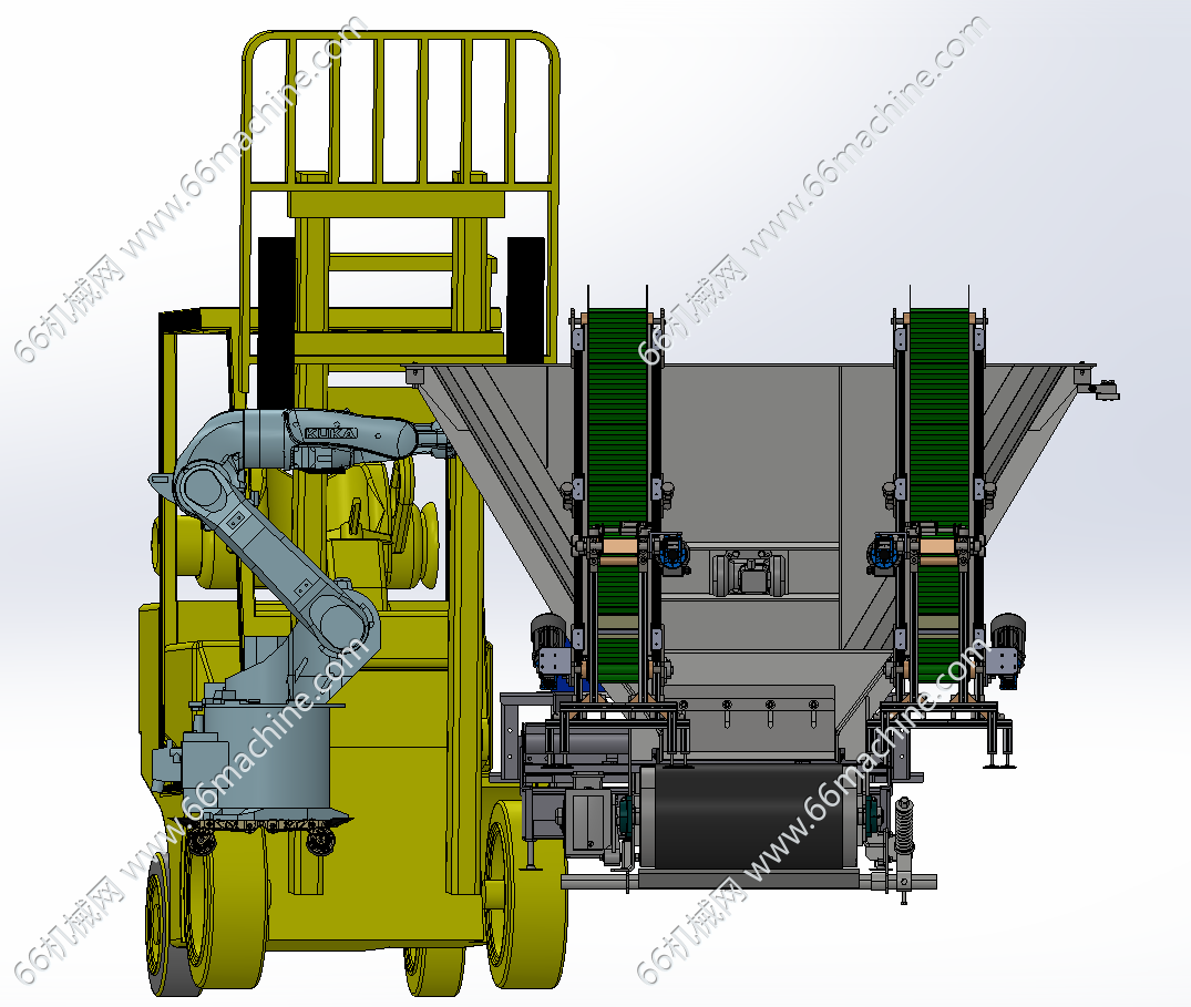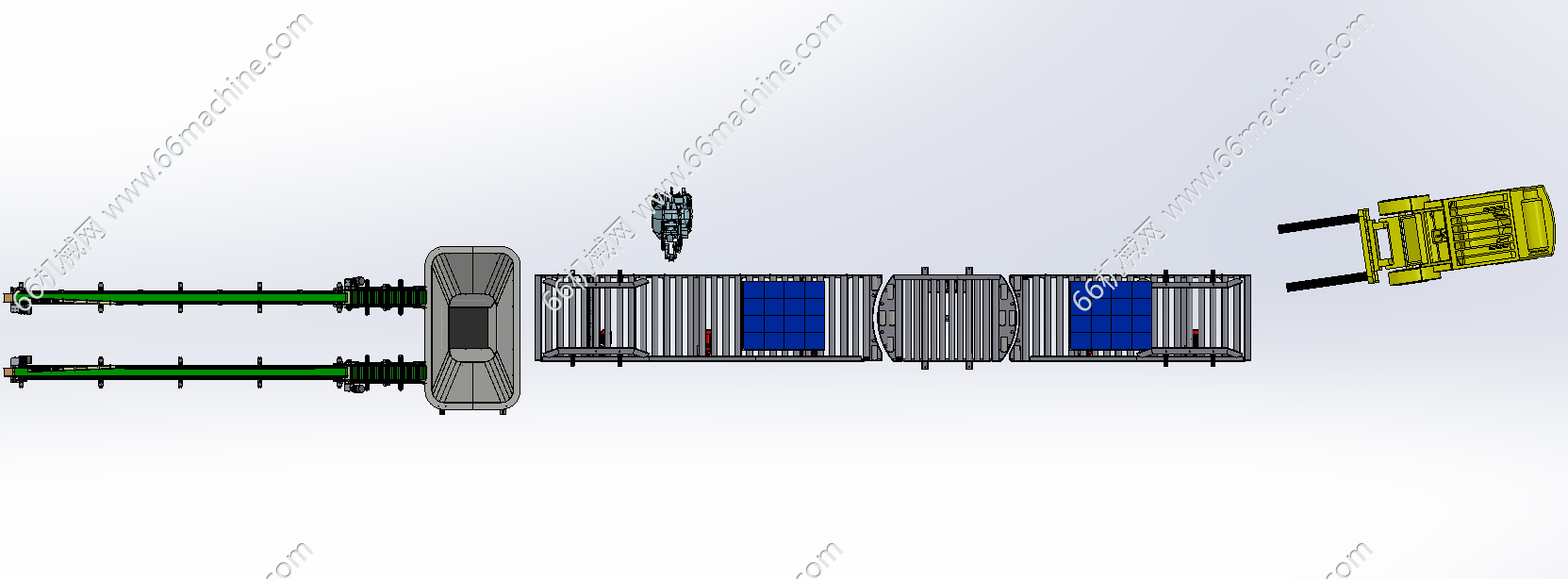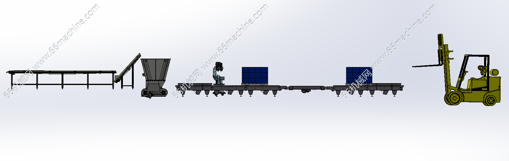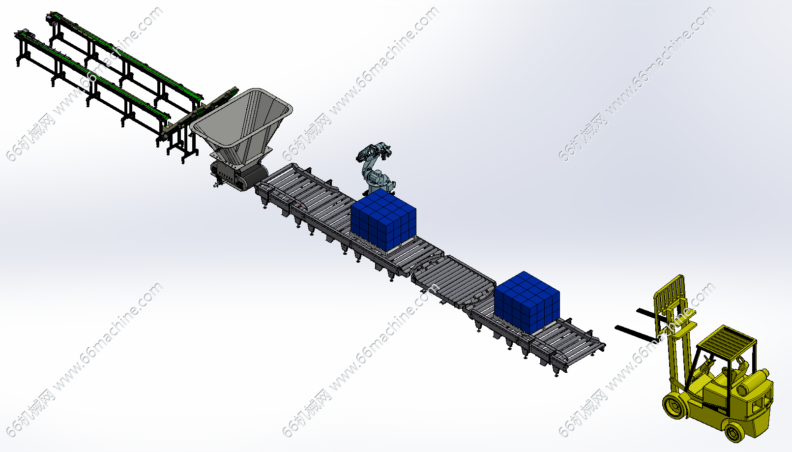 本模型为物流自动化分拣与搬运系统,适用于仓储物流场景。散料经输送、分拣后,由工业机器人对成品(蓝色货箱)进行搬运,滚筒输送线流转货箱,叉车用于批量转运,实现从散料到成品的自动化物流管理。