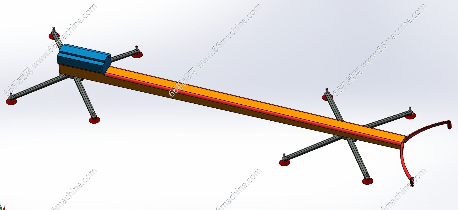 本模型为板件吸取移栽机械手(冲压取料传送机械手),是一种在冲压生产线上实现物料自动化搬运、取料和送料的关键设备, 主要由执行机构、驱动机构和电气控制系统三部分组成。机械手上的吸盘下降至片料上方,向喷嘴通入压缩空气,吸盘将片料吸起,切断气源后片料被牢固抓取。