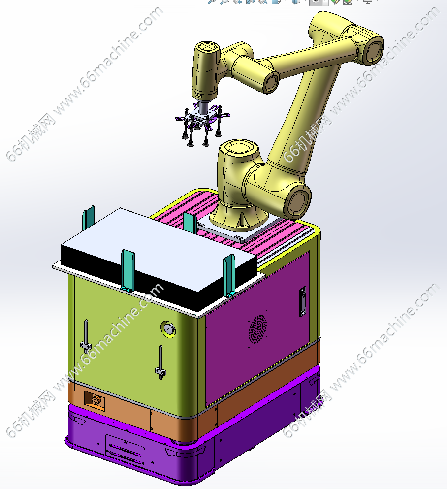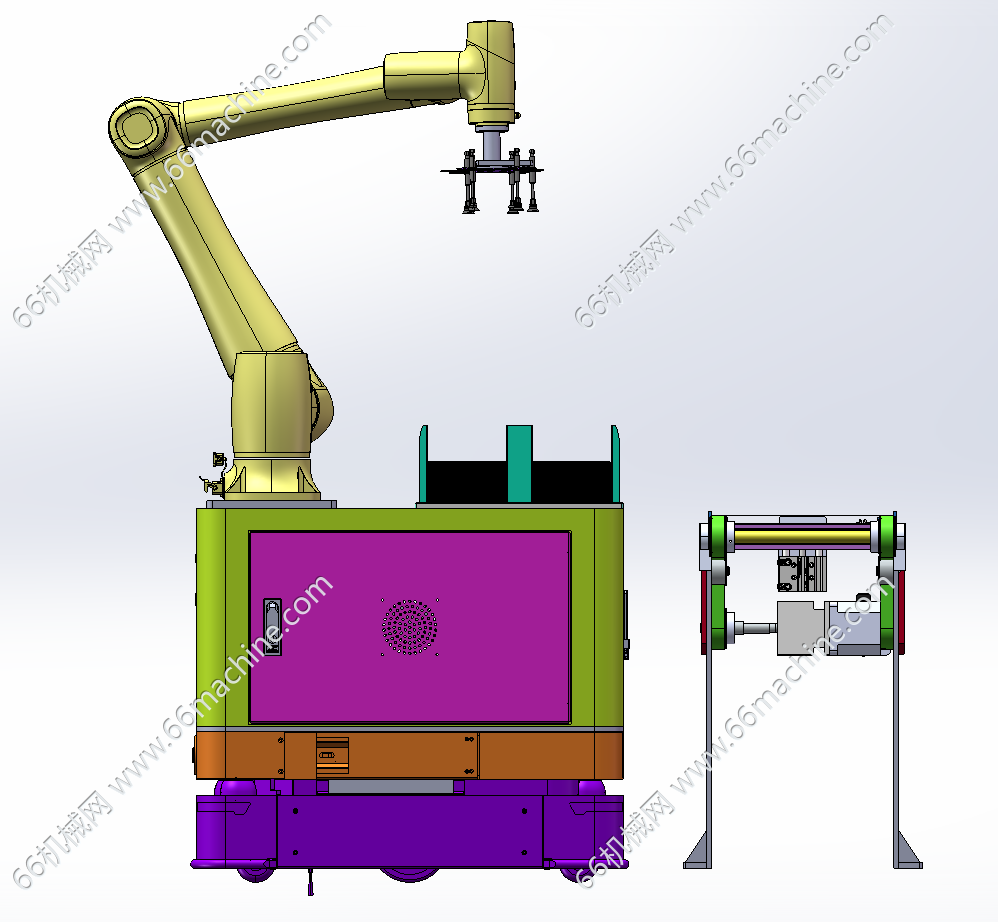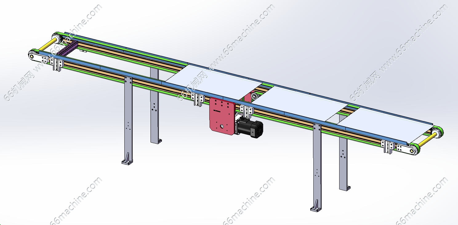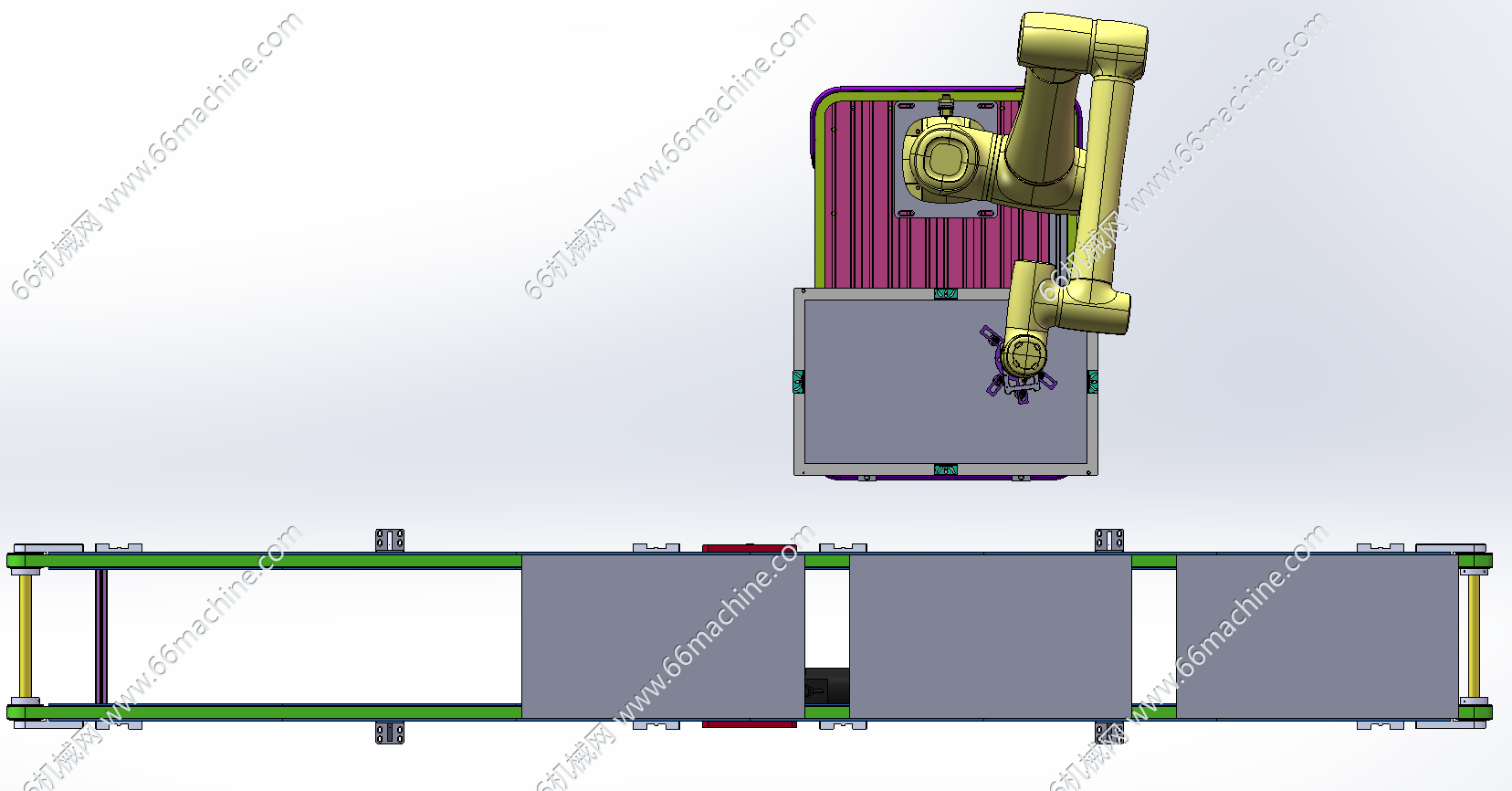 本模型为基于AGV复合机器人上下料的输送线,通过AGV移动机械手上下料,双皮带输送机具有两个轨道或输送带,可以同时进行物料的输送。双轨皮带输送机通常由两个平行的输送带组成,这两个输送带通过同步带带轮轴和驱动系统连接在一起,由伺服电机同步控制启停。常见于需要高效分拣和分流的场合,双皮带输送机输送效率高,减少了设备占地面积,降低了运营成本。