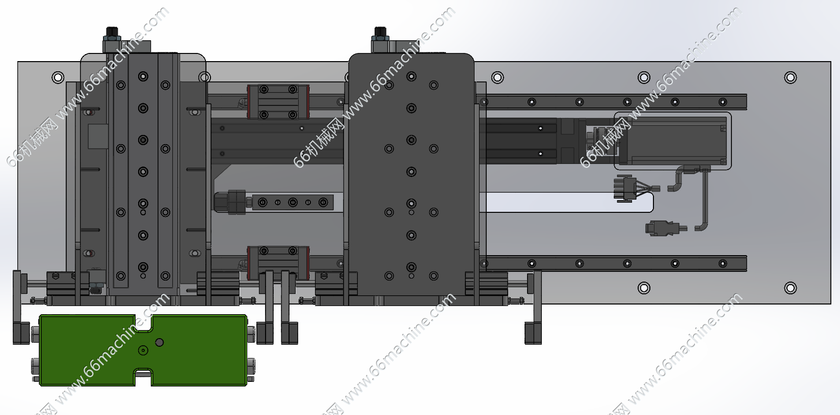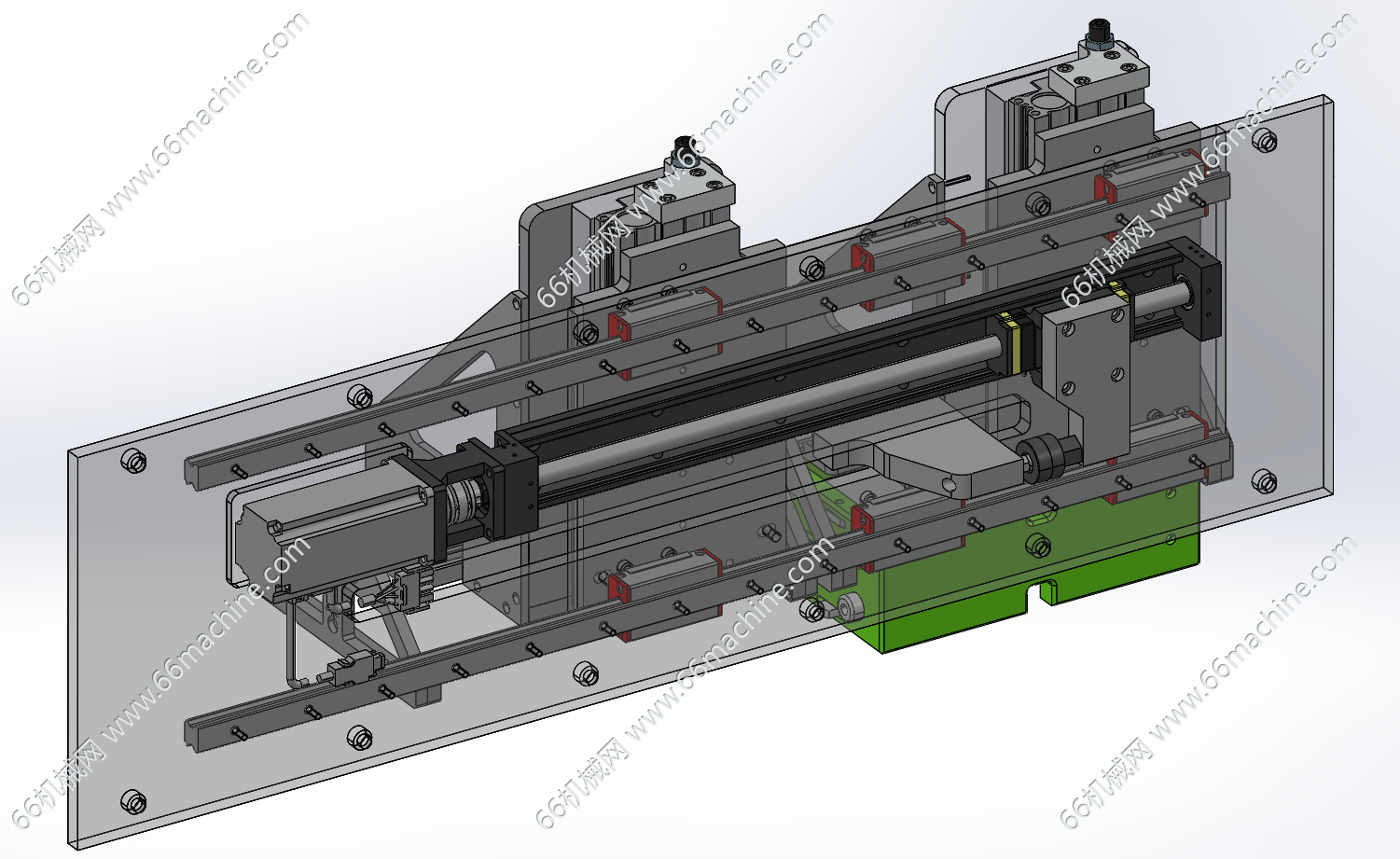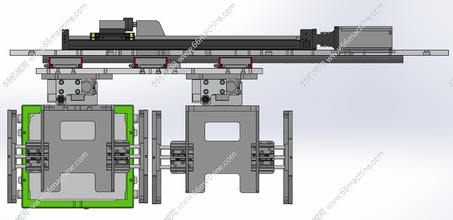 本模型为双工位箱体夹取搬运模组,由水平轴+升降轴+抓手组成,水平轴由直线导轨通过电机连接丝杆传动,升降轴和抓手均是气动驱动,可将箱体进行抓取搬运作业!