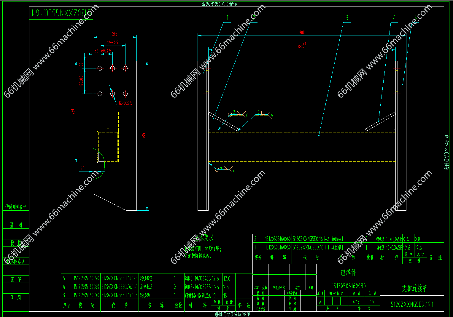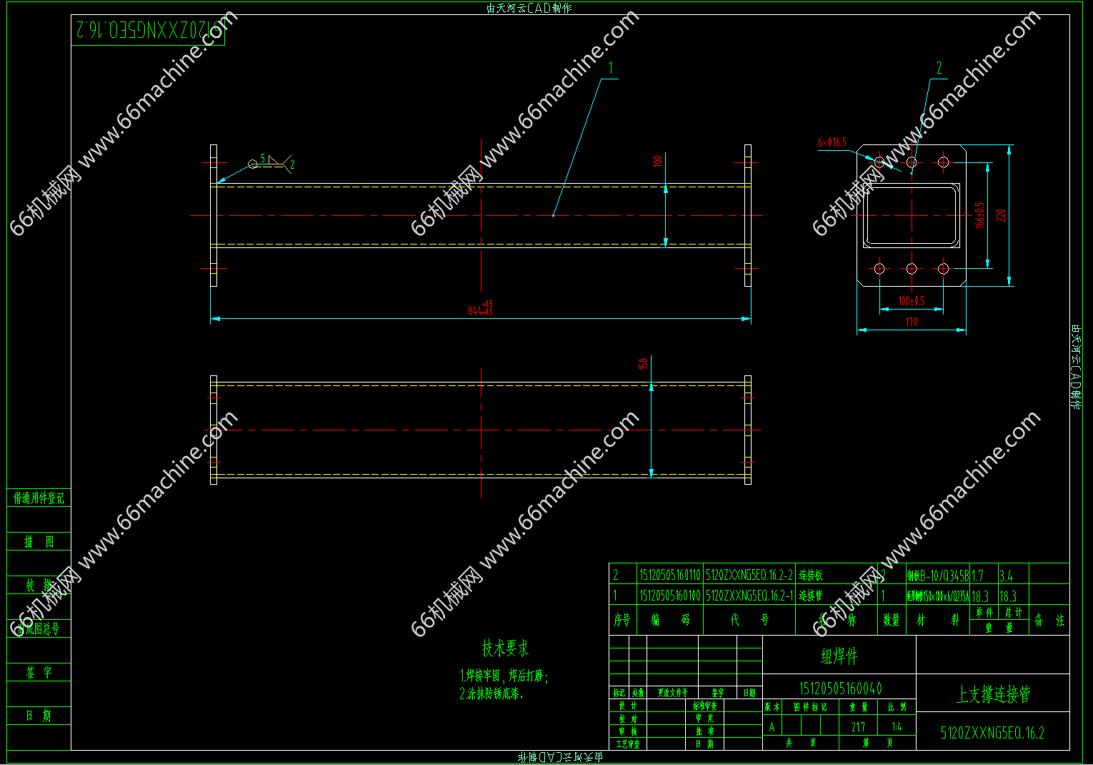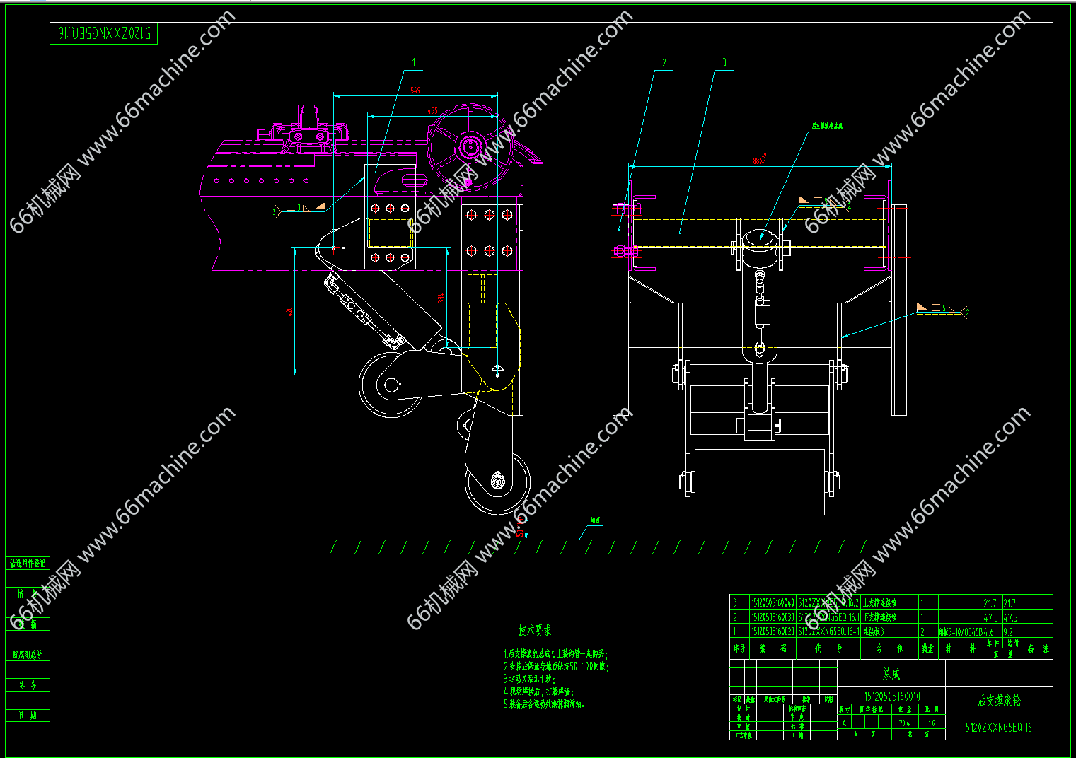 本图纸为车厢可卸式垃圾车的后支撑滚轮,由上、下支撑连接管和连接板等焊接成框架结构,搭配滚轮。装卸车厢时,滚轮能滚动,借助牢固的焊接结构支撑车厢,同时通过滚动减小摩擦,让车厢装卸更顺畅,稳定辅助车厢完成装卸动作。