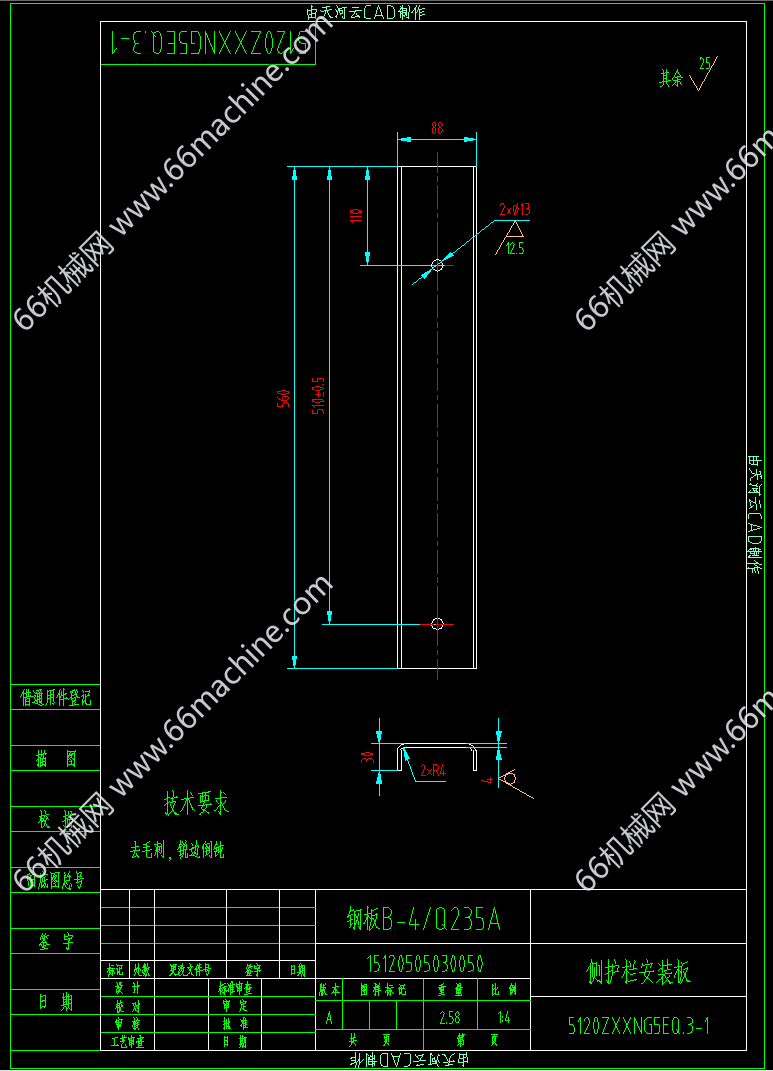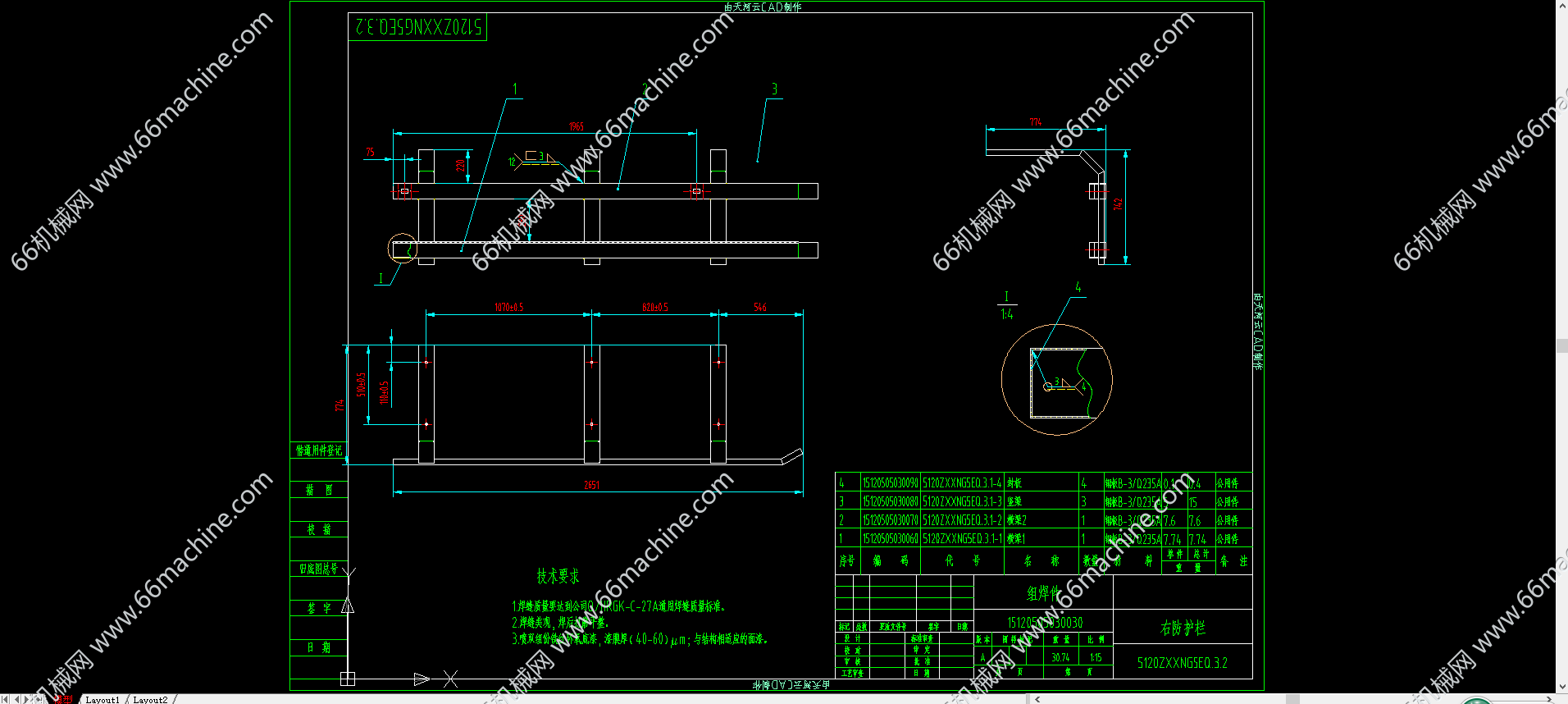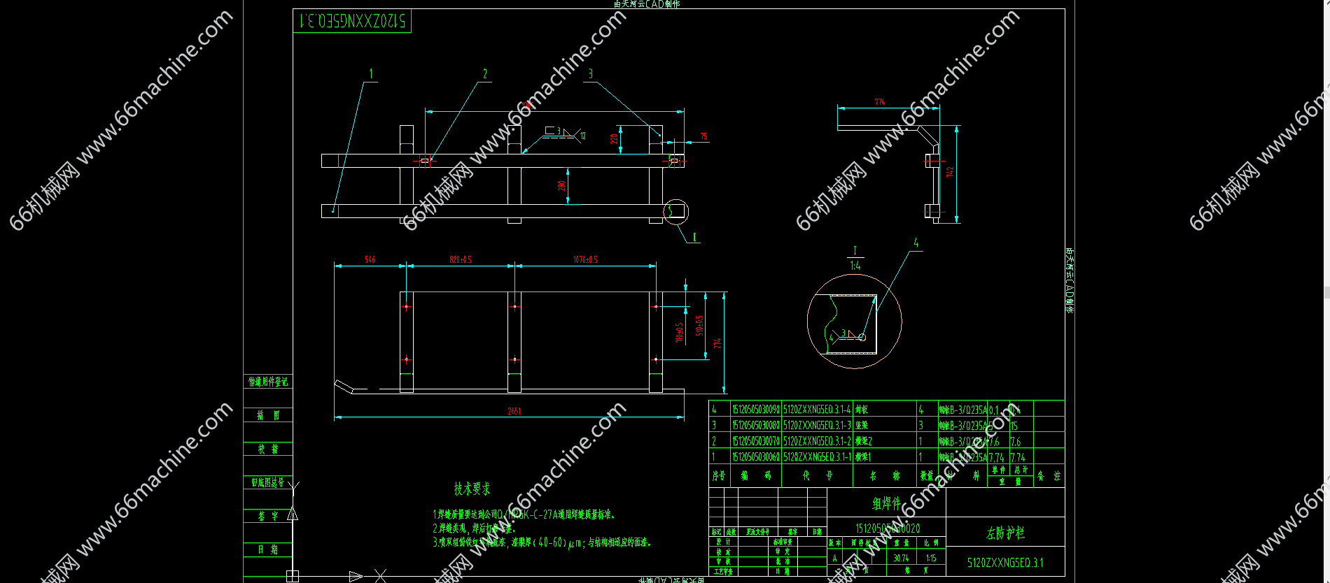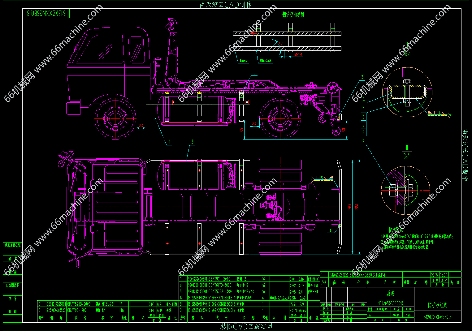 本图纸为车厢可卸式垃圾车防护栏,由横梁、竖梁等构件焊接而成,分左、右防护栏。它们安装在底盘两侧,通过牢固的焊接结构形成侧面防护屏障,行驶时可防止车辆侧面被剐蹭,同时保障行人与车辆安全,焊接质量可靠,使防护栏稳固耐用。