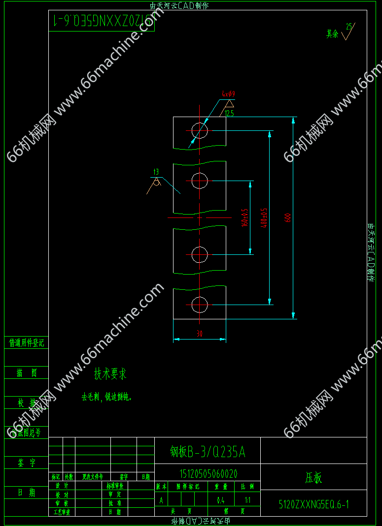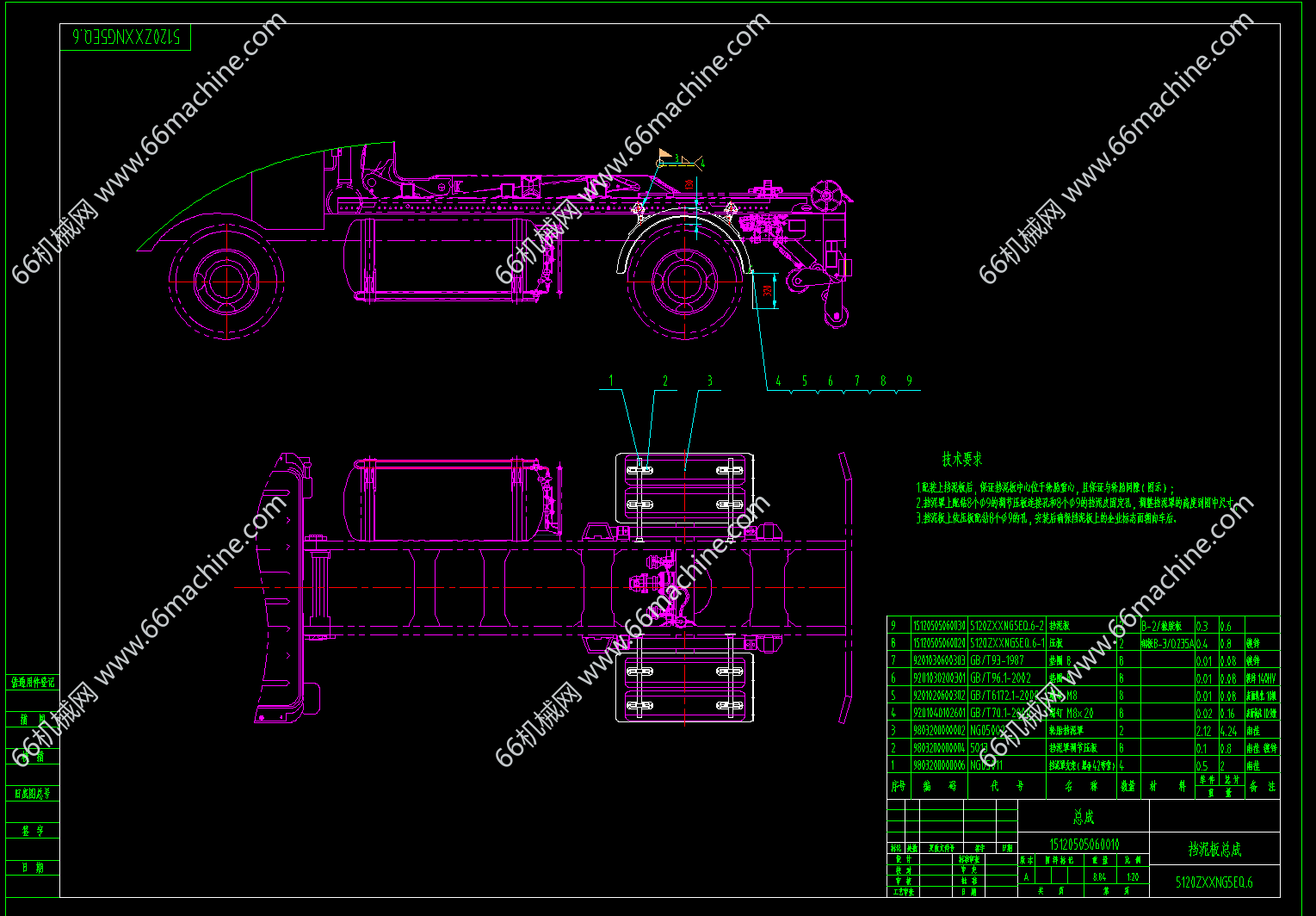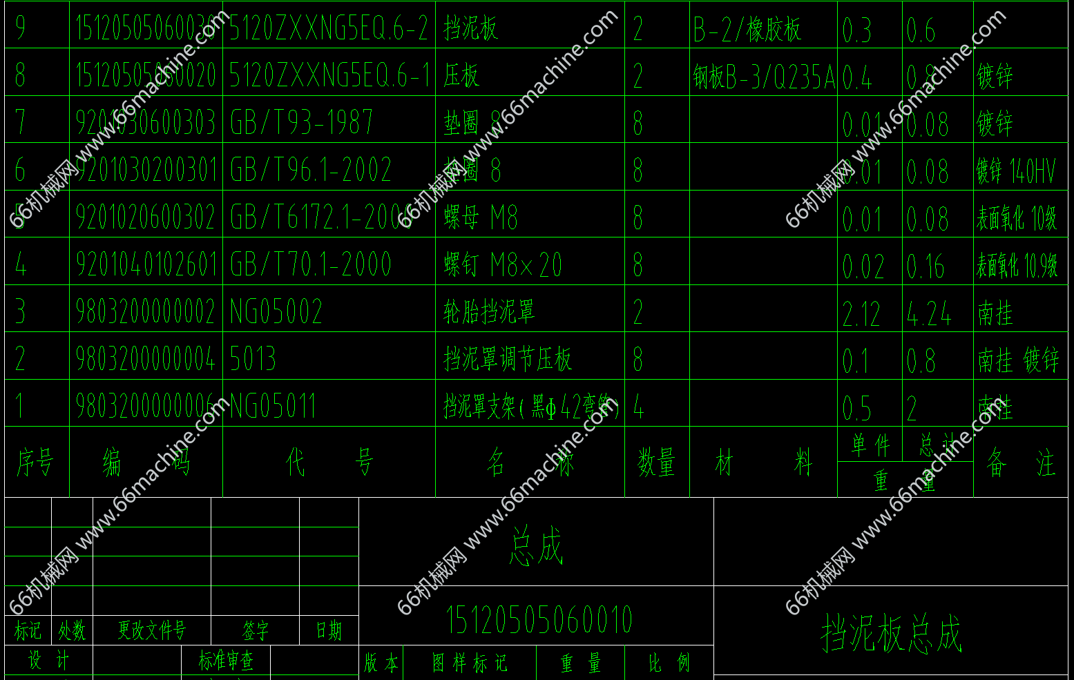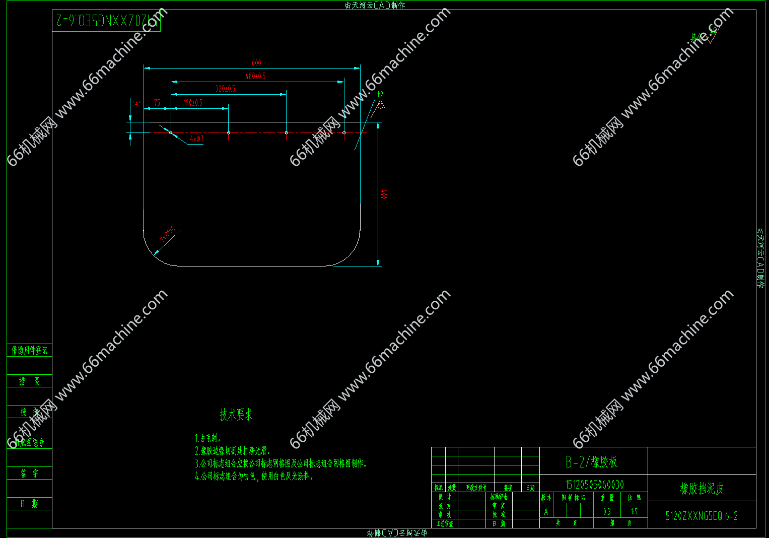 本图纸为车厢可卸式垃圾车的挡泥板,由橡胶挡泥板、金属压板等部件组成。通过压板等零件,将橡胶挡泥板固定在车轮旁,车辆行驶时,橡胶挡泥板能阻挡车轮溅起的泥水、杂物,避免车身和路面被弄脏,安装牢固,有效起到防护作用。