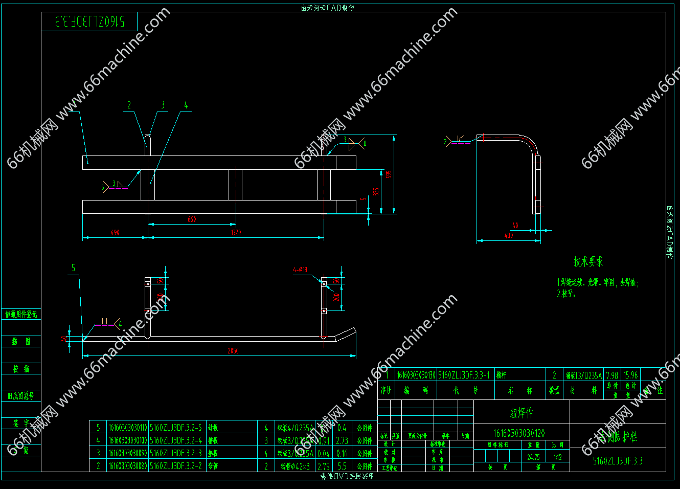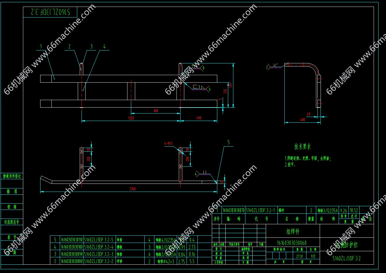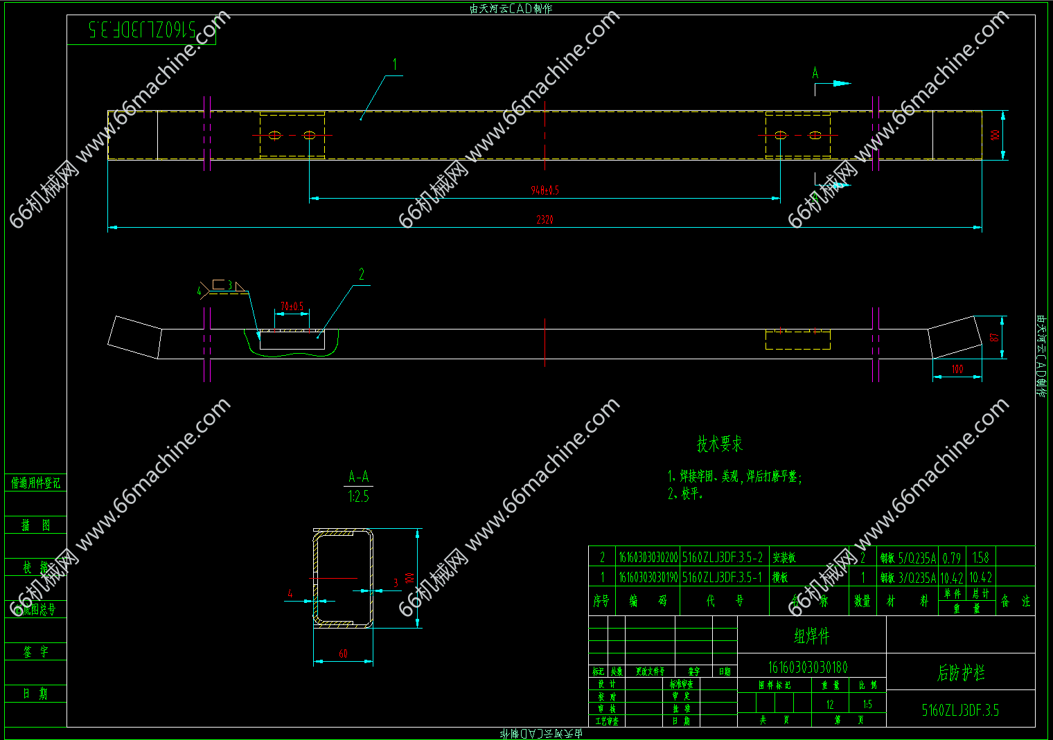 本图纸为5160ZLJ3DF自卸式垃圾车防护栏,由挡泥板、压板等组成。挡泥罩钻有调节板连接孔和固定孔,可调整高度;压板配孔,保证安装后挡泥板上企业标志朝后。车辆行驶时,它能阻挡车轮溅起的泥水、杂物,保持车身清洁,且安装牢固、装配美观,为行车安全助力。