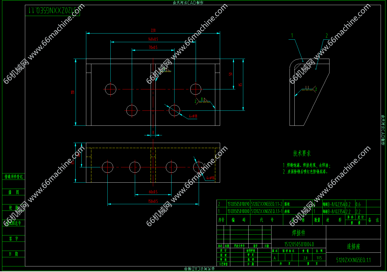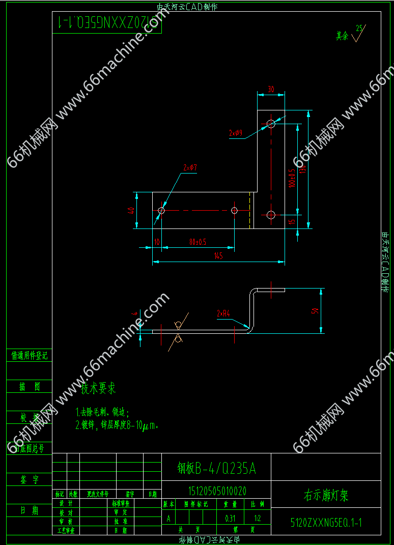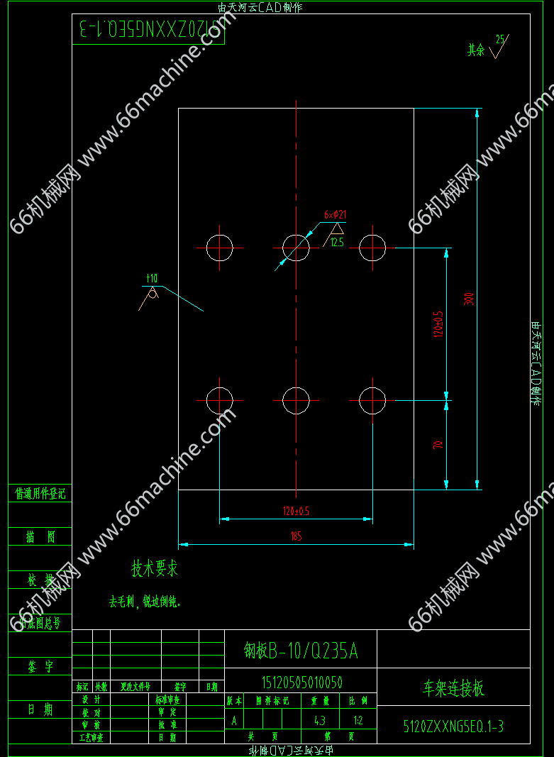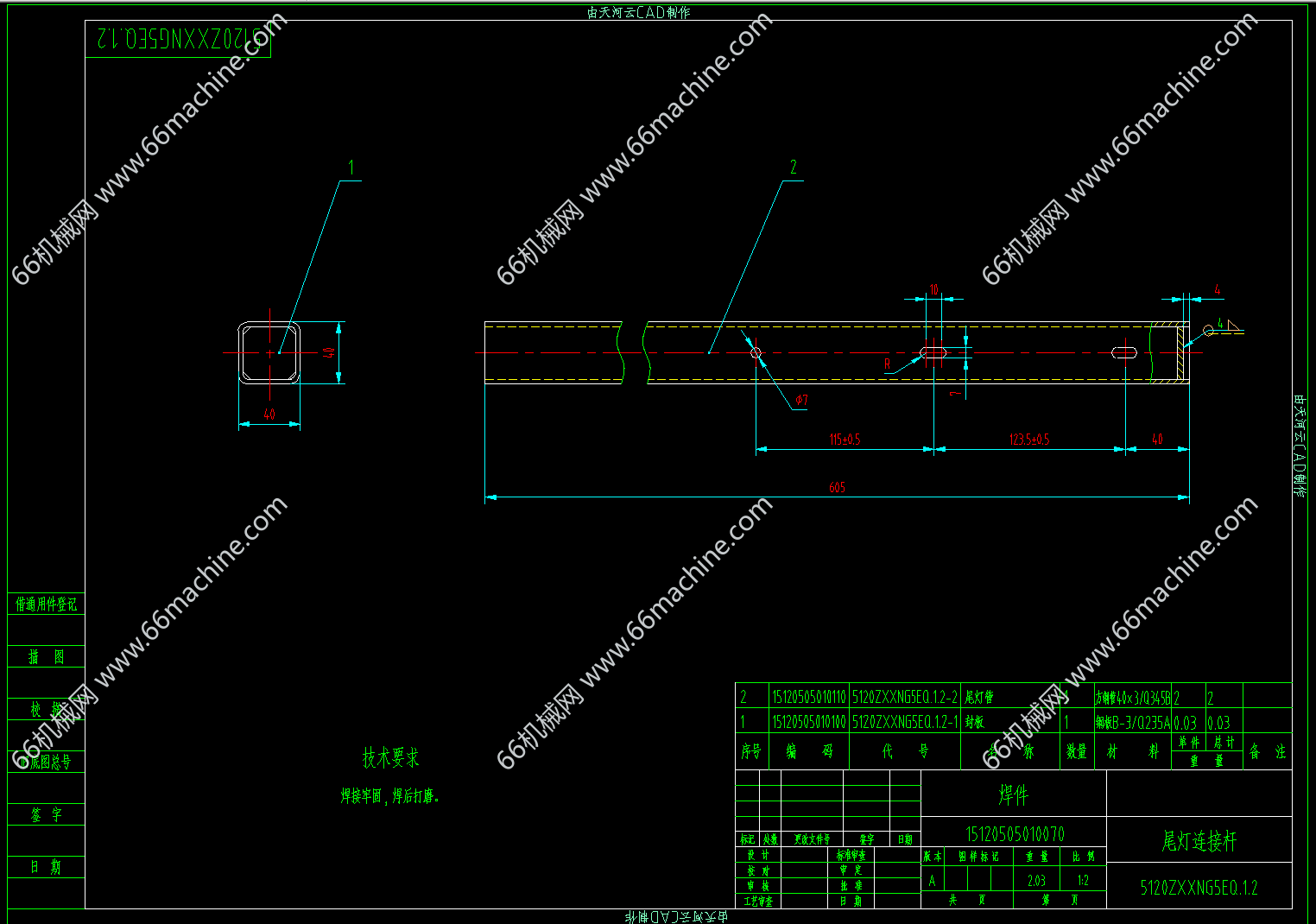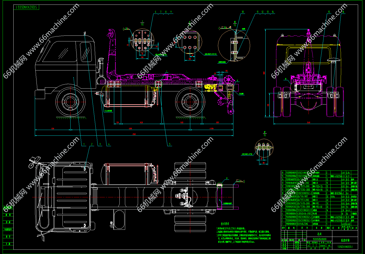 本图纸为车厢可卸式垃圾车底盘,通过焊接由钢板组成的连接座,再安装尾灯连接杆等部件,利用焊接与螺栓连接的方式,让底盘能稳定衔接可卸车厢,从而实现车厢的便捷装卸,满足垃圾转运的功能需求。