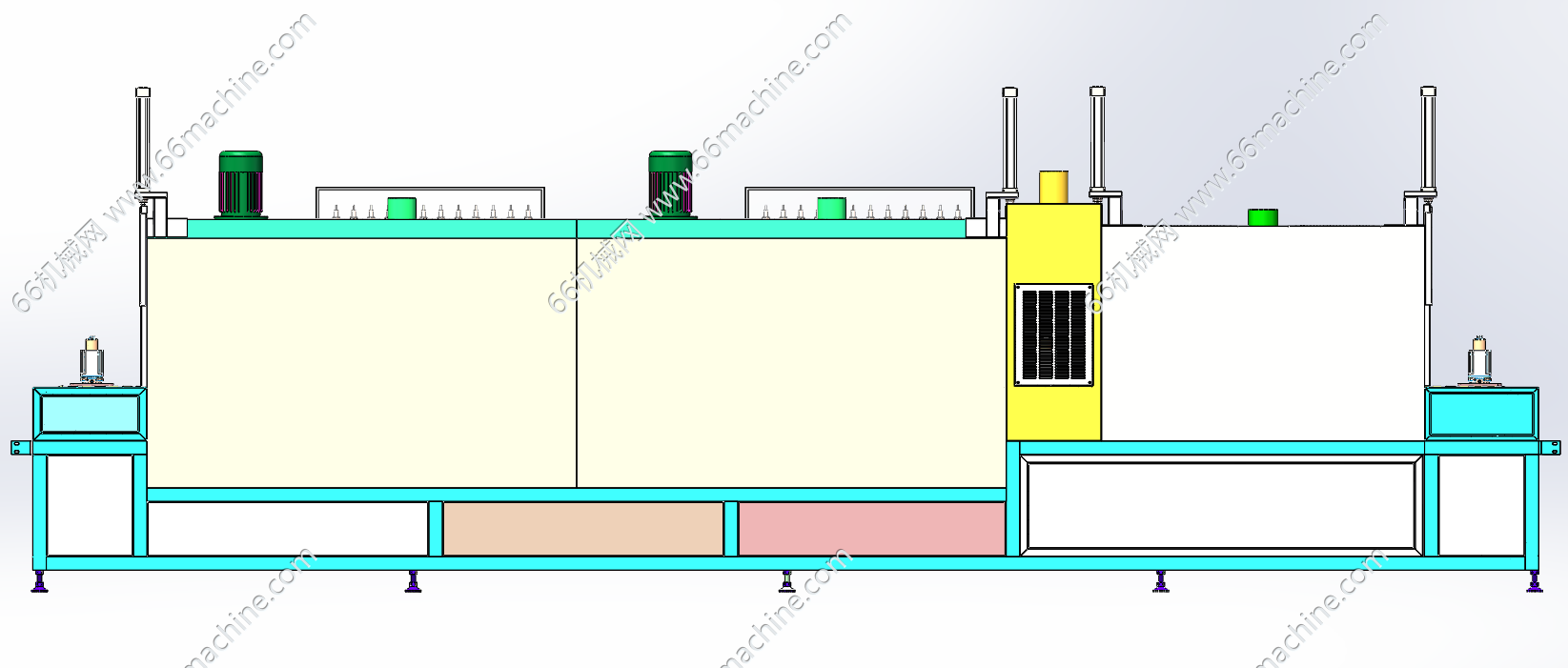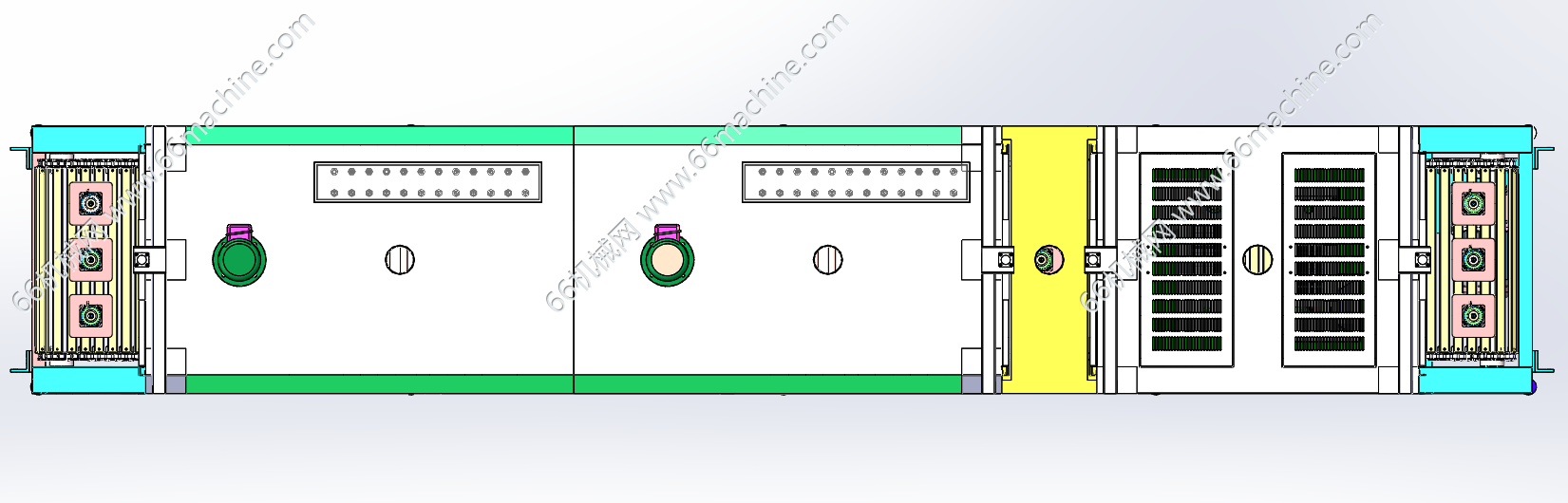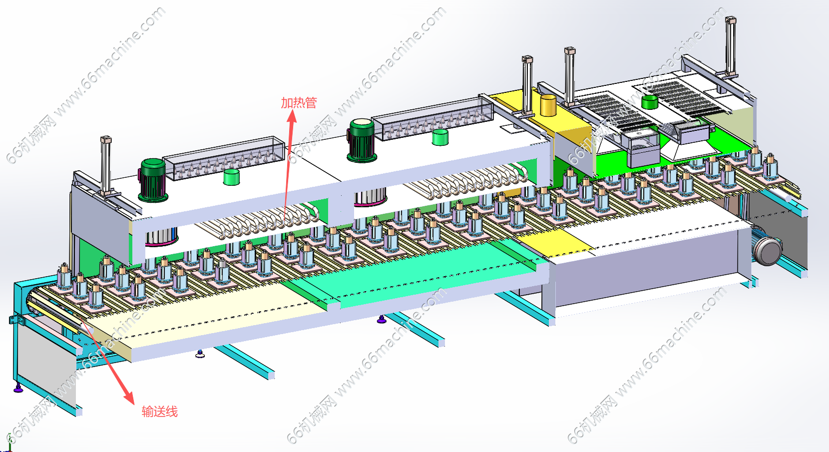 本模型为热风循环隧道烘干炉(循环隧道炉),是一种利用热风对产品进行热处理的工业设备,广泛应用于食品、医药、电子等行业,用于产品的烘烤、干燥、固化等工艺处理。