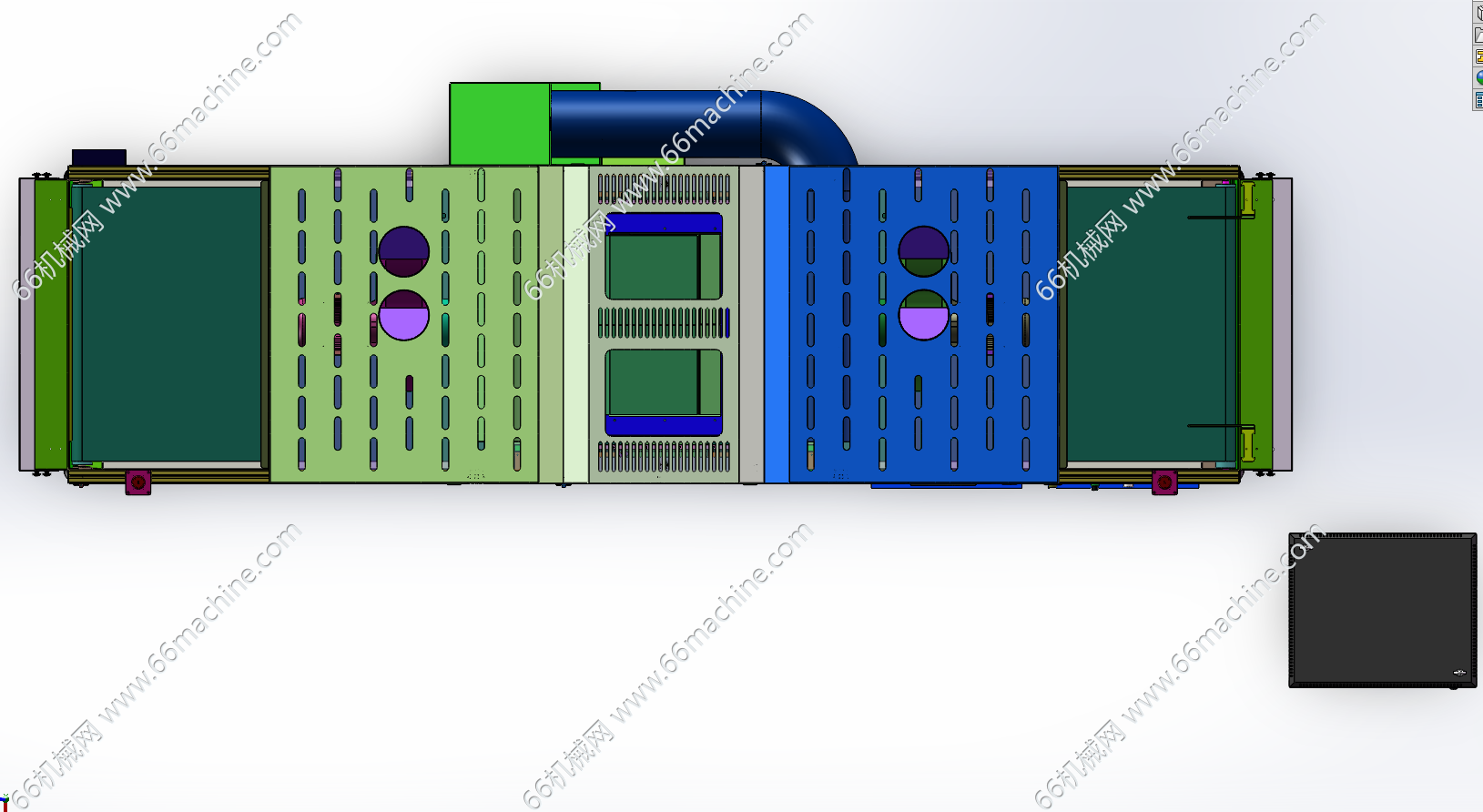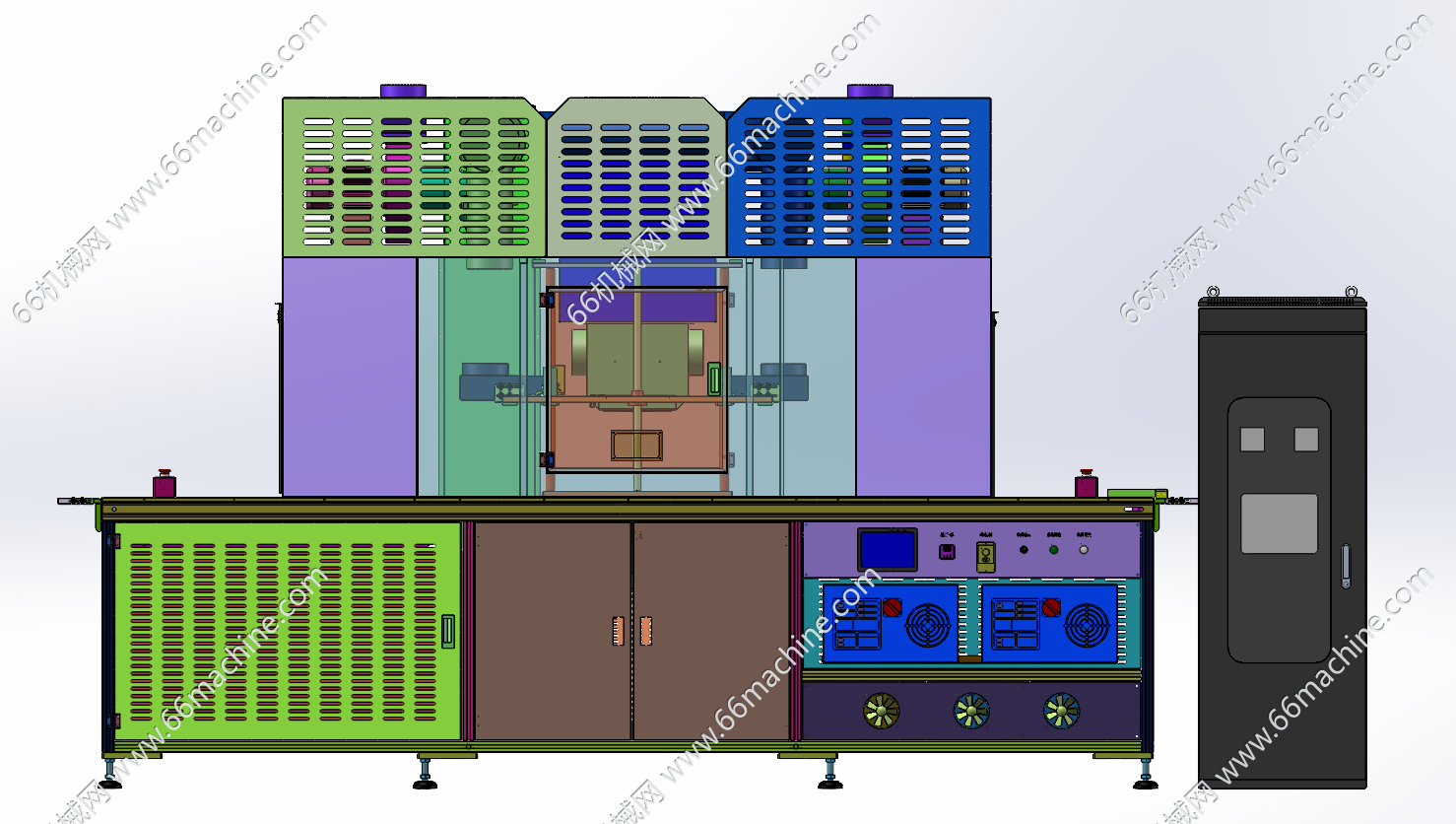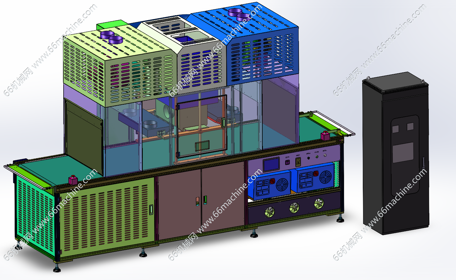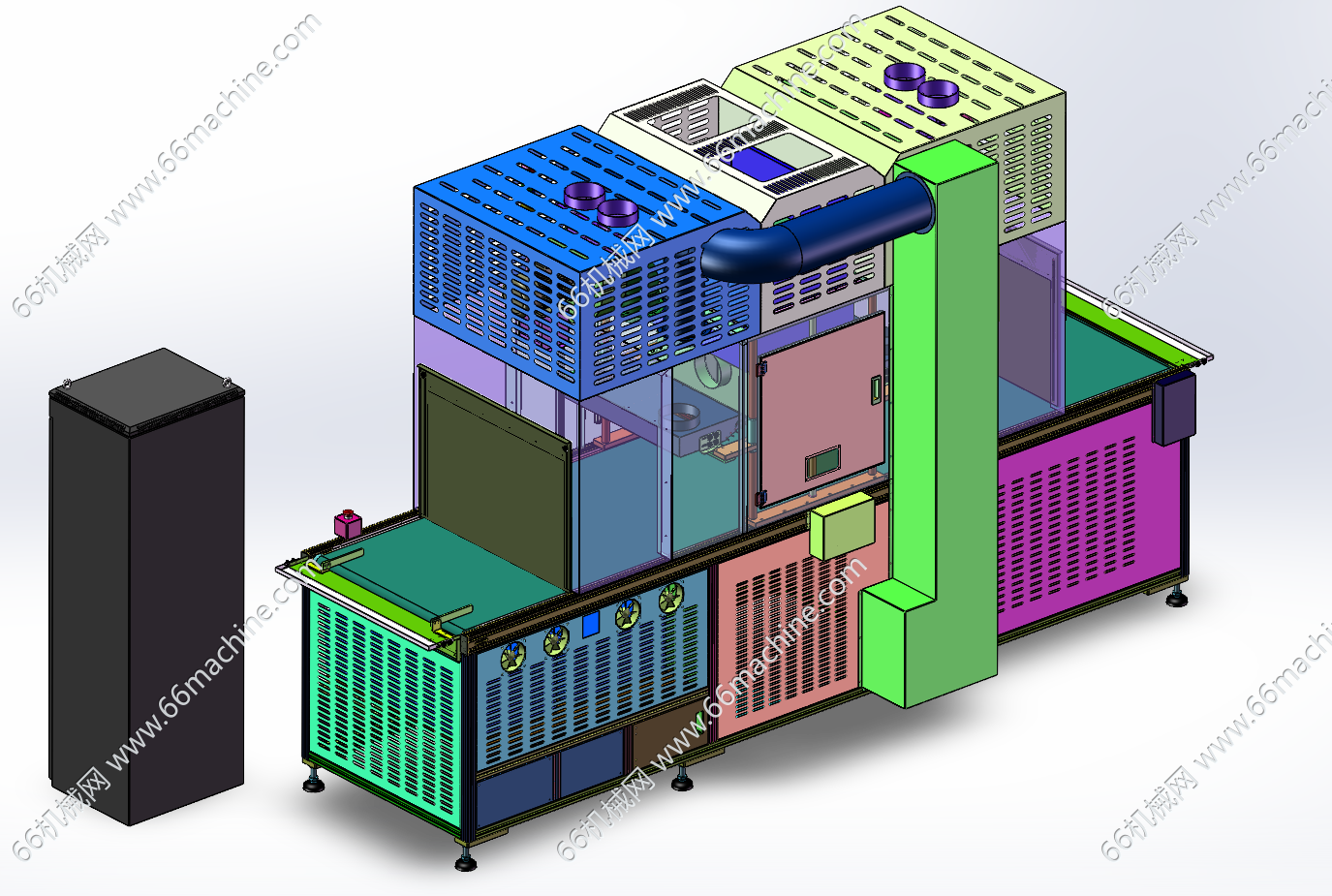 本模型为在线式UV固化机,主要由下机架、机罩、皮带输送线、UV灯模组、风机通风组件、电控柜等组成,适用于PCB板阻焊固化、显示屏、电子产品点胶后的固化作业,通用性强,欢迎参考!