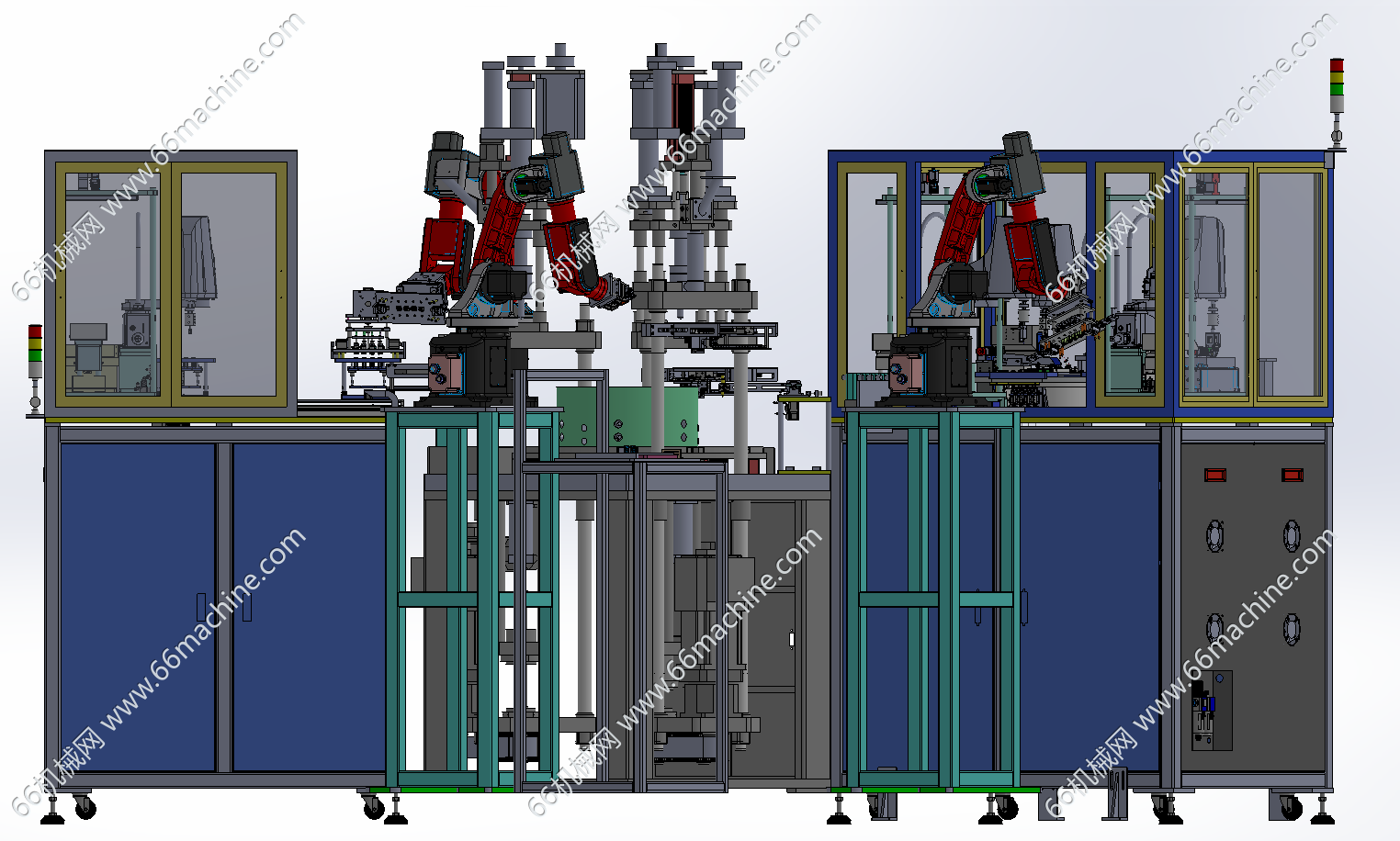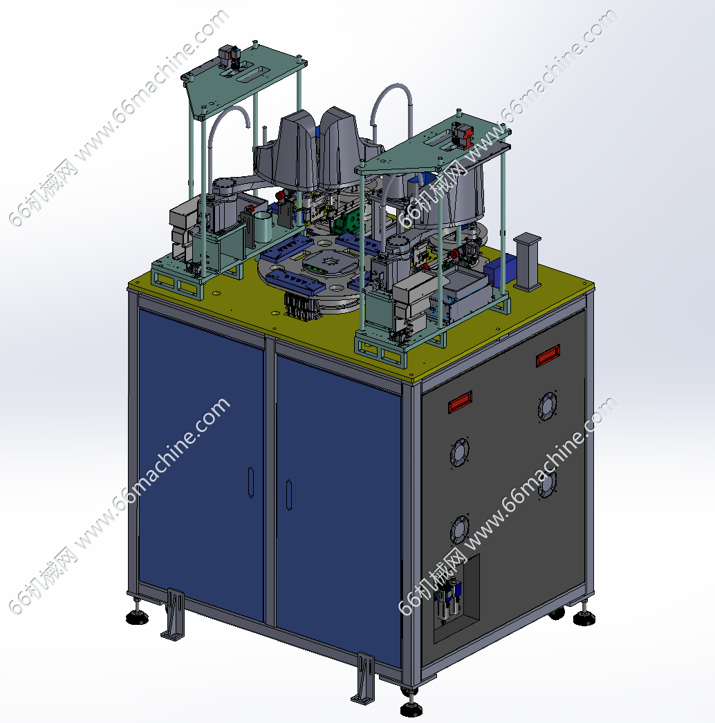 本设备为某企业机器人上下料的工件植入注塑机,主要由四轴机器人供料机、工件植入机器人、成品取出机器人及注塑机组成,采用2组机器人将AB部件注入后再注塑成型,然后由取料机器人将工件放入料盘内,仅供大家参考!