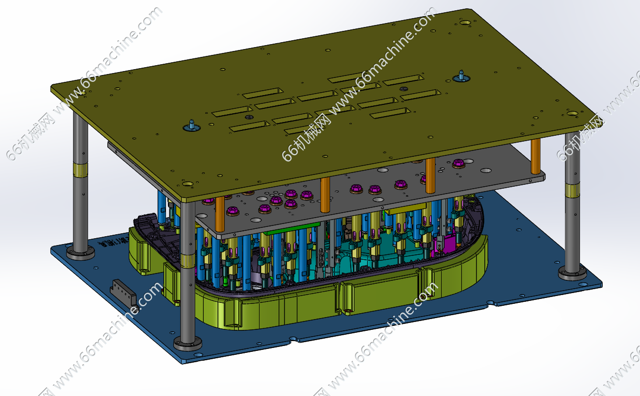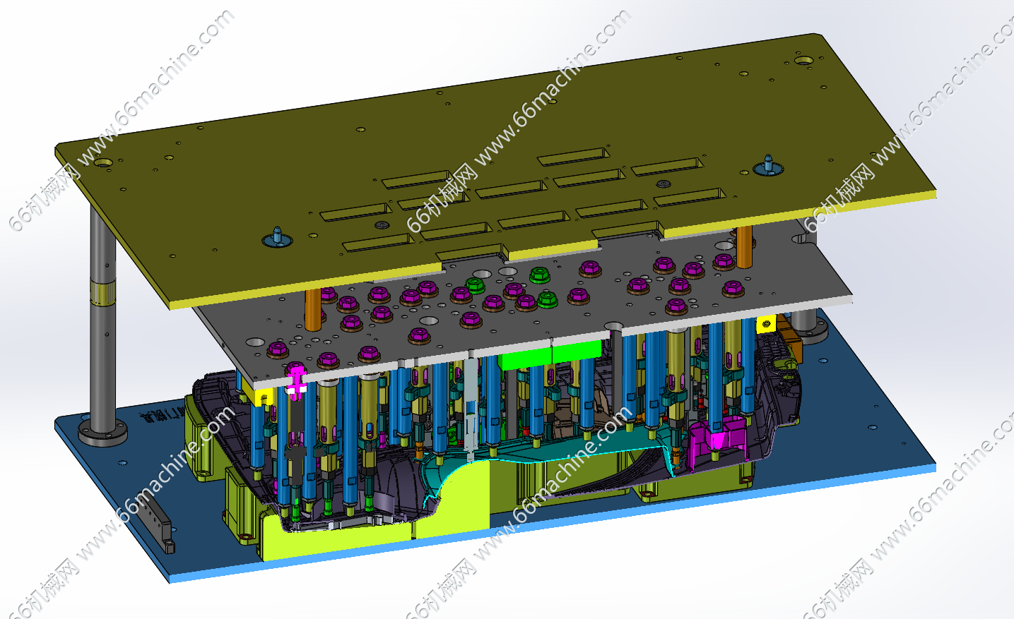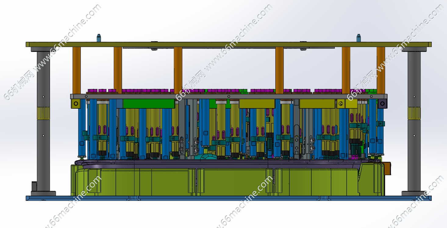 本模型为汽车左前车门内护板热熔铆焊模具,此模具用于左前车门内护板零件的热熔铆焊,由上下模两部分组成,上模由数个热熔焊头和上模板组成,下模是一个仿形的模穴,用于定位放置左前车门内护板。