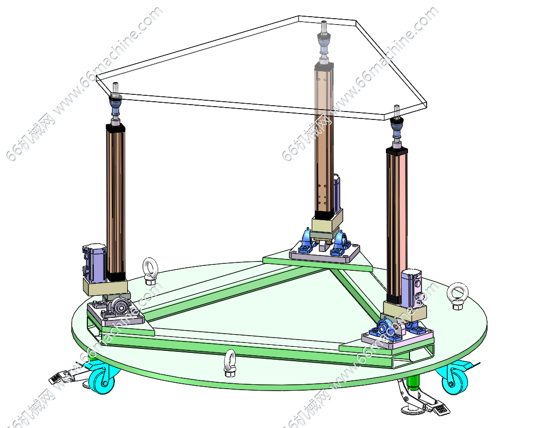 本模型为三自由度平台,由上平台、下平台以及连接上下平台的铰链和电动缸组成。上平台用于搭载被模拟动作的机构,下平台固定在基础上。广泛应用于飞行模拟器、舰艇模拟器、汽车驾驶模拟器等,可模拟出各种空间运动姿态,为操作人员提供逼真的训练环境。