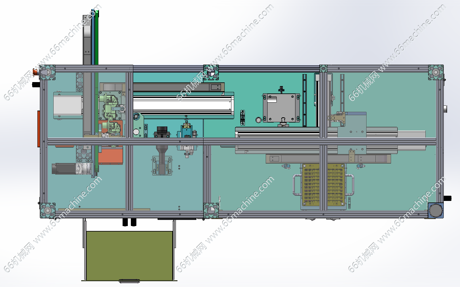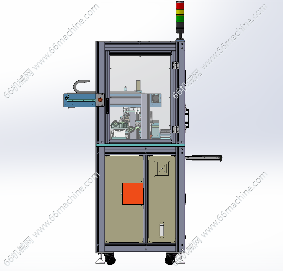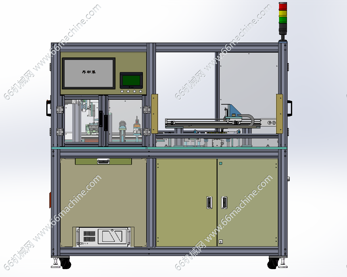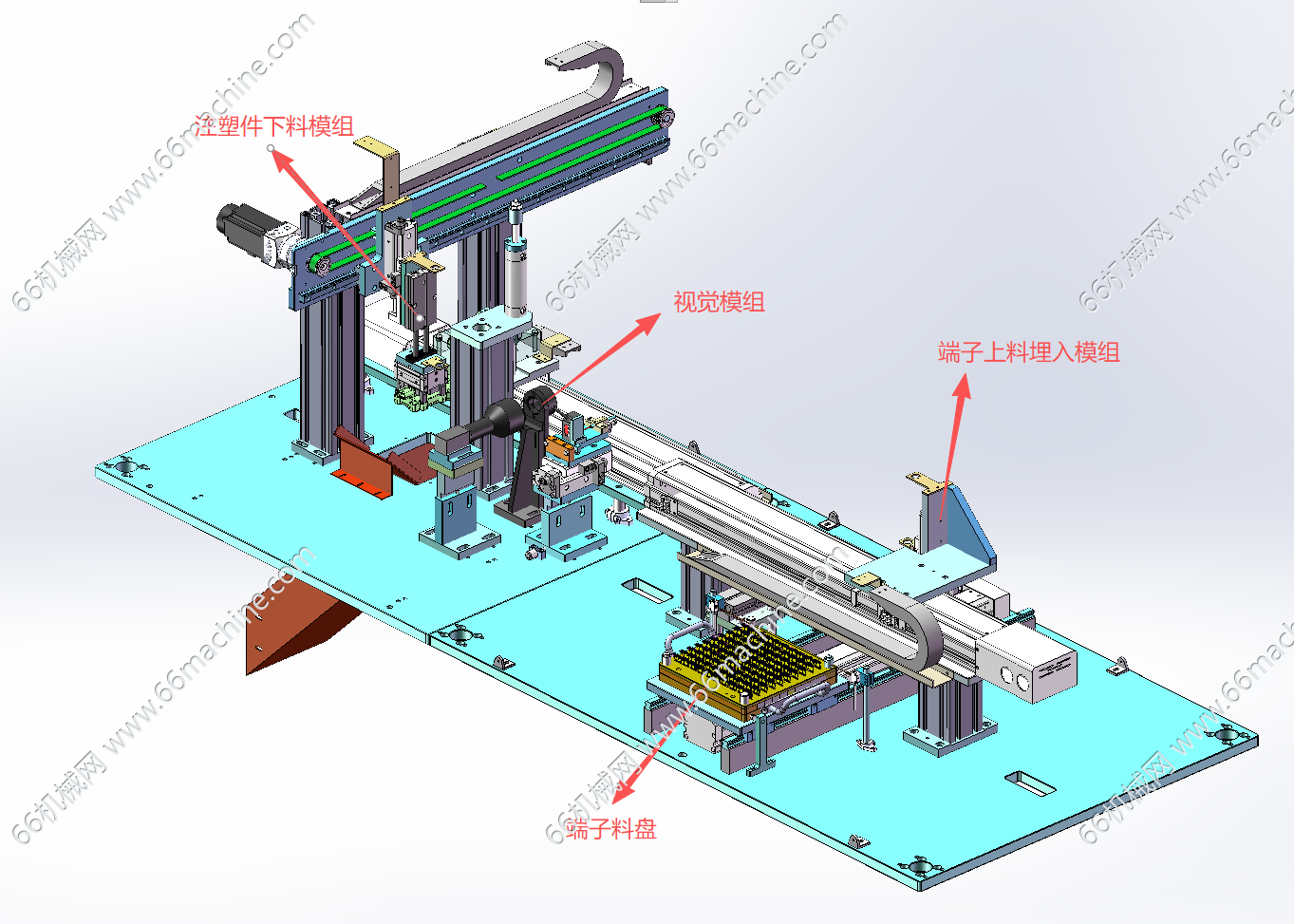 本模型为注塑件端子埋入、检测机,主要由下机架、机罩、端子上料埋入模组、视觉检测模组、注塑件下料模组等组成,该设备主要用于注塑件端子的埋入及检测作业,欢迎参考!