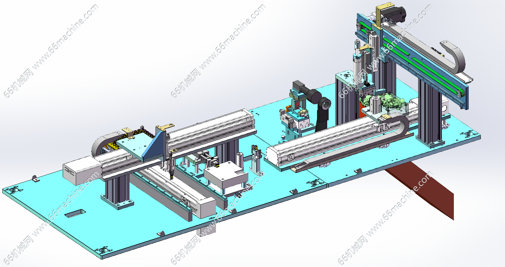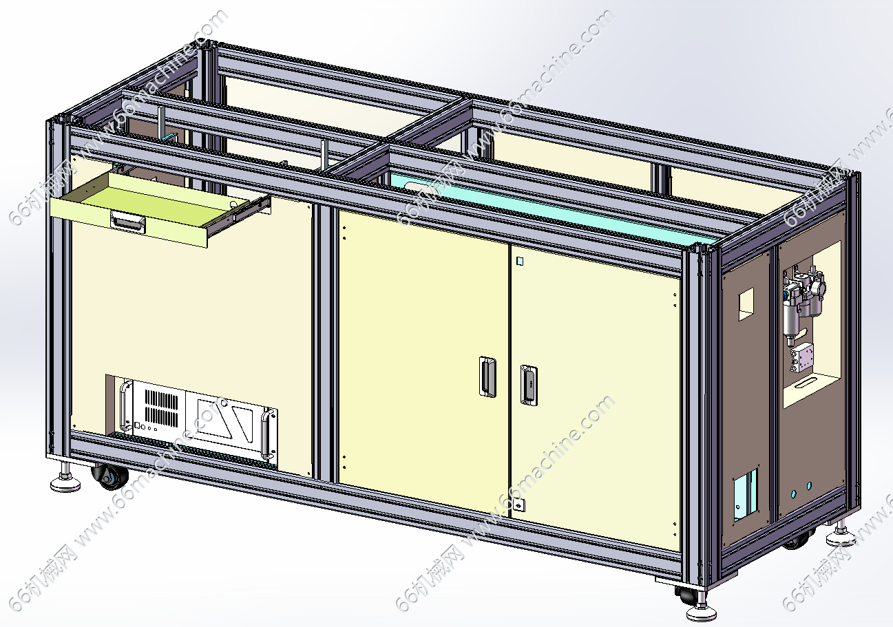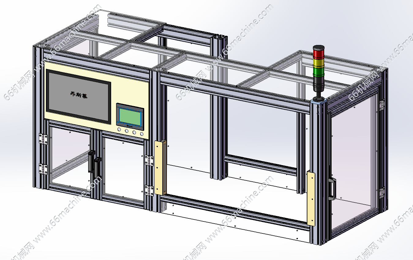 本模型为注塑件端子埋入、检测机,主要由下机架、机罩、端子上料埋入模组、视觉检测模组、注塑件下料模组等组成,该设备主要用于注塑件端子的埋入及检测作业,欢迎参考!