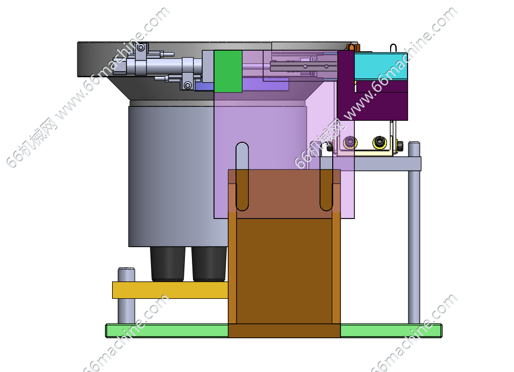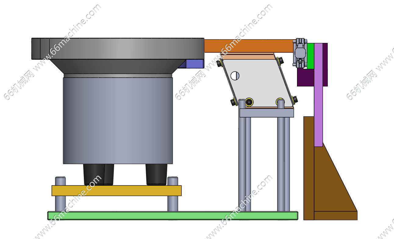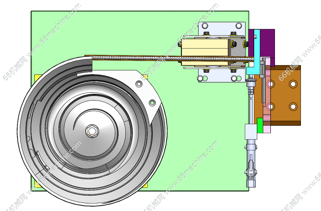 本模型为振动盘自动上料装置,由带螺旋料道的振动盘主体、直振送料轨道、气动定推料机构及安装底座组成,通过电磁振动原理实现小型零件的自动排序、定向筛选与连续供料,结构紧凑、自动化程度高,广泛应用于电子、五金、塑胶等行业的自动化生产线,可替代人工上料,大幅提升生产效率与供料精度。