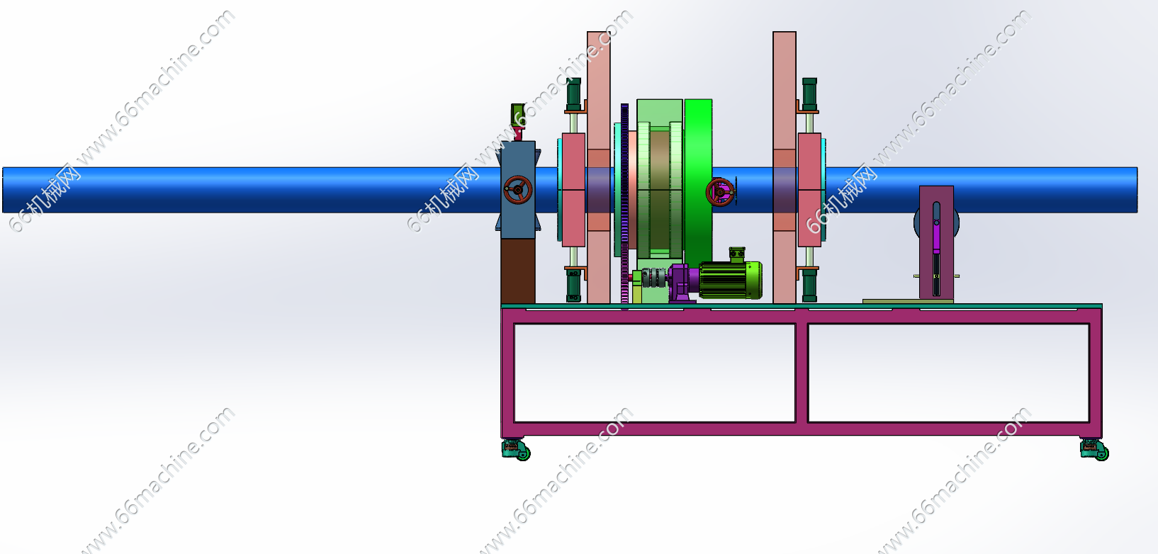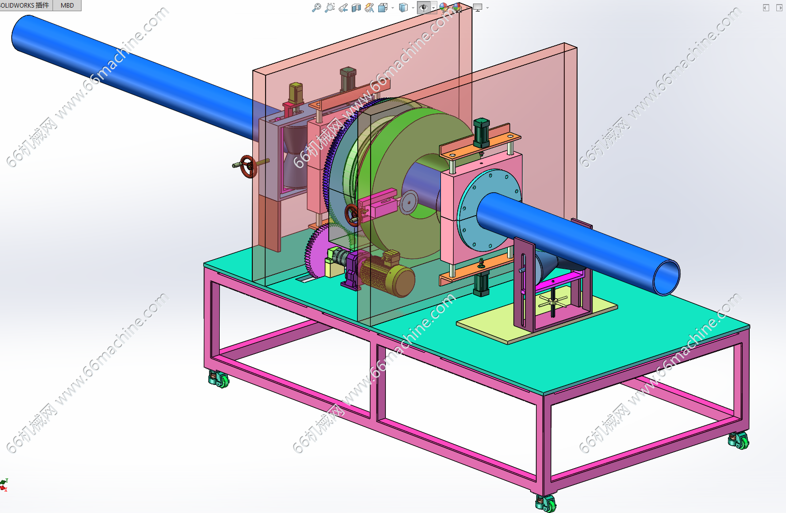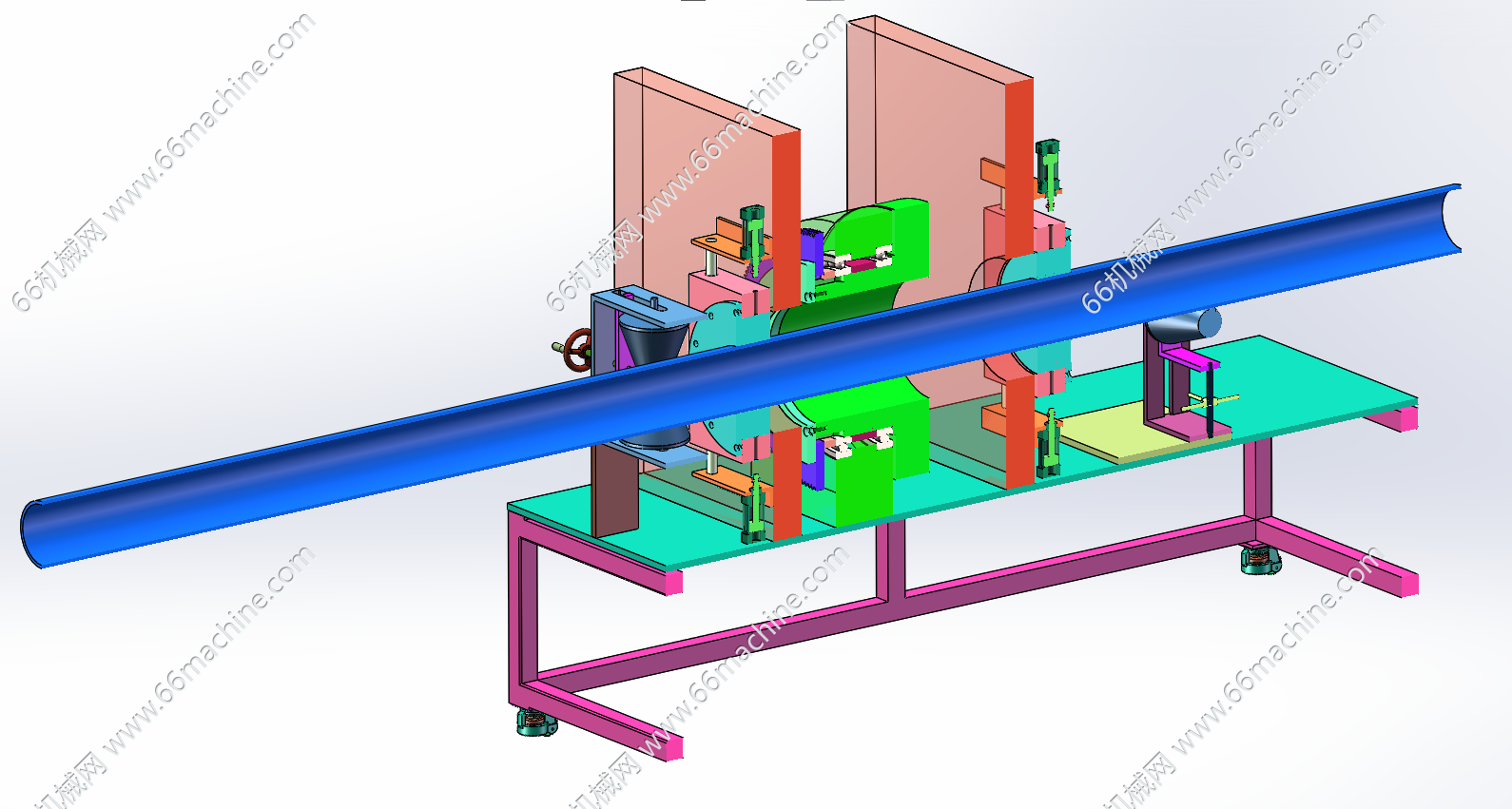 本模型为环形切割机,主要由机架、气动夹紧机构、送料模组、切刀模组等组成,采用电机驱动大齿轮盘旋转进而实现环切,旋转刀片式无屑切割机,切口平整光滑无毛屑,可对PPR、PE塑料等管材进行切割作业。