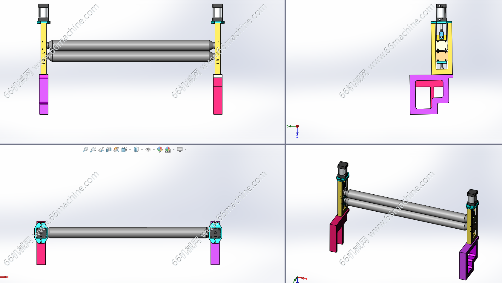 本模型为气动压辊,采用顶部二组气缸驱动上压辊进行下压,可用于板材矫正,也可用于剪切后的板材/钢带边部毛刺压平,包含工程图,可以直接套用,节省建模时间!