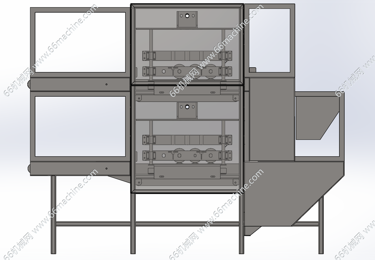 本模型为双层破泡辊筒线(破泡机),主要对海绵产品进行破泡,增加海绵产品的使用寿命,优化使用效果,通过上下相互啮合的压辊组进行挤压,将制品中的气泡挤破,且气泡破孔小,撤压后材质的硬度几乎没有变化,保证了制品的高缓冲、慢回弹的特性。