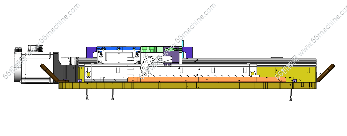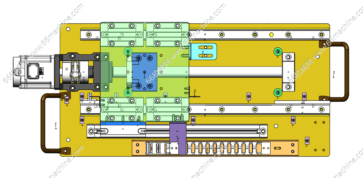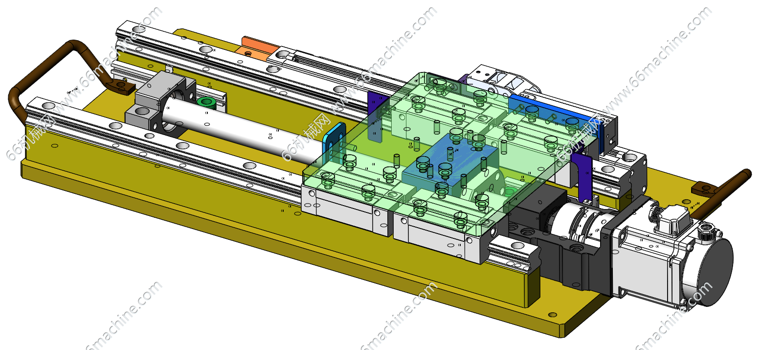 本模型为伺服丝杆直线滑台,以伺服电机驱动滚珠丝杠、配合双线性导轨实现高精度直线运动,滑台搭载可快速更换的柔性工装治具以适配不同工件,底座设有限位与防碰撞保护结构,整体具备高精度、高刚性与柔性化特点。