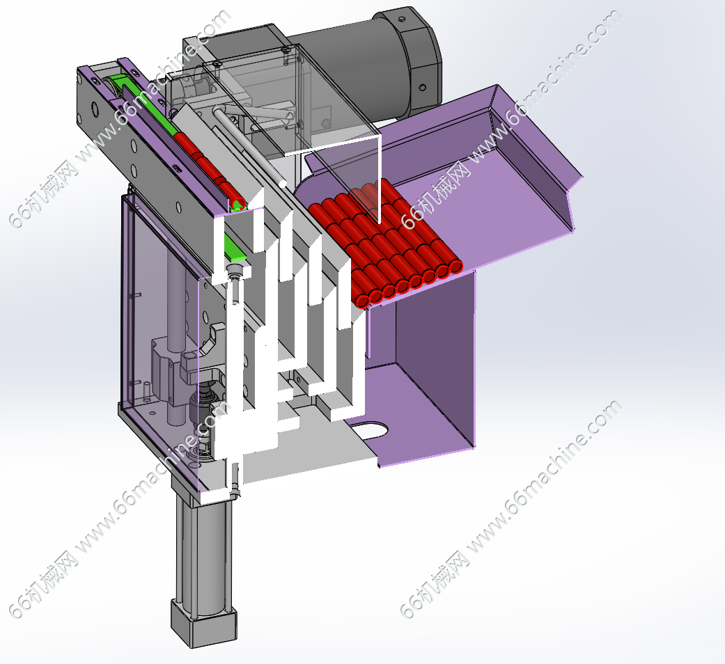 本装置为四级推板供料机构,是一种专门用于定向、有序地输送圆柱形或圆管形工件(如轴、金属管、塑料管、电池等)的自动化设备。其核心思想是利用一个往复直线运动的推板,将杂乱或堆叠的圆管物料逐个分离并推送到指定位置。