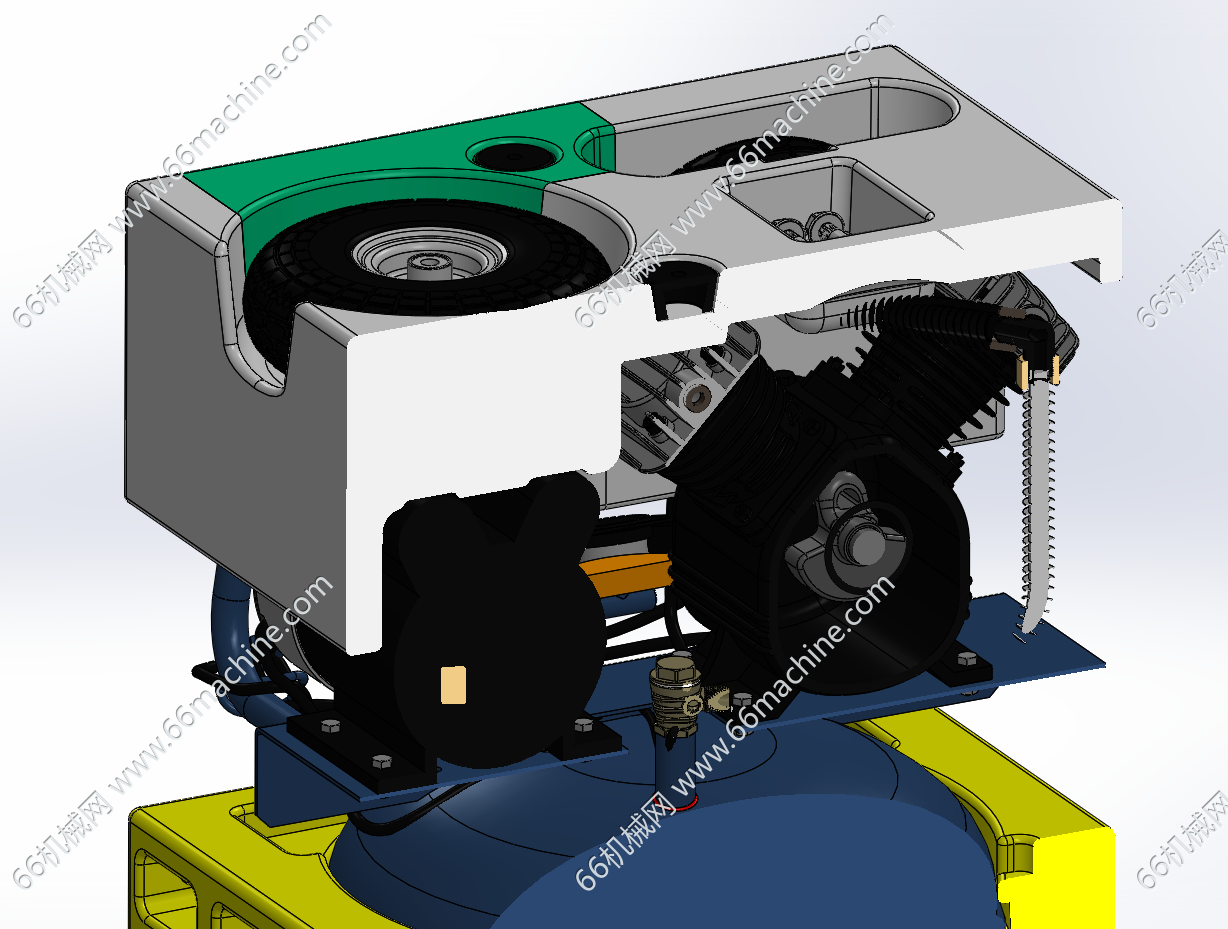 本模型为立式双缸空气压缩机空压机),由电机、曲轴箱、气缸、缸盖、罐体、脚轮、调压阀、压力表、连杆、脚垫等部件组成,是一种用于将电机的机械能转换成气体压力能的装置。采用曲柄连杆往复活塞式结构,是气动系统的核心设备,欢迎下载参考!