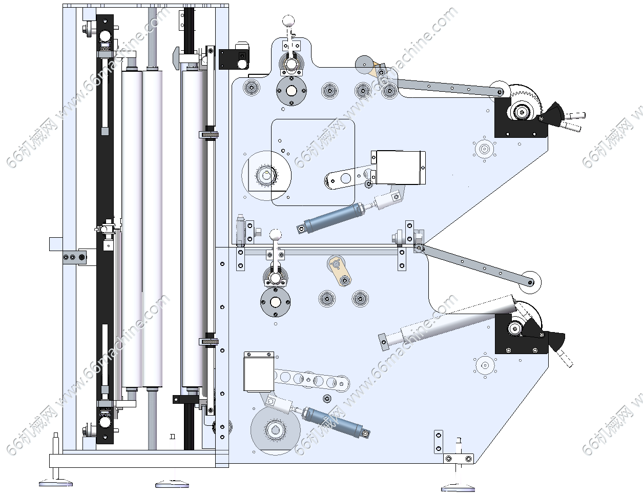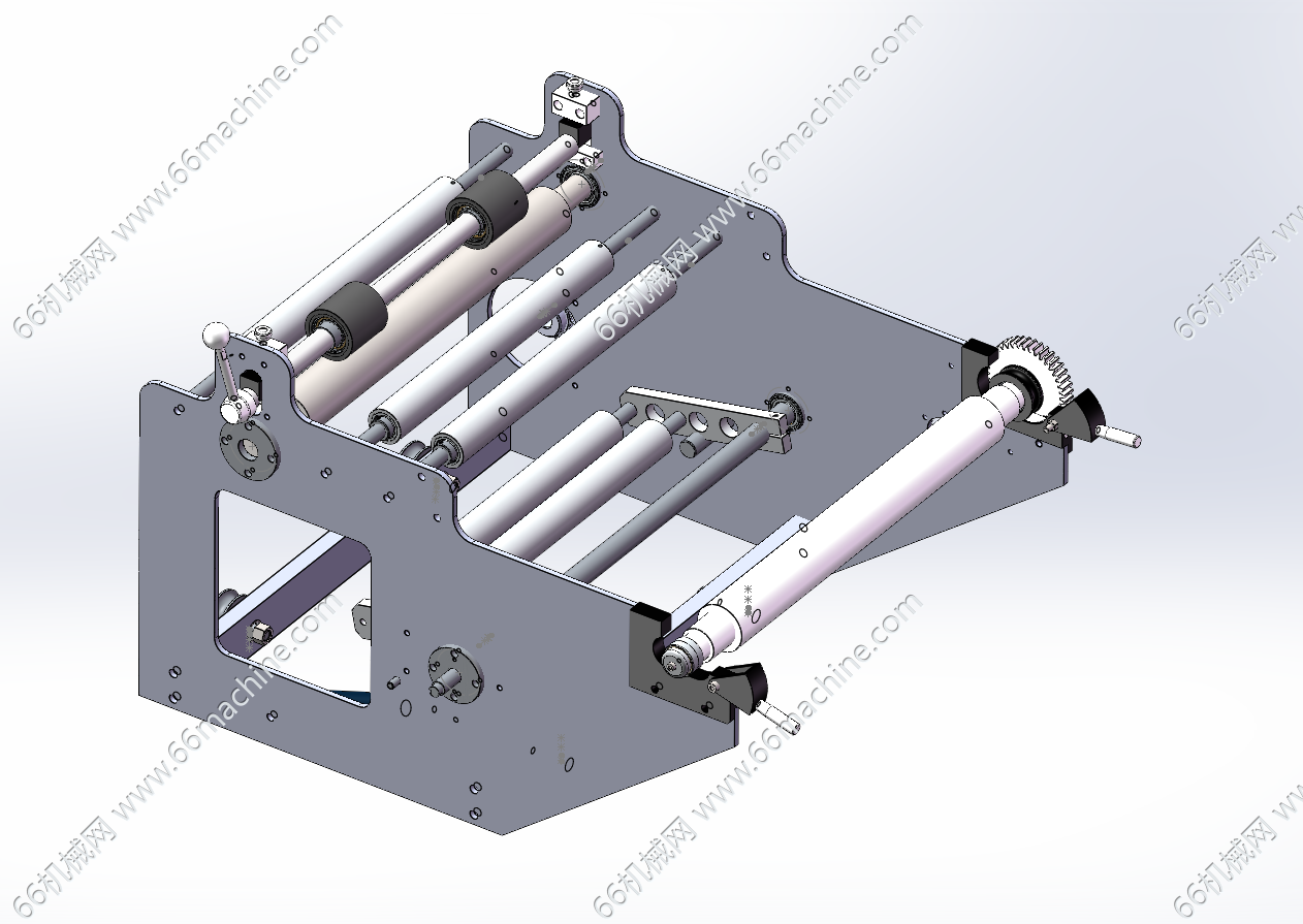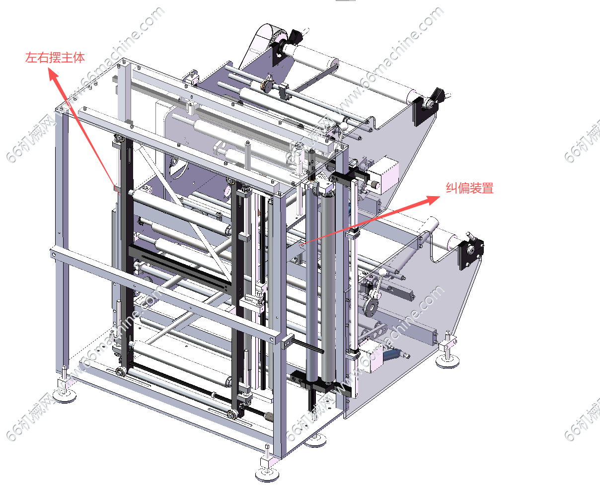 本模型为带纠偏及交替上料的制袋机放料段,包含机架、放卷上装置、左右摆主体、压辊装置、纠偏装置等,用于制袋机原材料(薄膜或布料卷)的自动供料,欢迎参考!