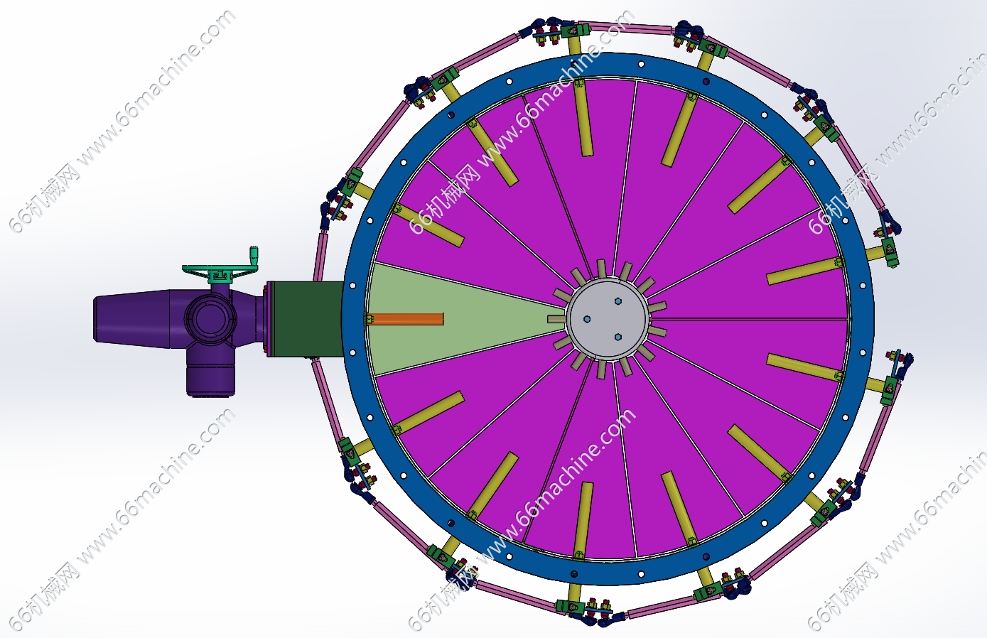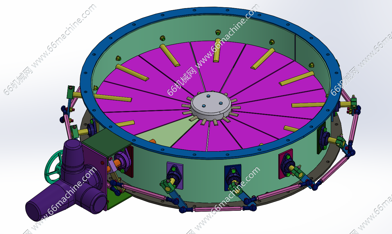 本模型为手动连杆启闭卸料口(阀门),采用手轮驱动连杆动作实现多组叶片的同步联动开启/关闭,也可采用电驱动连杆。可作为粮仓、颗粒物料的卸料口,欢迎参考!