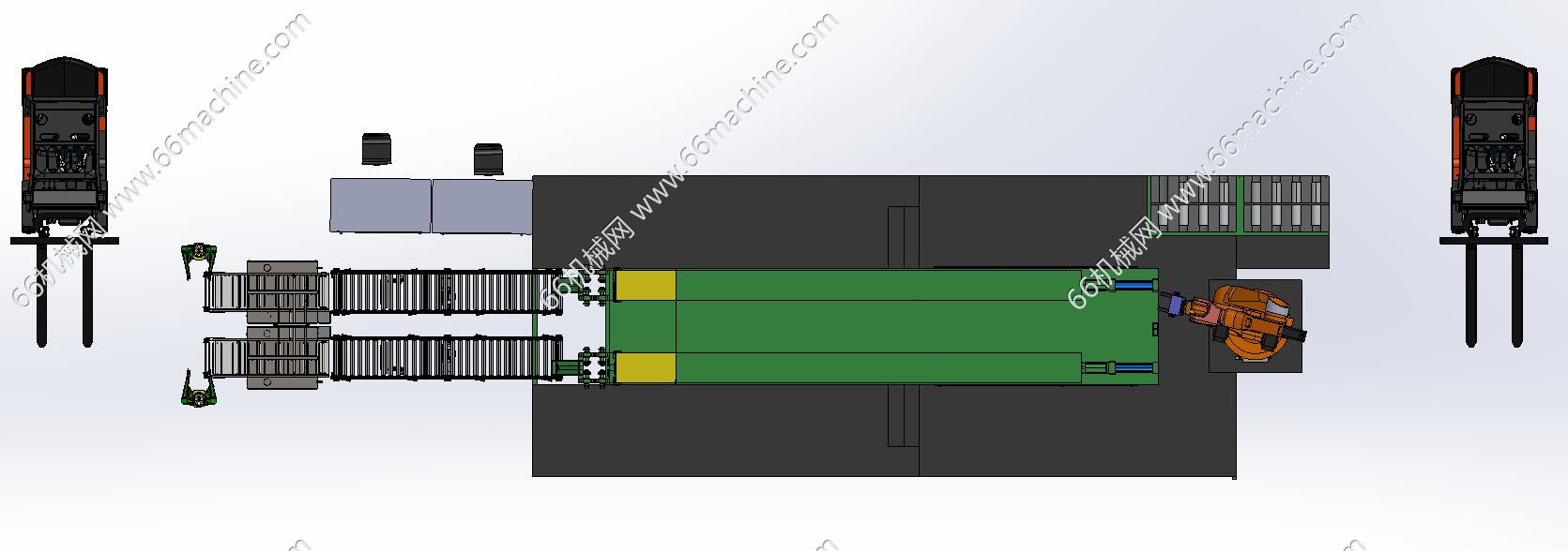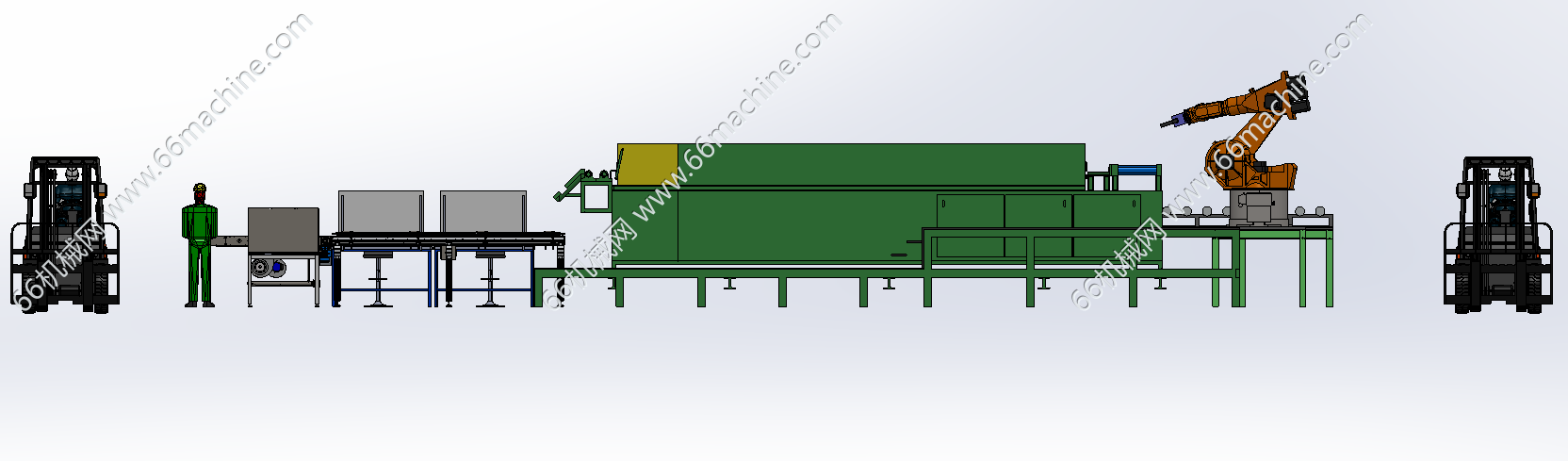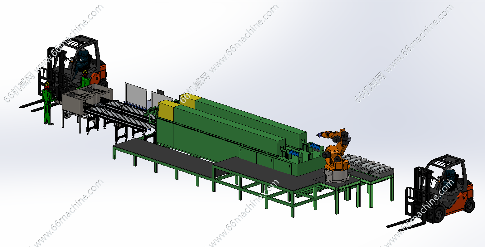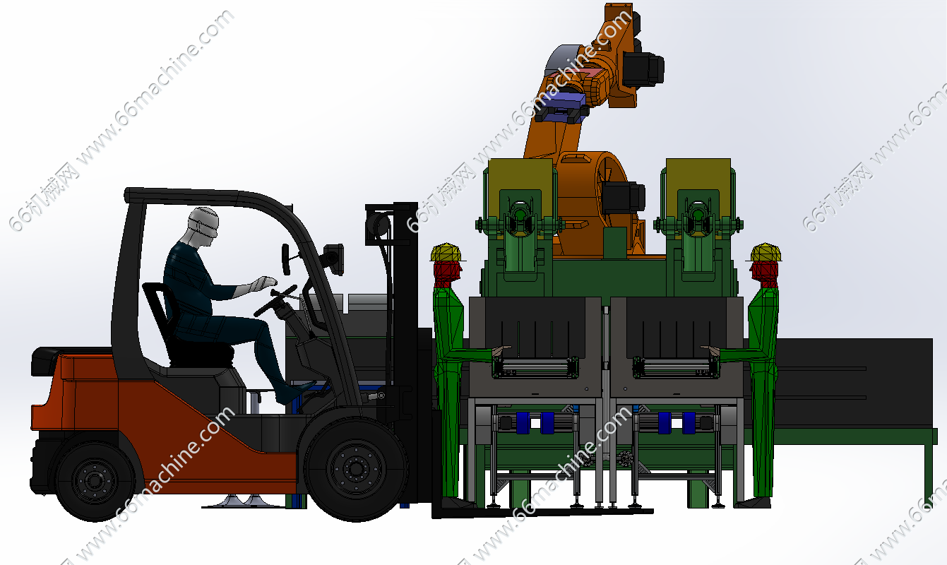 本模型为基于机器人的工件装卸系统,应用于重型机械制造的仓储物流场景。叉车与机器人配合,将大型工件从输送线转运至加工区或仓储区,工作人员完成工件的预处理工序,实现重型工件从装卸、流转到初步加工的高效协同,保障大重量工件的物流运转效率。