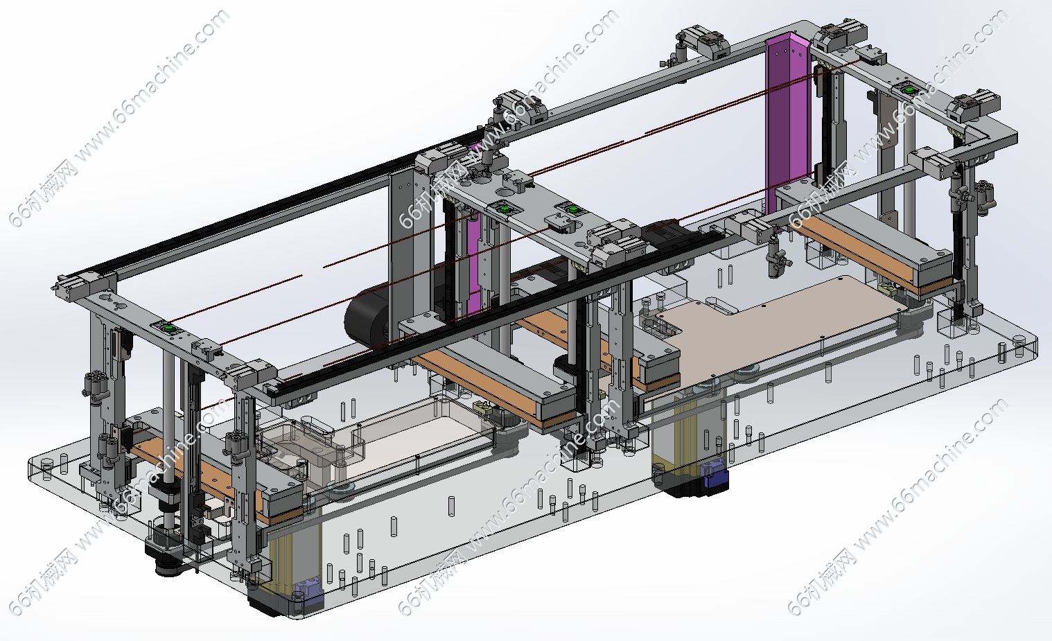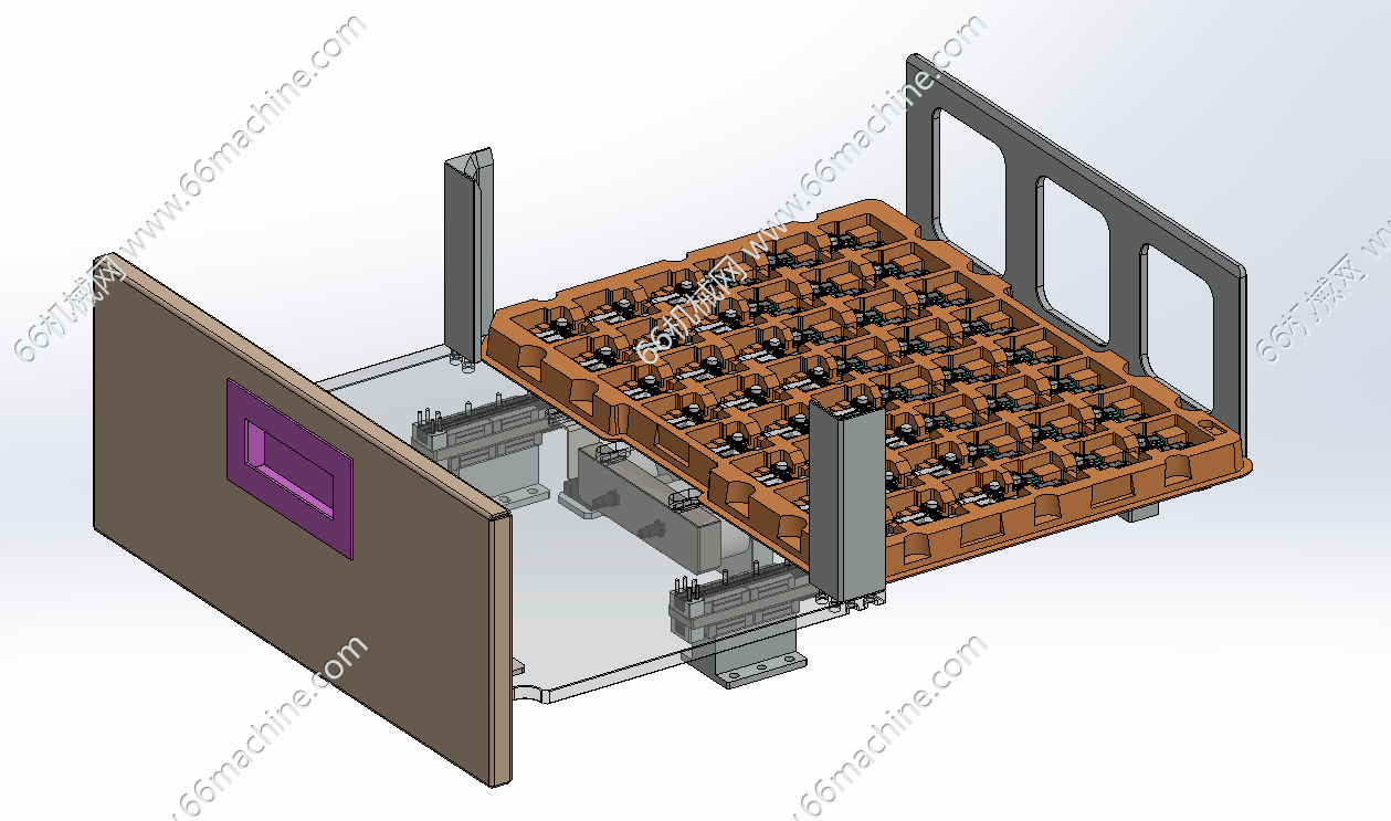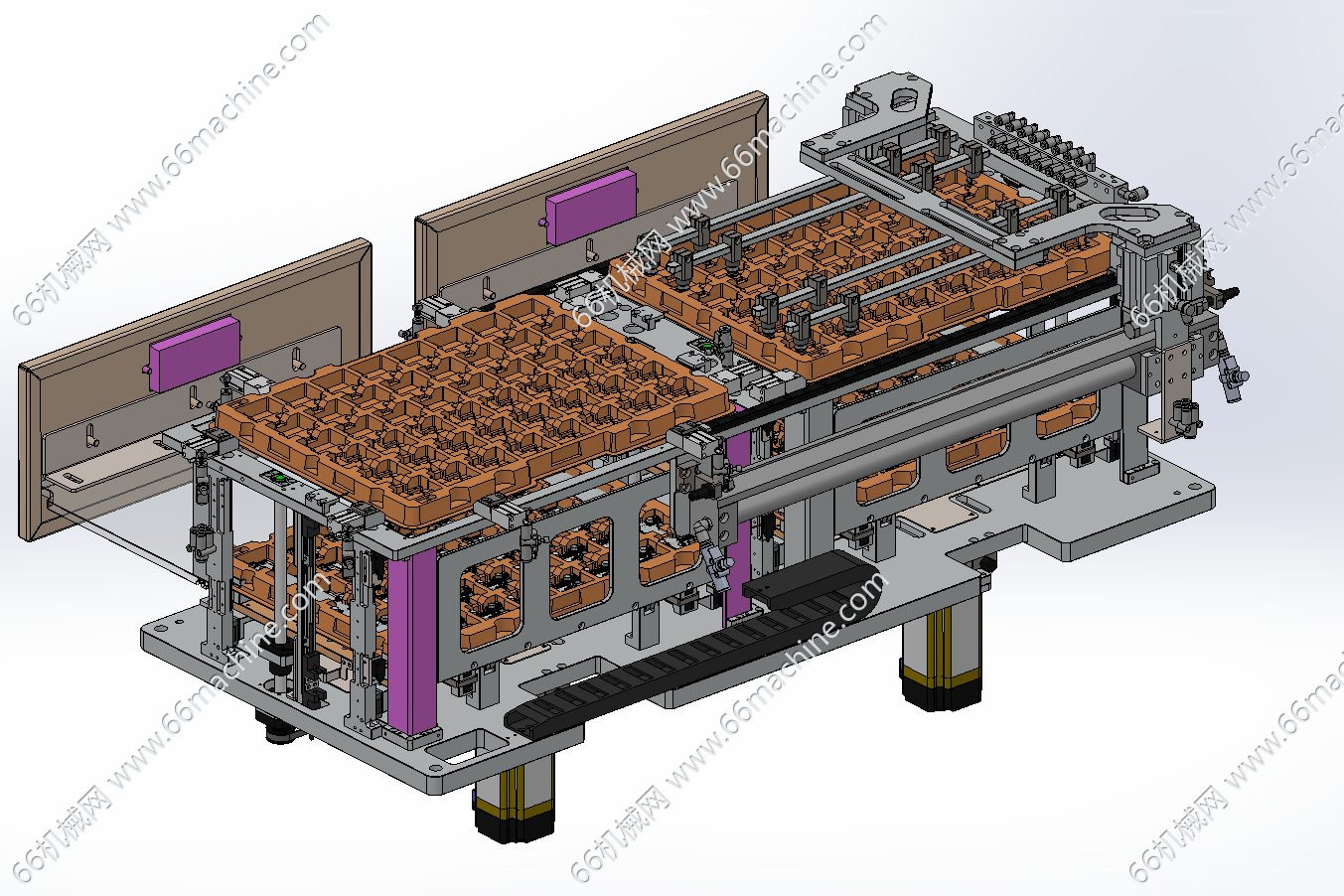 本模型为抽屉式料仓上料机构,主要由料盘提升组件、料盘吸取移栽机构及抽屉料仓组成,一边满载托盘上料,另一边下空托盘,实现取料完的空托盘自动堆料!
