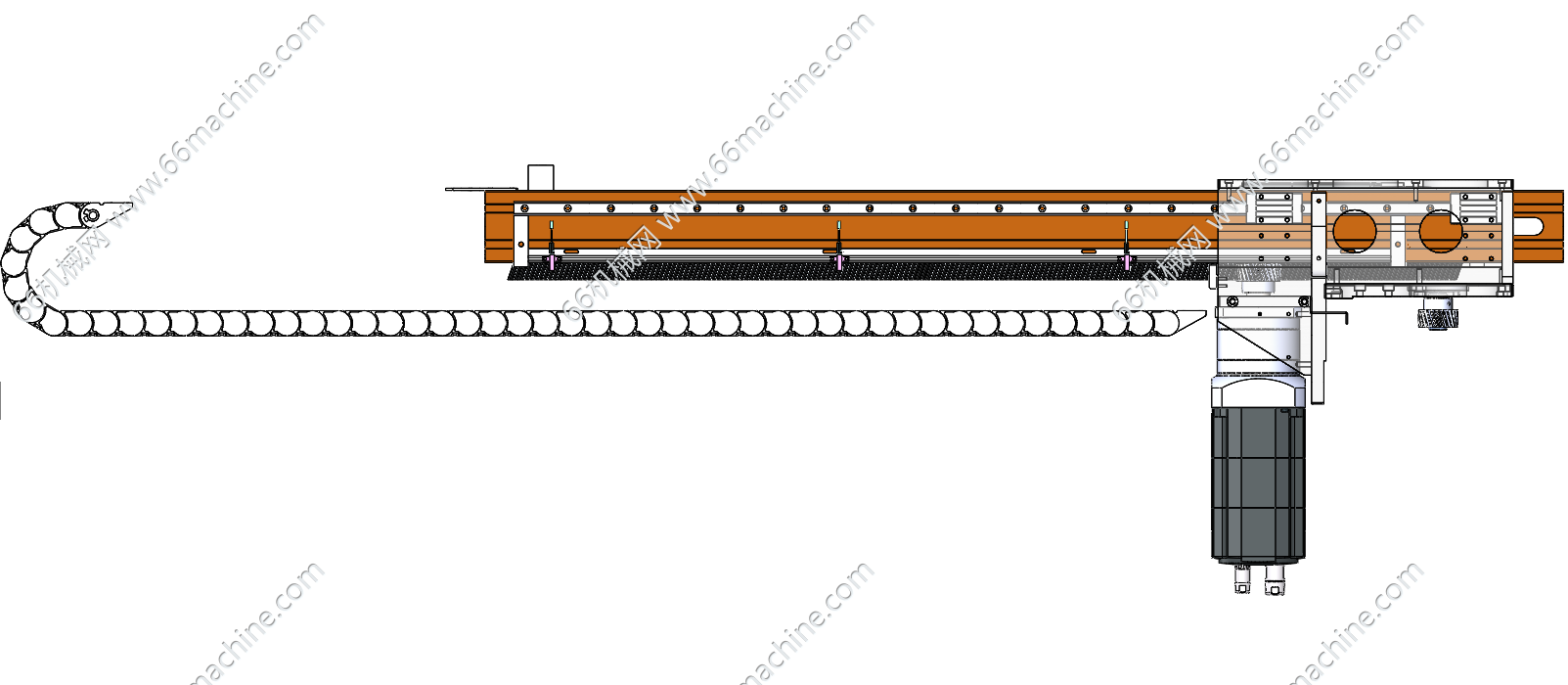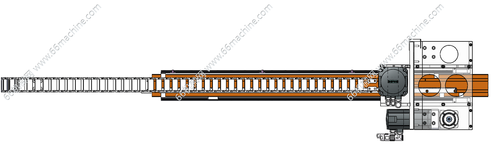 本模型为齿轮齿条传动机构,伺服电机驱动小齿轮旋转,通过齿轮与齿条的啮合,将电机的旋转运动转化为直线运动,适配自动化产线、机床上下料、码垛机器人等场景。