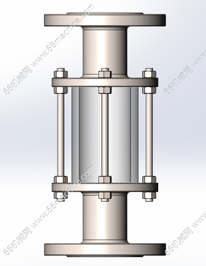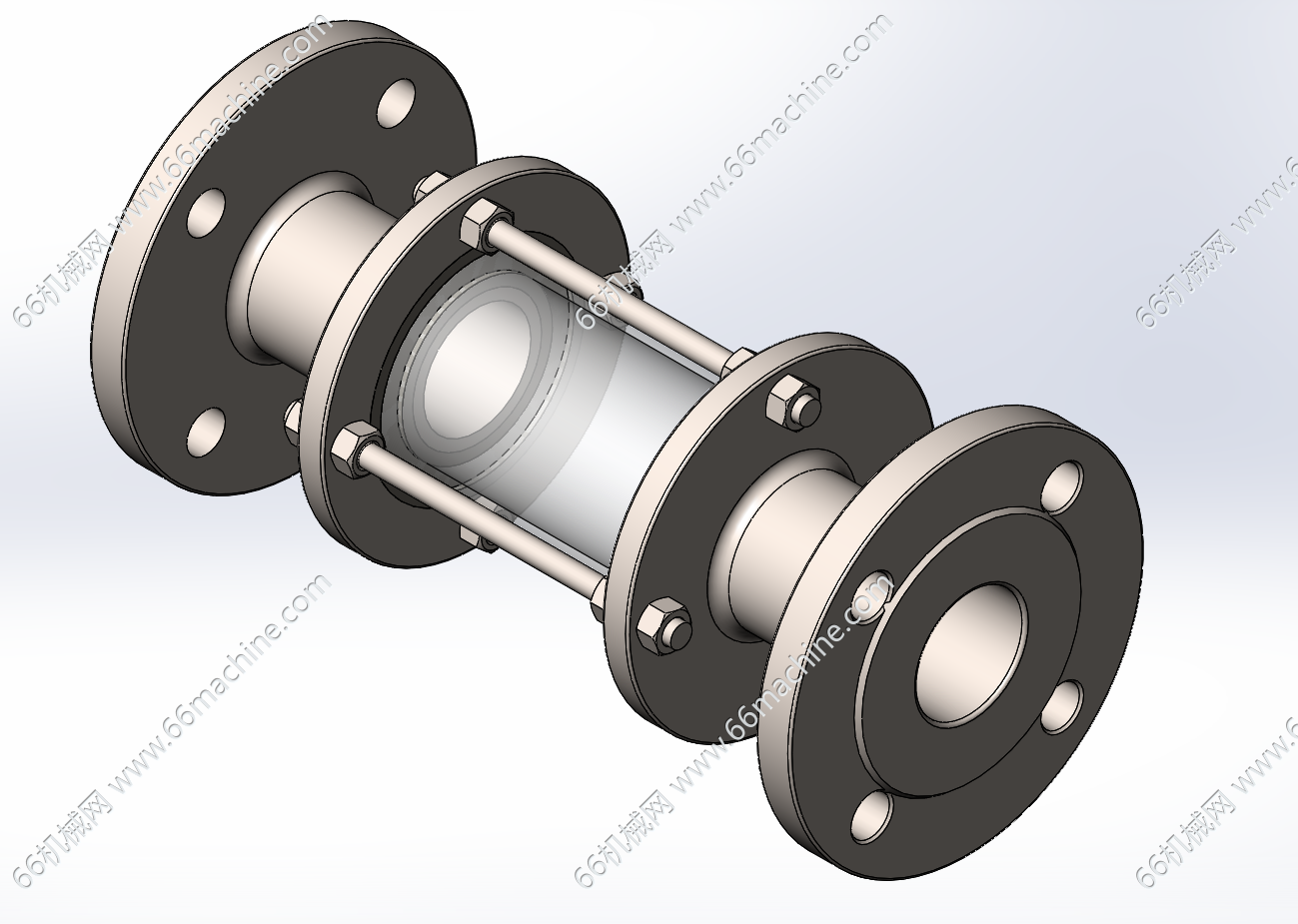 本模型为带视镜的管道法兰,又称法兰视盅,是一种工业管道的主要装置之一,其主要作用为随时查看管道中的介质流动以及反映情况,起到监视、避免事故发生的作用。由视镜玻璃、法兰、密封垫、螺杆螺母柱等组成。